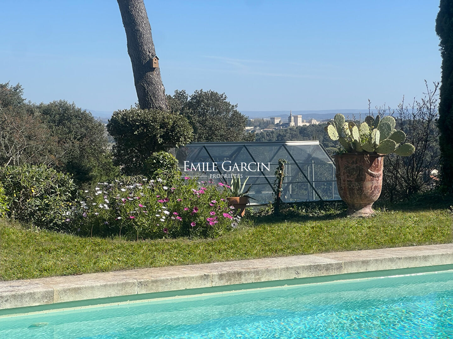 Overlooking Villeneuve-Lès-Avignon, this stone property offers a remarkable panoramic view, from Fort Saint-André to the Palais des Papes. A real living open-air painting.