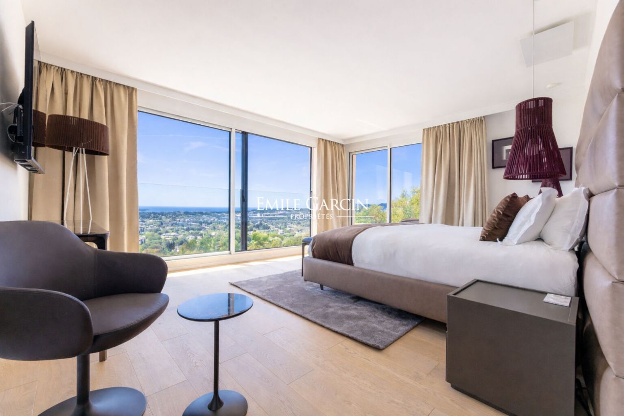 Located just a few hundred meters from the historic village of Mougins, this stunning contemporary villa with panoramic sea views offers an exceptional setting for a luxury stay on the French Riviera.