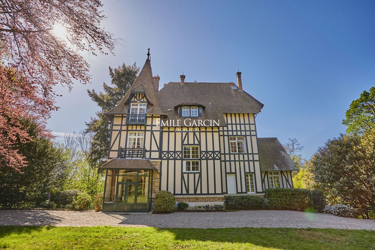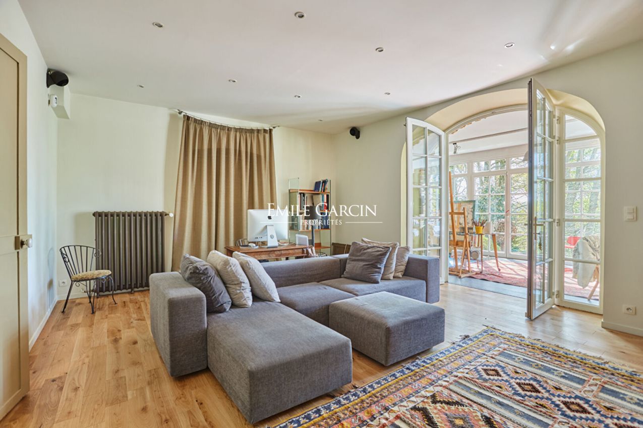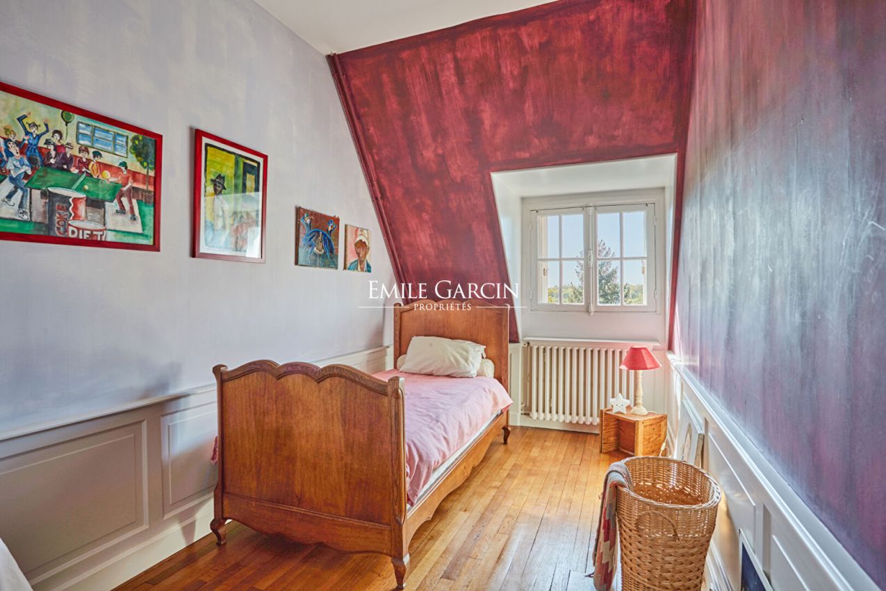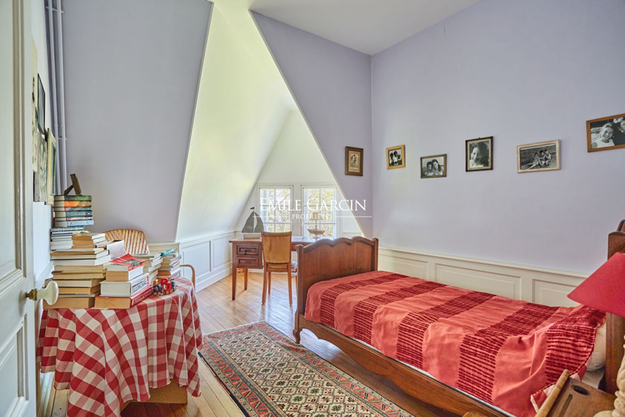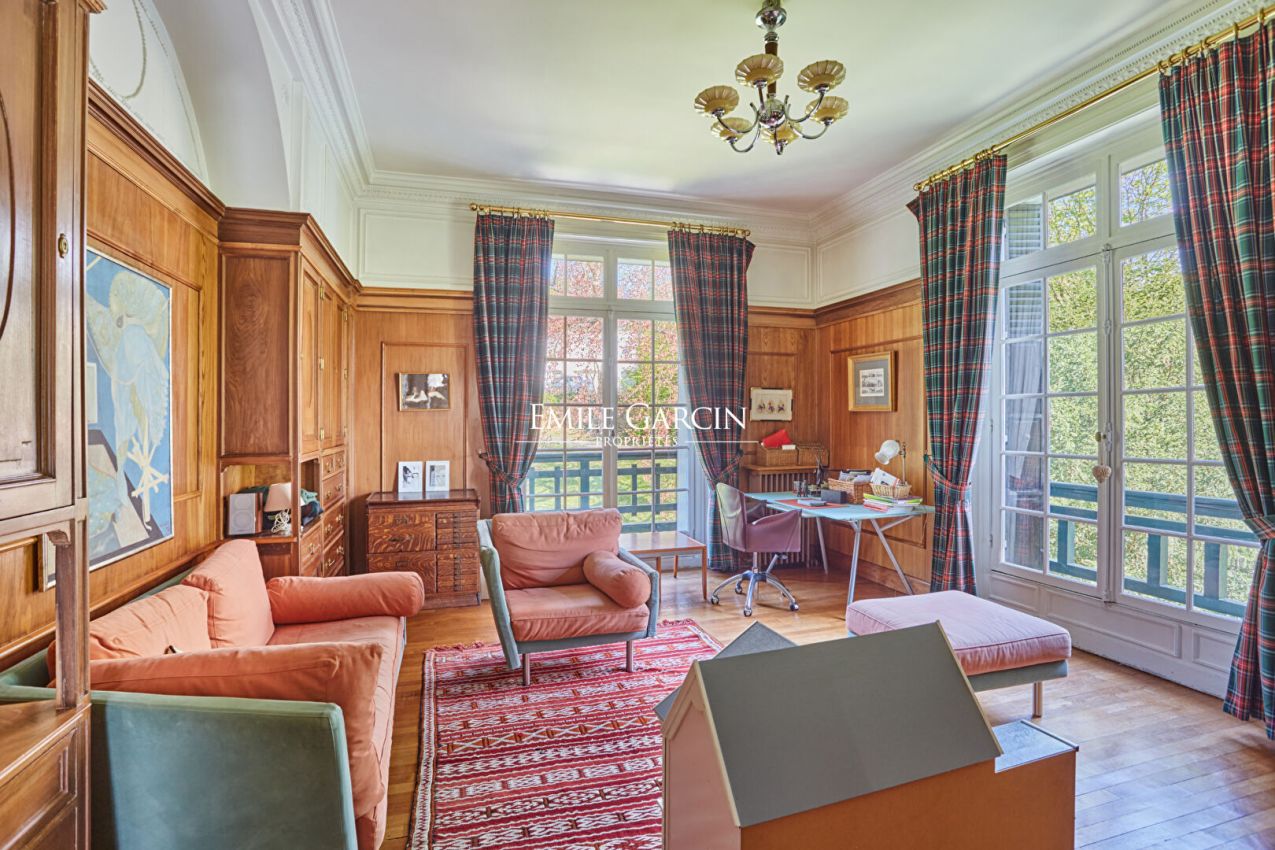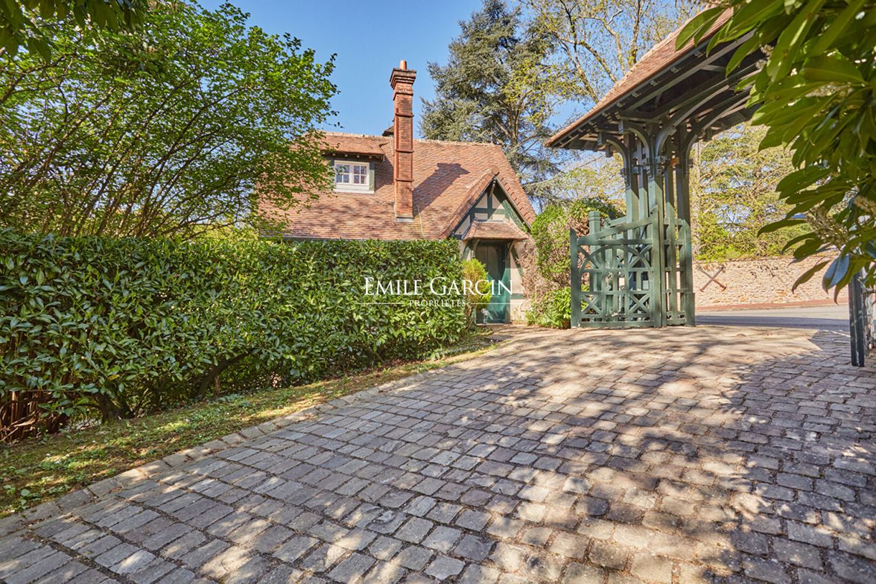 Located in the highly sought-after Metz district of Jouy-en-Josas, "La Châtaigneraie" is a characterful residence built in 1912 and sitting on over 7,000 sq.m of landscaped grounds planted with majestic chestnut trees. Inspired by Anglo-Norman architecture, the property presents approximately 534 sq.m of living area. From the moment you enter, it stands out for its timeless elegance: its half-timbered facade, pitched roof, dormer windows with mullions and period materials lend the interior a sense of authentic and rare charm. The generously sized rooms and wealth of period features reflect the refinement of the grand residences typical of the early 20th century. A grand entrance hall with solid oak staircase leads to a living room and dining room with high ceilings, herringbone parquet flooring, fireplaces, carved woodwork and large windows, which in turn back onto a south-facing terrace with commanding views of the grounds. The house has seven bedrooms spread over two levels, including a master suite with a balcony and a 1900s-style bathroom, as well as several additional bathrooms and storage spaces. The attic of approximately 120 sq.m, offers plenty of potential for conversion (additional bedrooms, a studio, a recreation area). The garden level features a separate area with exceptional amenities: a light-filled artist's studio, a living room, a bedroom and a wellness area with a stone spa and direct access to the terrace and swimming pool. Additional facilities include a caretaker's lodge of approximately 100 sq.m and a two-car garage. Located a few minutes' walk from the town centre and the train station (with connections to Versailles and Paris), this property presents a unique blend of historic character, a family environment and a privileged natural setting.