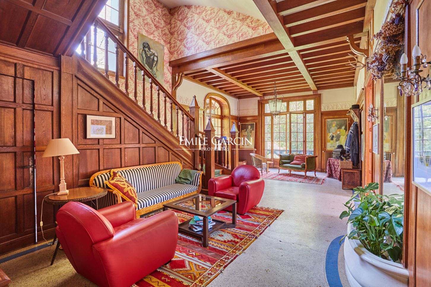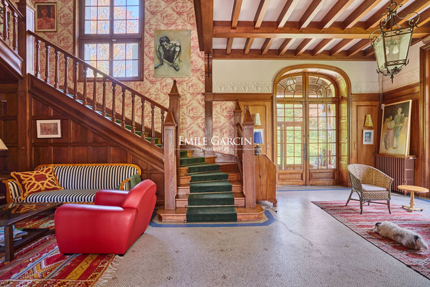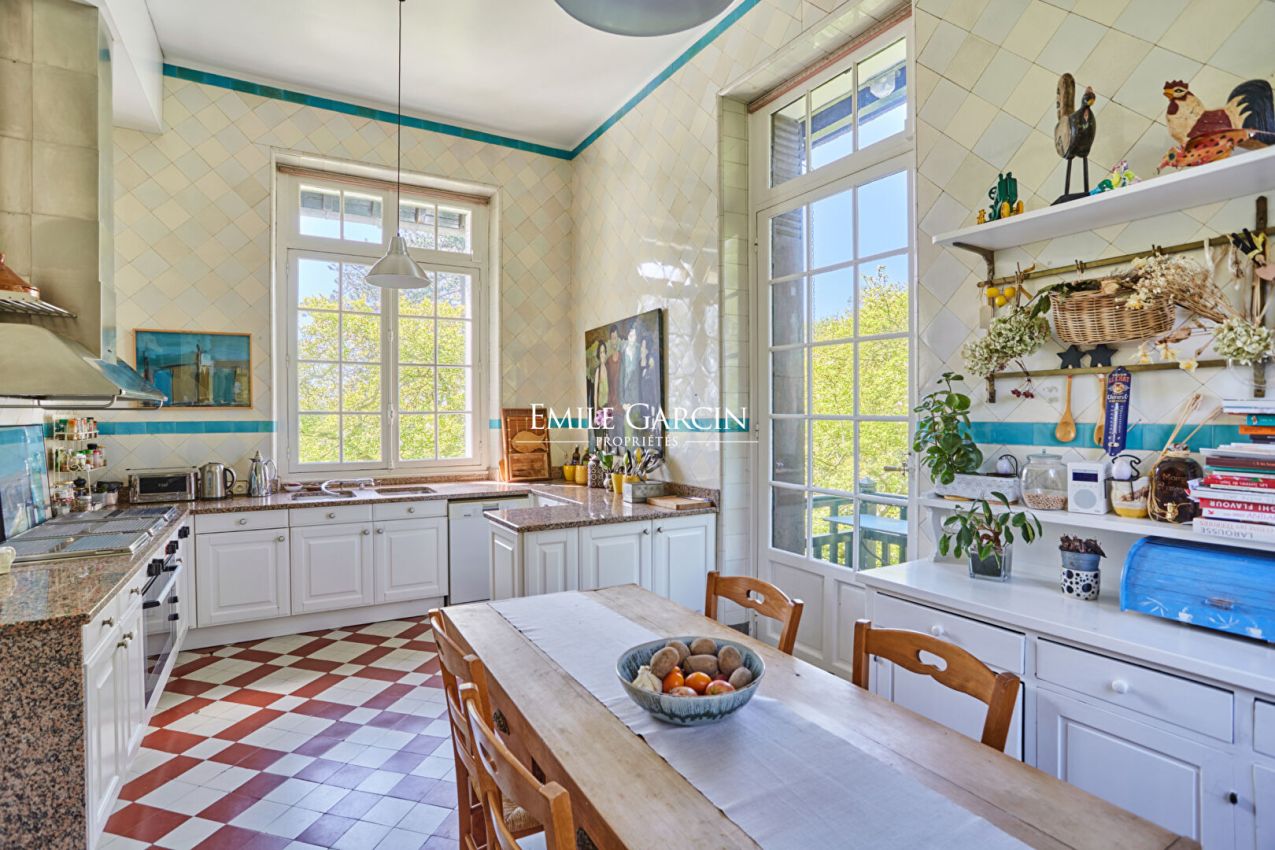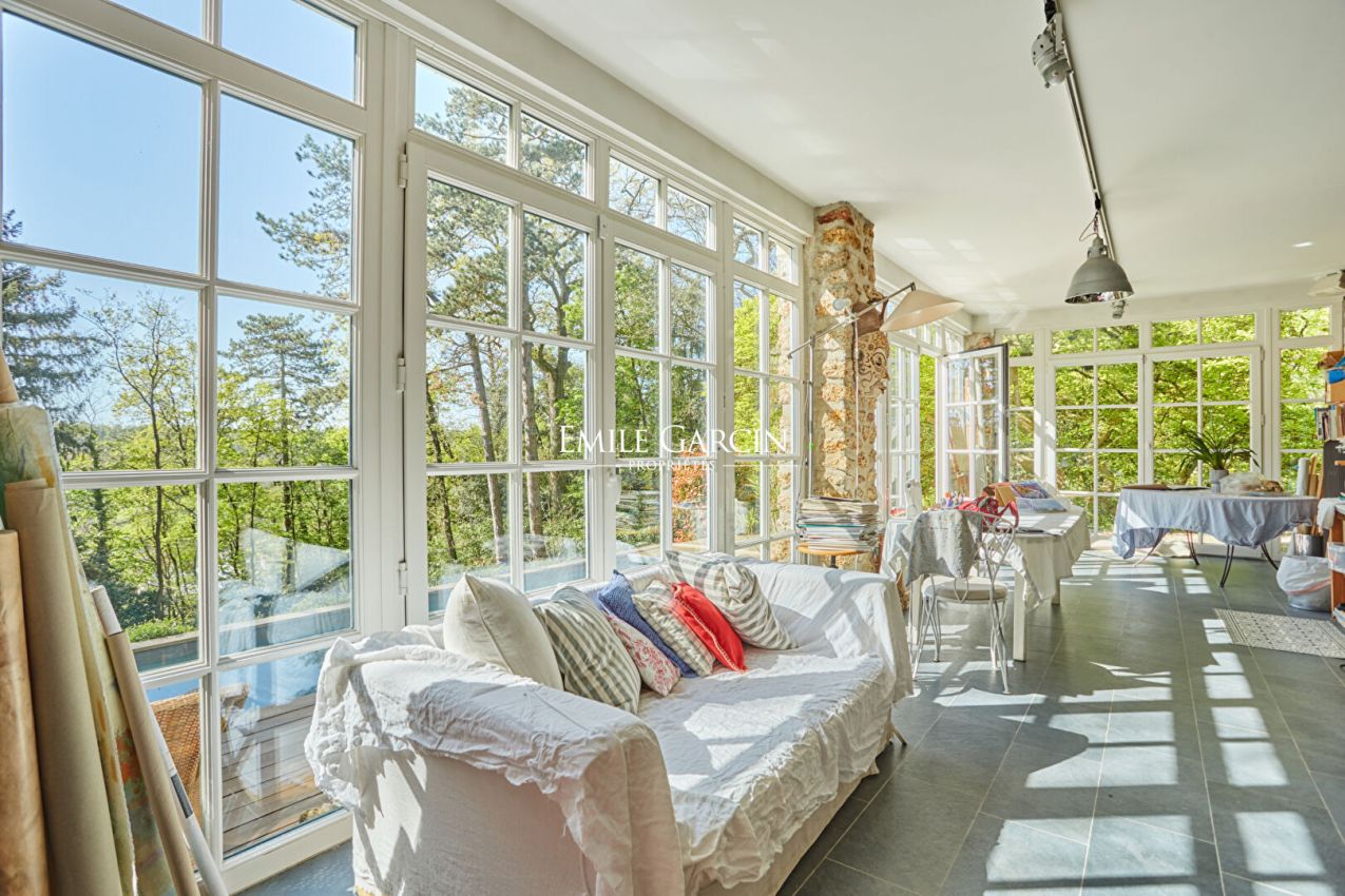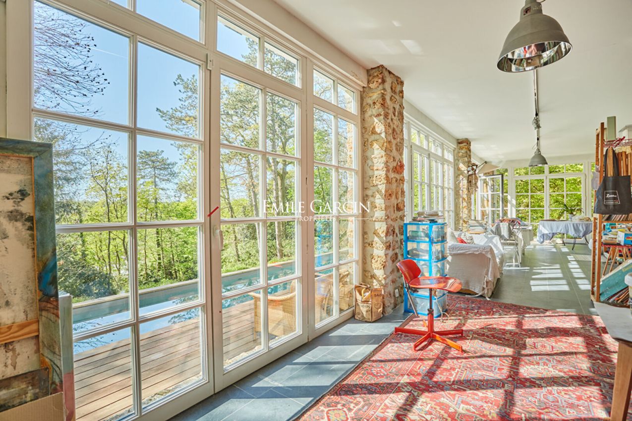 Located in the highly sought-after Metz district of Jouy-en-Josas, "La Châtaigneraie" is a characterful residence built in 1912 and sitting on over 7,000 sq.m of landscaped grounds planted with majestic chestnut trees. Inspired by Anglo-Norman architecture, the property presents approximately 534 sq.m of living area. From the moment you enter, it stands out for its timeless elegance: its half-timbered facade, pitched roof, dormer windows with mullions and period materials lend the interior a sense of authentic and rare charm. The generously sized rooms and wealth of period features reflect the refinement of the grand residences typical of the early 20th century. A grand entrance hall with solid oak staircase leads to a living room and dining room with high ceilings, herringbone parquet flooring, fireplaces, carved woodwork and large windows, which in turn back onto a south-facing terrace with commanding views of the grounds. The house has seven bedrooms spread over two levels, including a master suite with a balcony and a 1900s-style bathroom, as well as several additional bathrooms and storage spaces. The attic of approximately 120 sq.m, offers plenty of potential for conversion (additional bedrooms, a studio, a recreation area). The garden level features a separate area with exceptional amenities: a light-filled artist's studio, a living room, a bedroom and a wellness area with a stone spa and direct access to the terrace and swimming pool. Additional facilities include a caretaker's lodge of approximately 100 sq.m and a two-car garage. Located a few minutes' walk from the town centre and the train station (with connections to Versailles and Paris), this property presents a unique blend of historic character, a family environment and a privileged natural setting.