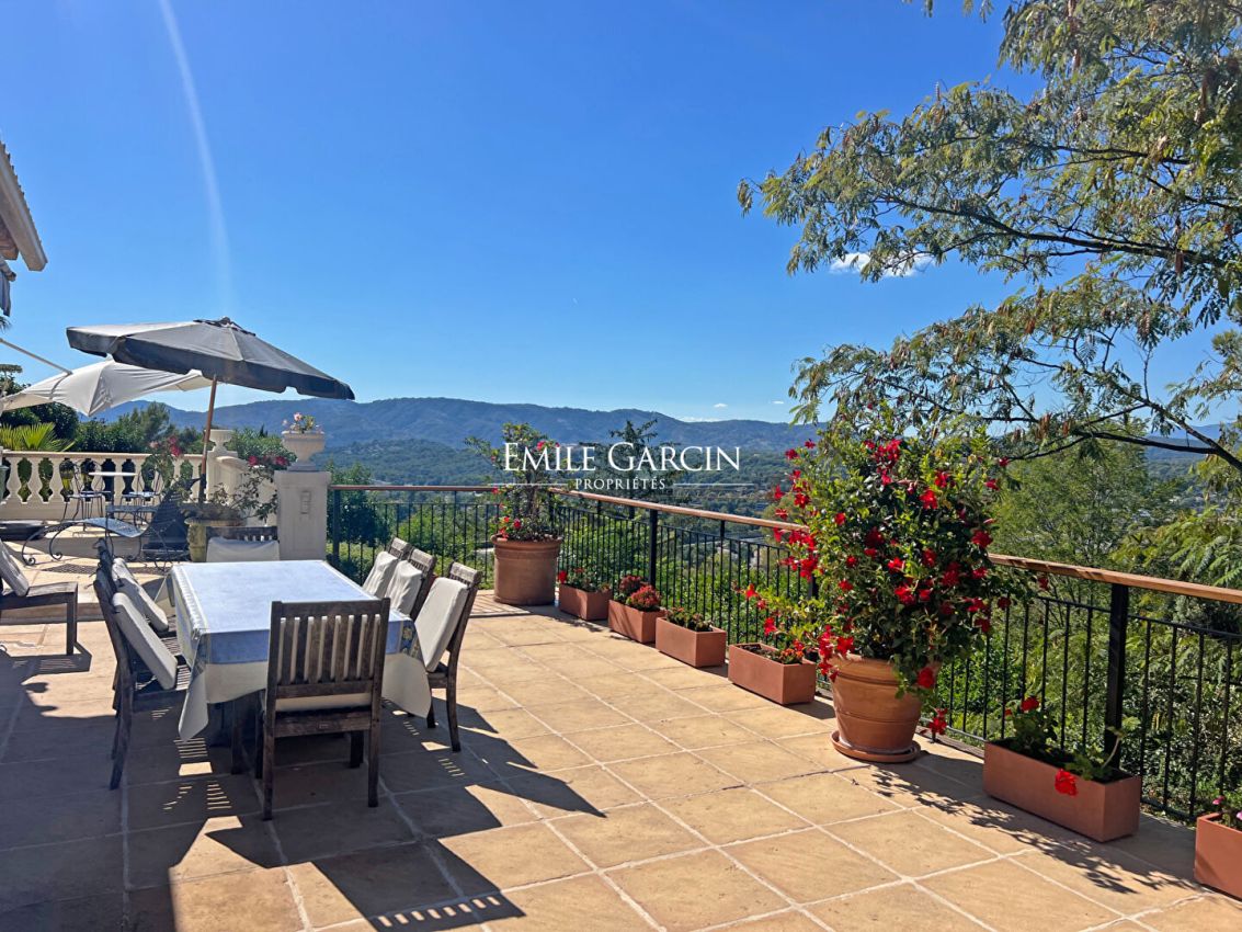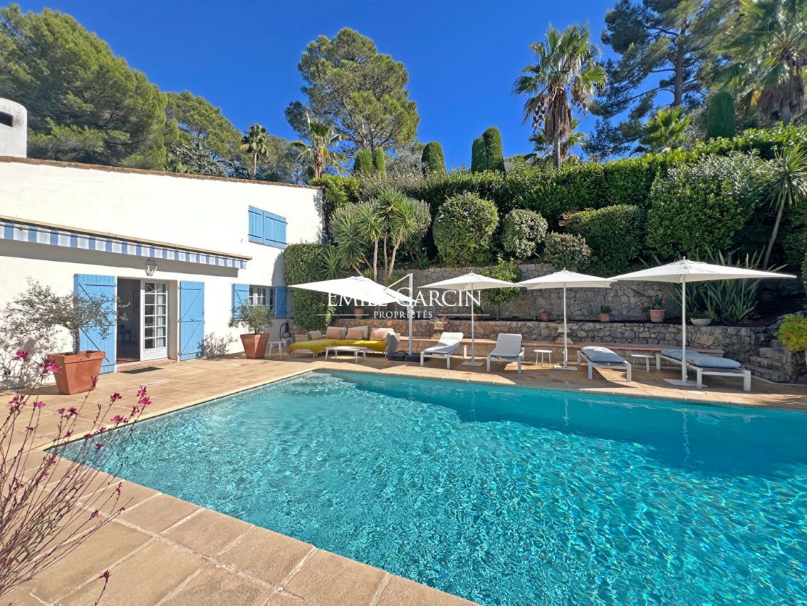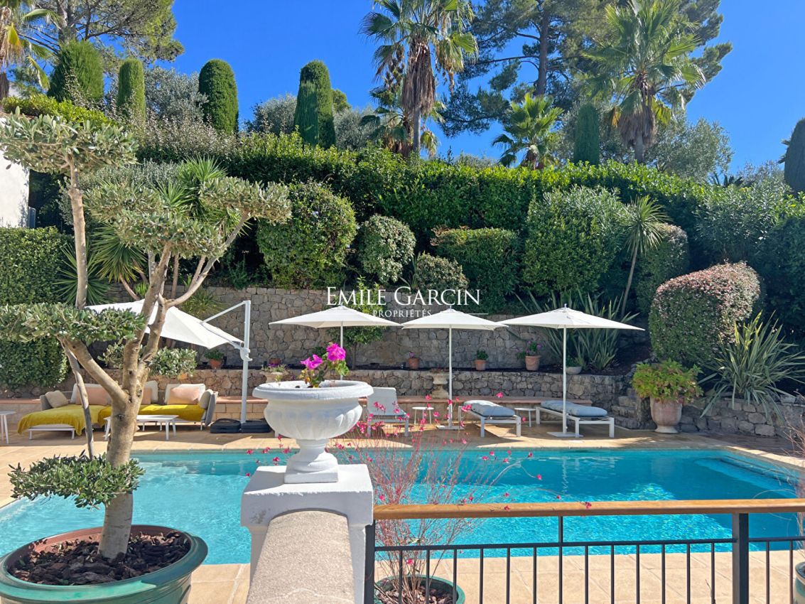 Peacefully tucked away in a sought-after residential area of ??Mougins, this Provençal villa offers the perfect blend of refinement and tranquility. Located 5 minutes from charming Mougins and all its village amenities, this bright property sits on 2,471 sq.m of perfectly maintained landscaped grounds. Those grounds include a charming garden adorned with a wide variety of trees, Mediterranean vegetation, plants and flowers, creating a soothing and natural atmosphere. The spacious terraces surrounding the beautiful swimming pool are the perfect setting in which to enjoy relaxing moments and beautiful sunsets among friends or family. Presenting ??approximately 305 sq.m of living area spread over three levels, this west-facing Provençal villa enjoys a quiet and private setting with commanding panoramic views. -Upstairs: two ensuite bedrooms with a large dressing room; -On the ground floor: a large, bright living room with fireplace backing onto the terrace and swimming pool, a dining room, an office and a fully equipped kitchen; -On the garden level: two additional bedrooms backing onto the garden, a utility room, plus an independent studio including living room, kitchenette, shower room and hammam. Absolute privacy in one of the most prestigious areas of Mougins. Ideal for use as a family residence or second home.