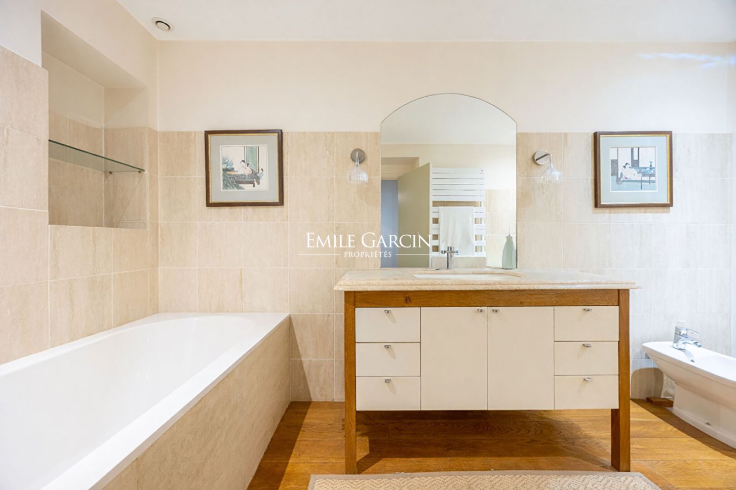 The sleeping area comprises three bedrooms and two bathrooms, including a majestic master suite with a dressing room and direct access to the garden, ensuring peaceful mornings.