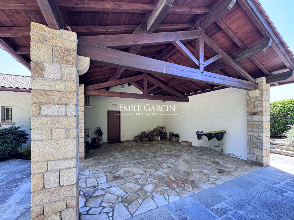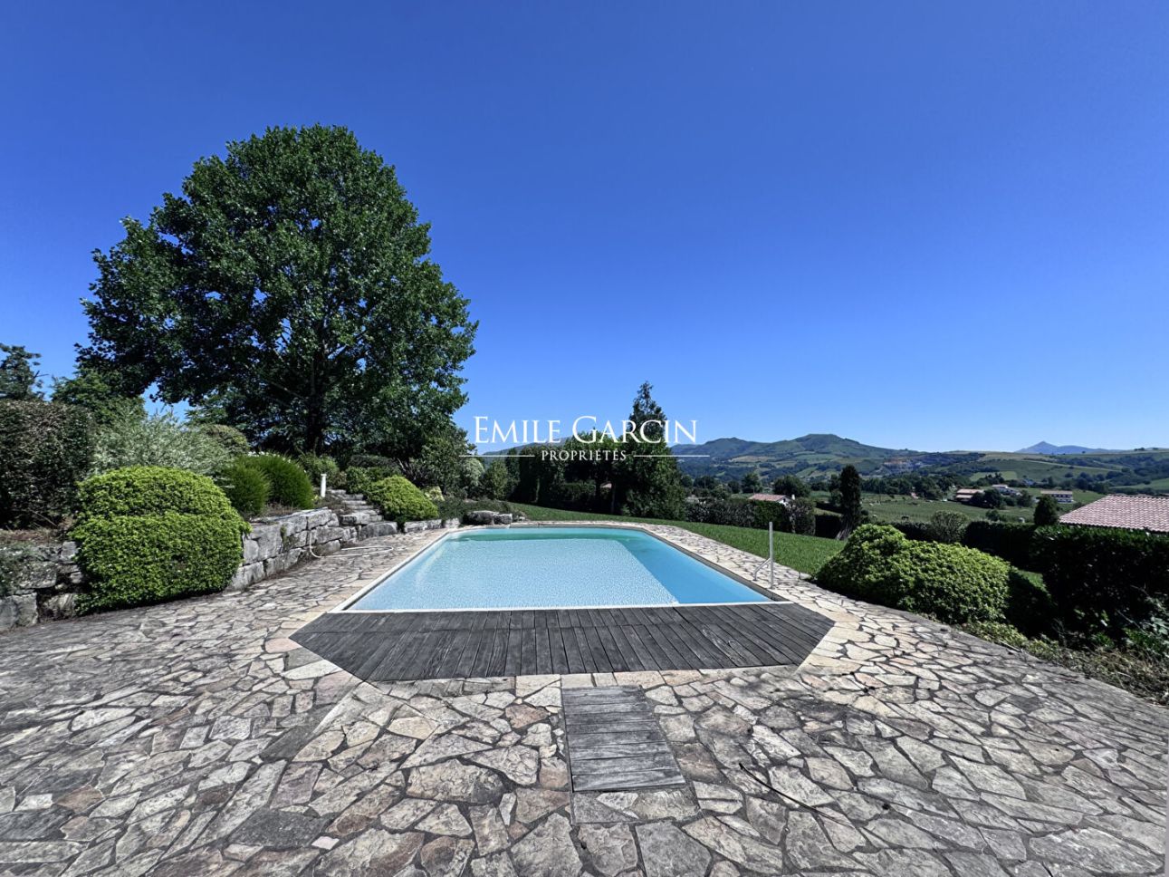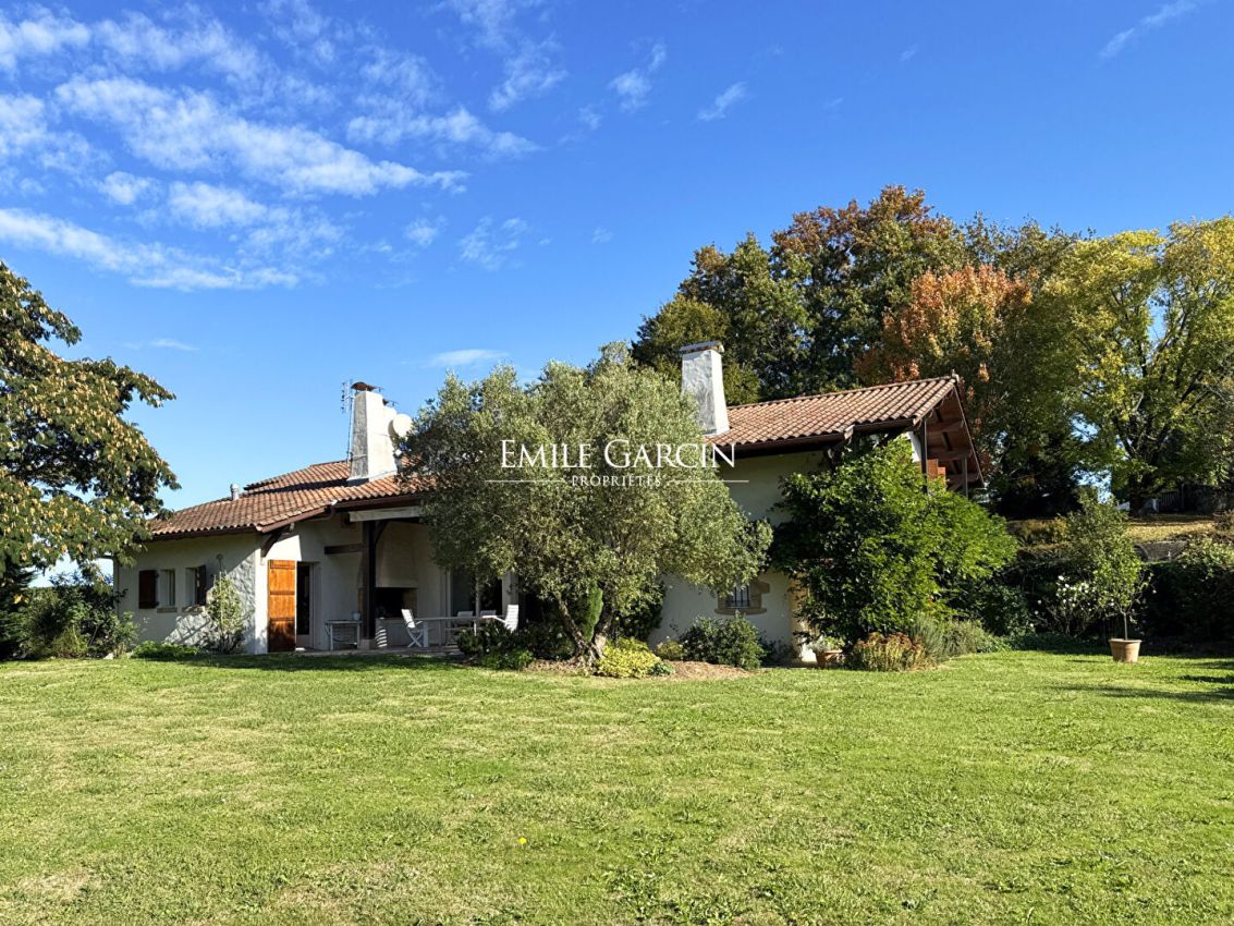 Surrounded by nature, in a green setting in the heart of the Basque countryside, this property boasts a rare location, with spectacular views of the surrounding mountains, including the Rhune. Only a few minutes from the region's authentic villages, it combines absolute calm, privacy, and natural beauty. Behind a discreet gate, a private driveway leads to this vast property, fully fenced and harmoniously integrated into its environment. The exterior, carefully landscaped, is structured around a large flowered and wooded garden, where the seasons unfold their palette of colors. The house, with its unique architecture, seduces with its play of split levels that structures the volumes with elegance and originality. The entrance opens onto a landing distributing both the living room, the kitchen, a suite with shower room and bathroom and a laundry room on the garden level; 2 bedrooms on the ground floor and a relaxation area as well as a suite via the mezzanine. On the garden level, the living room opens directly onto a covered terrace facing the mountains. It consists of a large double reception room with a warm atmosphere, incorporating an office and library space with openings to the outside. In its extension, a suite with bathroom and shower room is discreetly accessible from the library. The spacious and welcoming kitchen-diner also opens onto the garden and communicates with a laundry room, leading to the carport. The whole is enhanced by a wooden staircase, a true centerpiece, which underlines the timeless charm of the house. On the half-landing, ground floor level, there is access on one side to two bedrooms opening onto a continuous balcony, accompanied by a separate shower room. On the other side, a mezzanine converted into a relaxation and office area leads to a large suite with its own shower room. Slightly below the house, the generously sized swimming pool is surrounded by a solarium and vegetation, facing an exceptional panorama of the Basque peaks. A true haven of peace in all seasons. A garden shed completes the outdoor features. A parking space, as well as a large carport integrated into the architecture of the house, accommodate vehicles in shelter. Authenticity, generous volumes, preserved environment, and breathtaking views characterize this property. An ideal place for lovers of nature and charm, seeking a peaceful and inspiring living environment, in one of the most beautiful regions of the Basque Country.