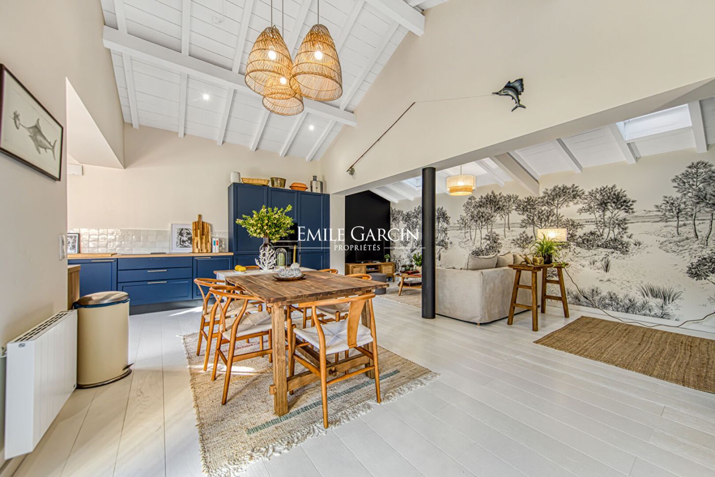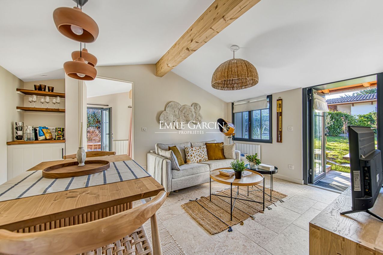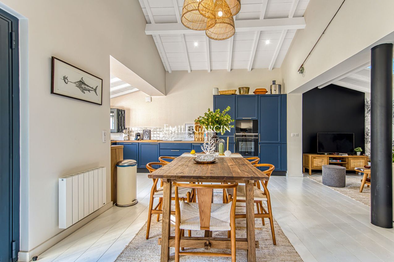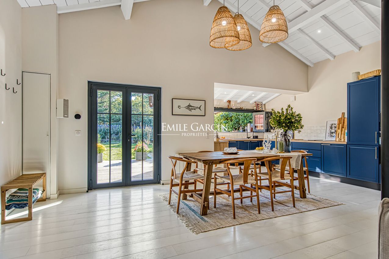 Located in unspoiled surroundings in the heart of Cap Ferret, just a short walk from Horizon Beach, this unique property presents a harmonious blend of nature and local architectural traditions. It presents approximately 135 sq.m of living area on 535 sq.m of landscaped grounds. This southwest-facing property offers a veritable a veritable oasis of calm with an interior design based around the principles of Feng Shui. The property comprises three cabins inspired by the Cap Ferret, which have been fully restored with high-end materials and meticulous attention to detail. The main house features an entrance leading to a spacious reception area with high ceilings and an open kitchen equipped with top-of-the-range appliances, as well as a bedroom and an elegant bathroom. The two other cabins offer an independent suite and two additional bedrooms, as well as a private terrace. Overall, the property comprises four bedrooms, two bathrooms with premium finishes, modern heating, private indoor parking and groundwork for the installation of an outdoor hot tub. It is available fully furnished, with carefully selected indoor and outdoor furniture. This property tells a story: designed for experiencing Cap Ferret to the fullest in unspoiled green surroundings, it is a rare gem that seamlessly blends charm, character and elegance.