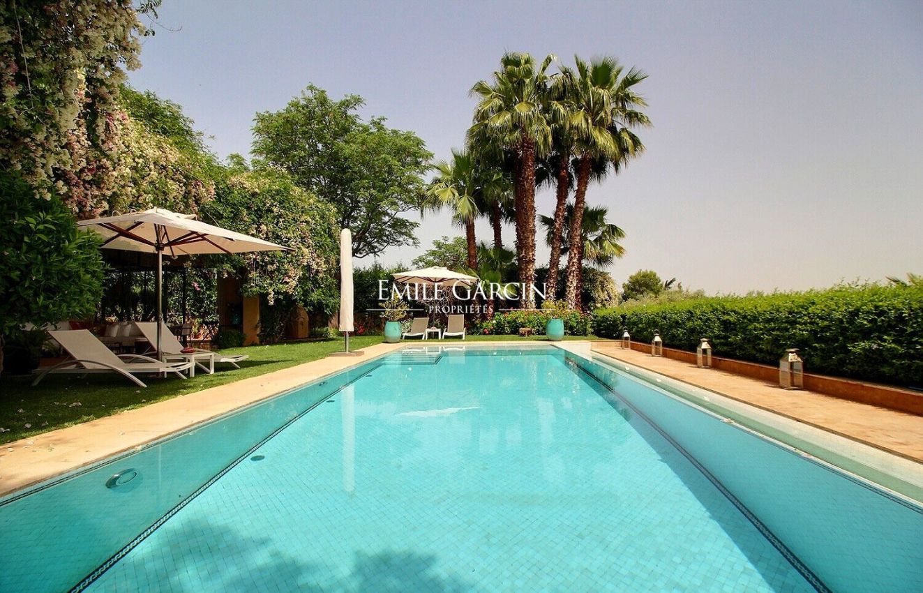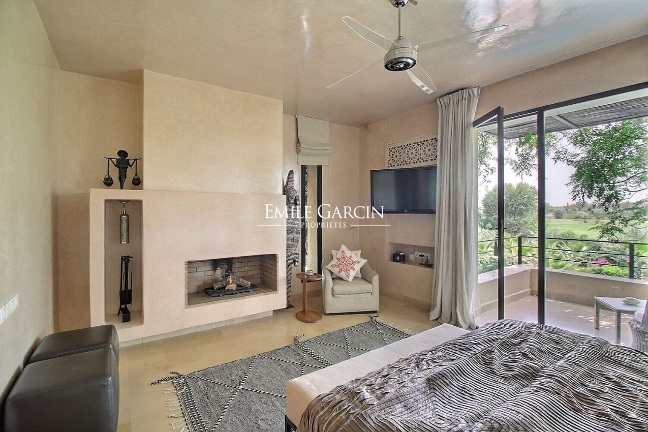 This stunning property is located just minutes from the centre of Marrakech, on one of the area's most prestigious golf courses. South-facing and offering breathtaking views of the Atlas Mountains, the property comprises a villa of 770 sq.m, 1230 sq.m of beautifully landscaped grounds, plus an additional 1000 sq.m of land. The ground floor presents a large reception room with a fireplace, a dining room backing onto the garden and a heated infinity pool, a fully equipped kitchen, a suite with a dressing room and bathroom, and a large vegetable garden. Upstairs, there are three bedrooms including a 60-sq.m master suite. Each bedroom has its own private terrace offering magnificent views of the golf course and the Atlas Mountains. The basement is equipped with a spa area including a massage room and hammam. Additional facilities include a gated parking area with space for three cars, a utility room and a staff apartment.