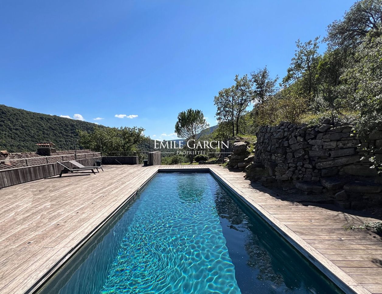 Located in an authentic village, this 20 hectare property is nestled in the heart of unspoiled nature, with a breathtaking view of the Cévennes. Close to all amenities, this old stone hermitage, enlarged by a wooden extension, has been completely renovated with care, combining the charm of the old and contemporary lines. This magnificent house includes 4 spacious bedrooms, a comfortable living room and a bright kitchen-living room. Various terraces. 14 meter swimming lane, with a spectacular view of the Cévennes.