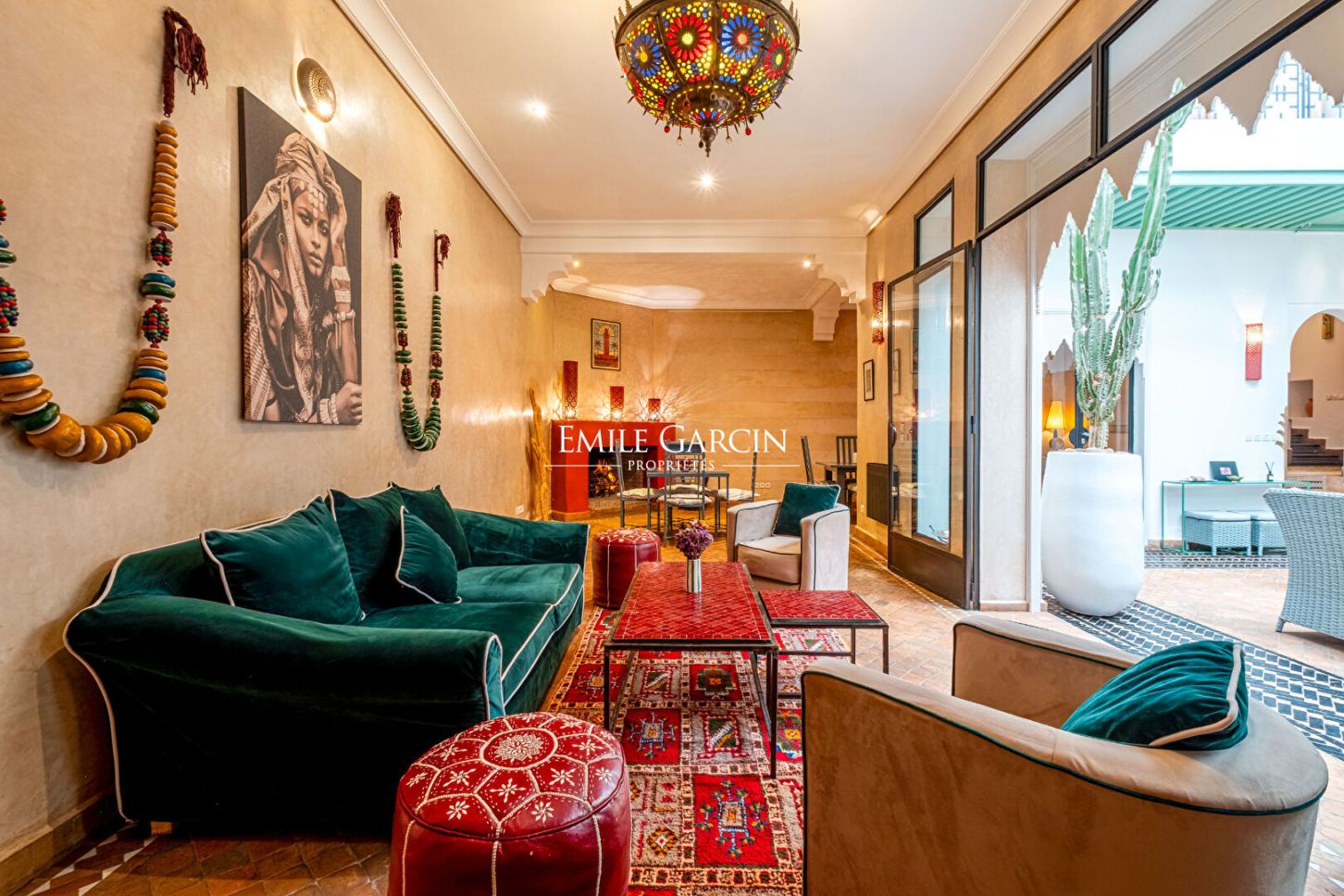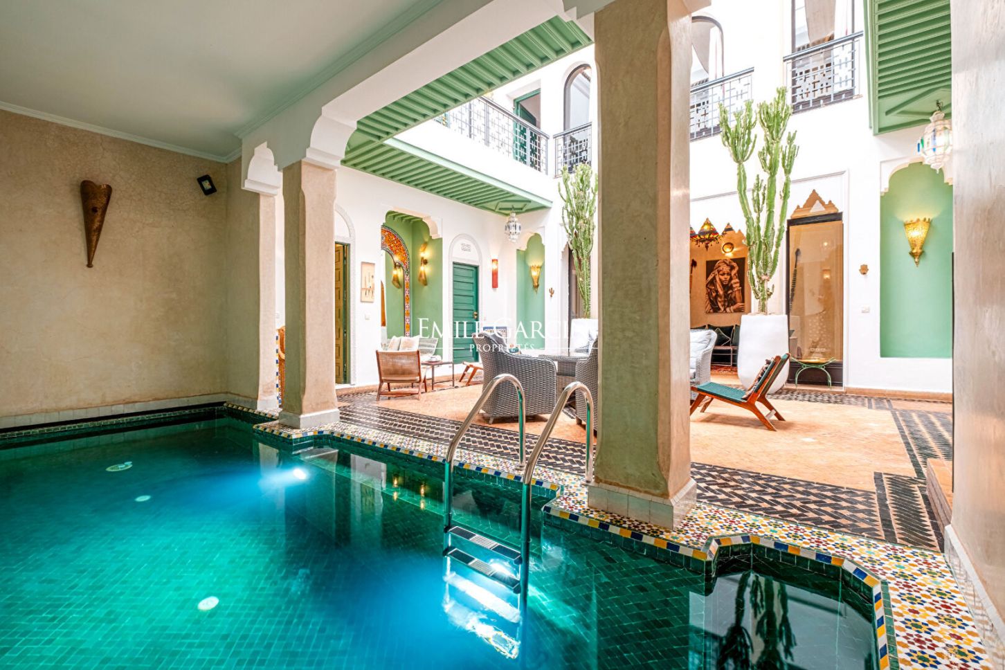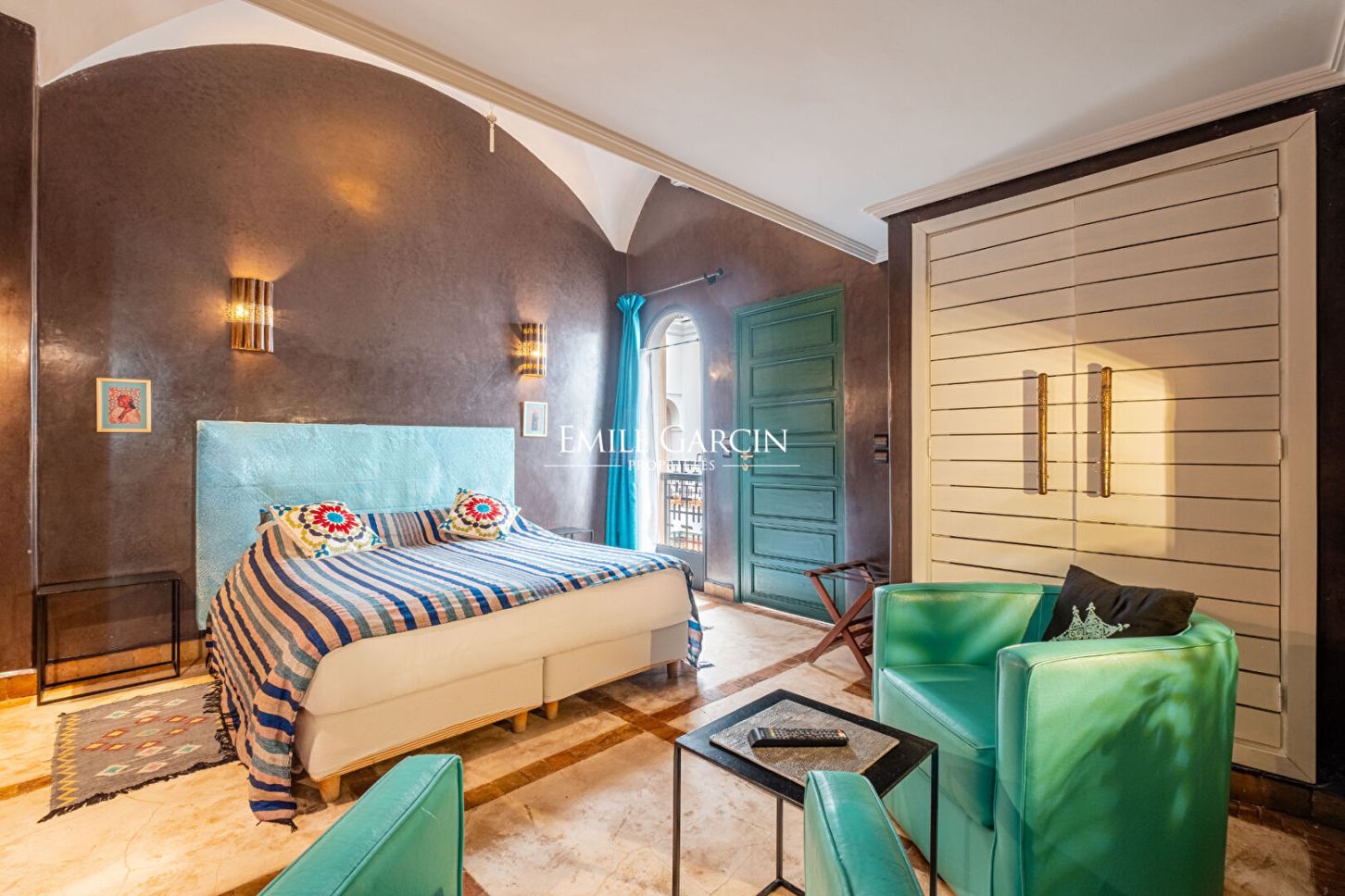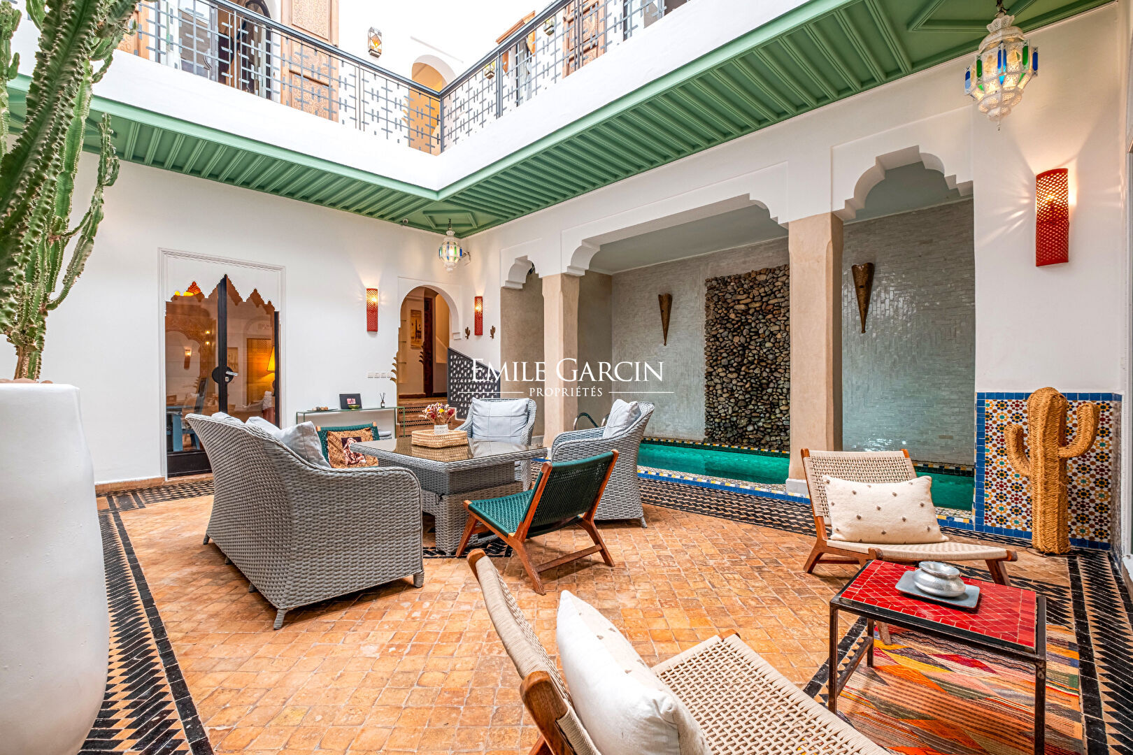 Located in one of the most vibrant and iconic neighbourhoods of the medina, this riad presents 320 sq.m of living area on a footprint of 187 sq.m. It comprises a large and beautifully landscaped patio featuring a heated swimming pool equipped with a retractable roof, a spacious living room, a dining room with fireplace, a fully equipped kitchen, six beautiful ensuite bedrooms, a hammam and a large furnished terrace with hot tub, relaxation area, dining area and cooking facilities. In perfect condition throughout, this riad represents an excellent opportunity for anyone looking either to buy a family home or run a guest house for holidaymakers. Its modern facilities include reversible air conditioning, solar panels, a gas-powered hammam and a heat pump for the pool.