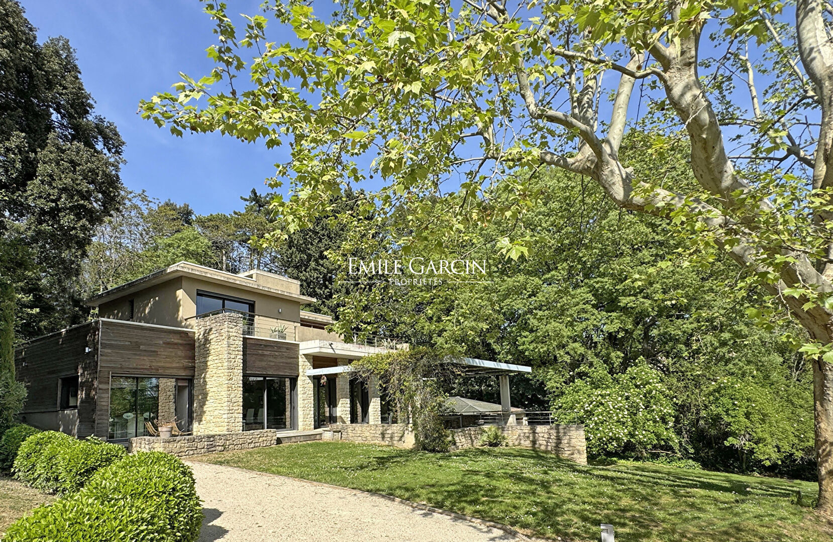 Tucked away in a sought-after and peaceful setting, this contemporary designer property offers breathtaking views of the Rhône Valley and Avignon. Facing southwest, the house stands out for its bright airy rooms, its large windows and the way it seamlessly blends in with its landscaped grounds. The garden level features a spacious open-plan living area with fully equipped kitchen and central island, and a living room and dining room separated by a central fireplace, all backing onto a large terrace and the garden. Additional facilities on this floor include a laundry room, a utility room (which could be converted into a summer kitchen) and a bedroom with ensuite shower room. A cellar is located in the basement. A mezzanine level overlooks the living room and leads to a bedroom with ensuite bathroom and dressing room. Upstairs, you will find two suites with private terraces and a shower room / bathroom. A unique finishing touch is provided by a large veranda, used as an additional lounge area, which has been listed as a historical monument.