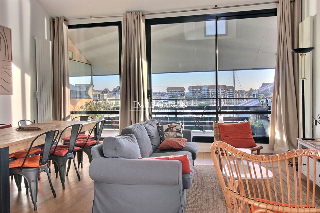 Located in the heart of Deauville Marina, in a secure residence within 10 minutes by foot of the train station, beach and town centre, Emile Garcin is delighted to present this beautiful triplex apartment of approximately 100 sq.m. Boasting views of the seafront and port, the property features a magnificent reception room with 5-metre high ceilings backing onto a lovely terrace. This bright apartment also offers 3 bedrooms and 2 bathrooms. It is sold with a covered parking space.