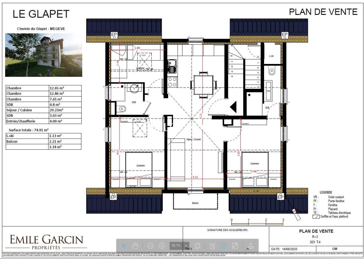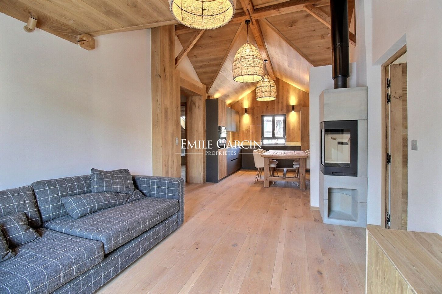 Perfectly located just a few minutes' walk from the pedestrian zone of Megève and a few minutes from the Chamois gondola lift, in a quiet setting by the stream. South-facing with views of the surrounding mountains. This apartment, located on the top floor of a recently renovated building, has a total surface area of 74.91 sqm, including 63 sqm of living space (Carrez Law). It comprises: an entrance hall, a cathedral-ceilinged living room with access to a balcony, open to a fully equipped kitchen, an en suite bedroom with shower, sink, and toilet, two further bedrooms, and a bathroom. The property is sold with a ski locker and an outdoor parking space.