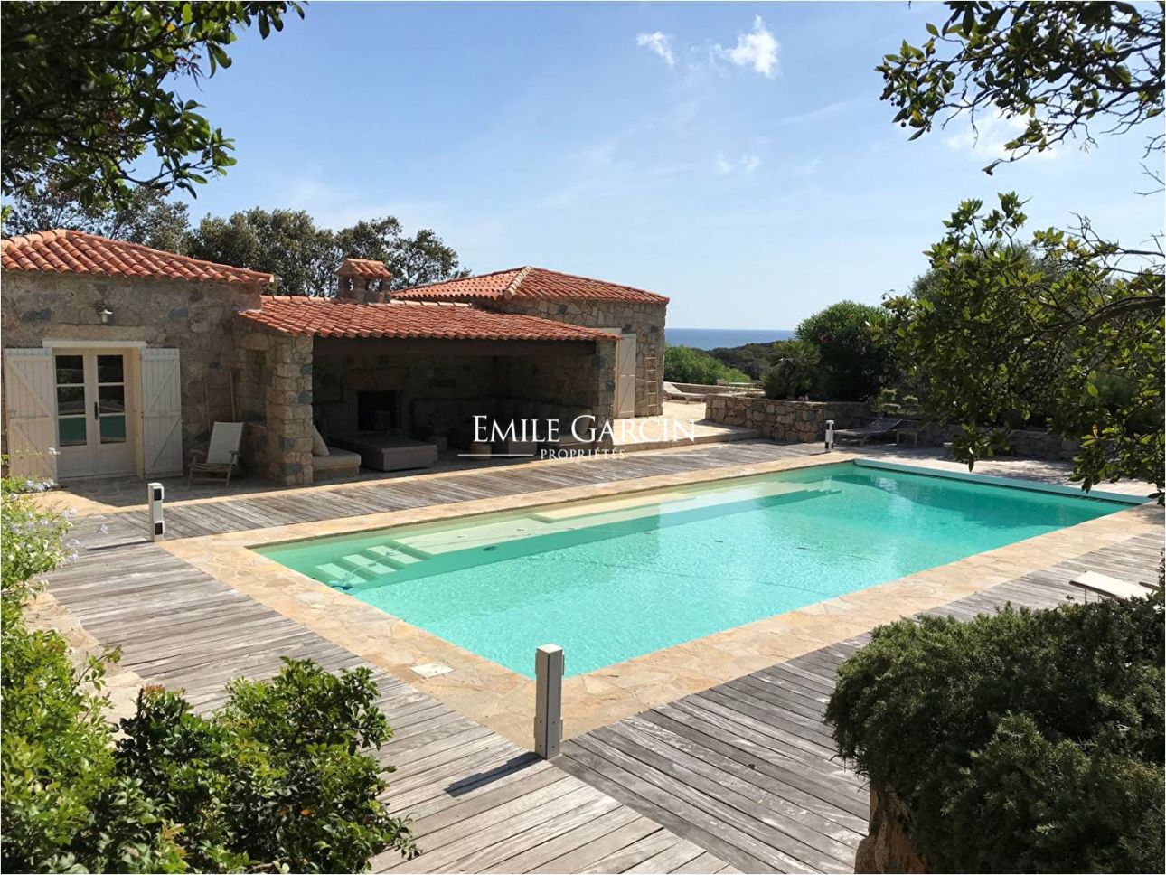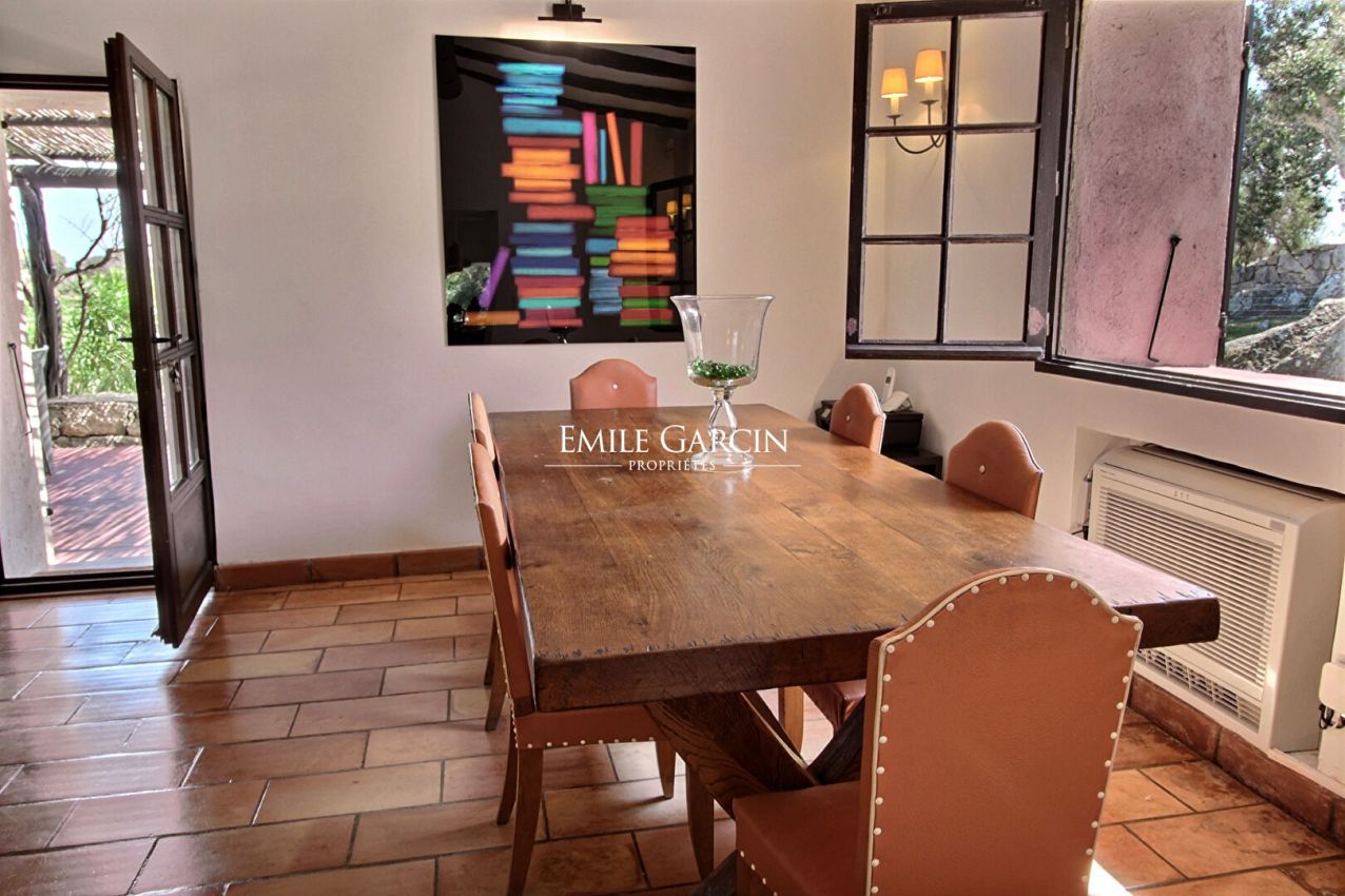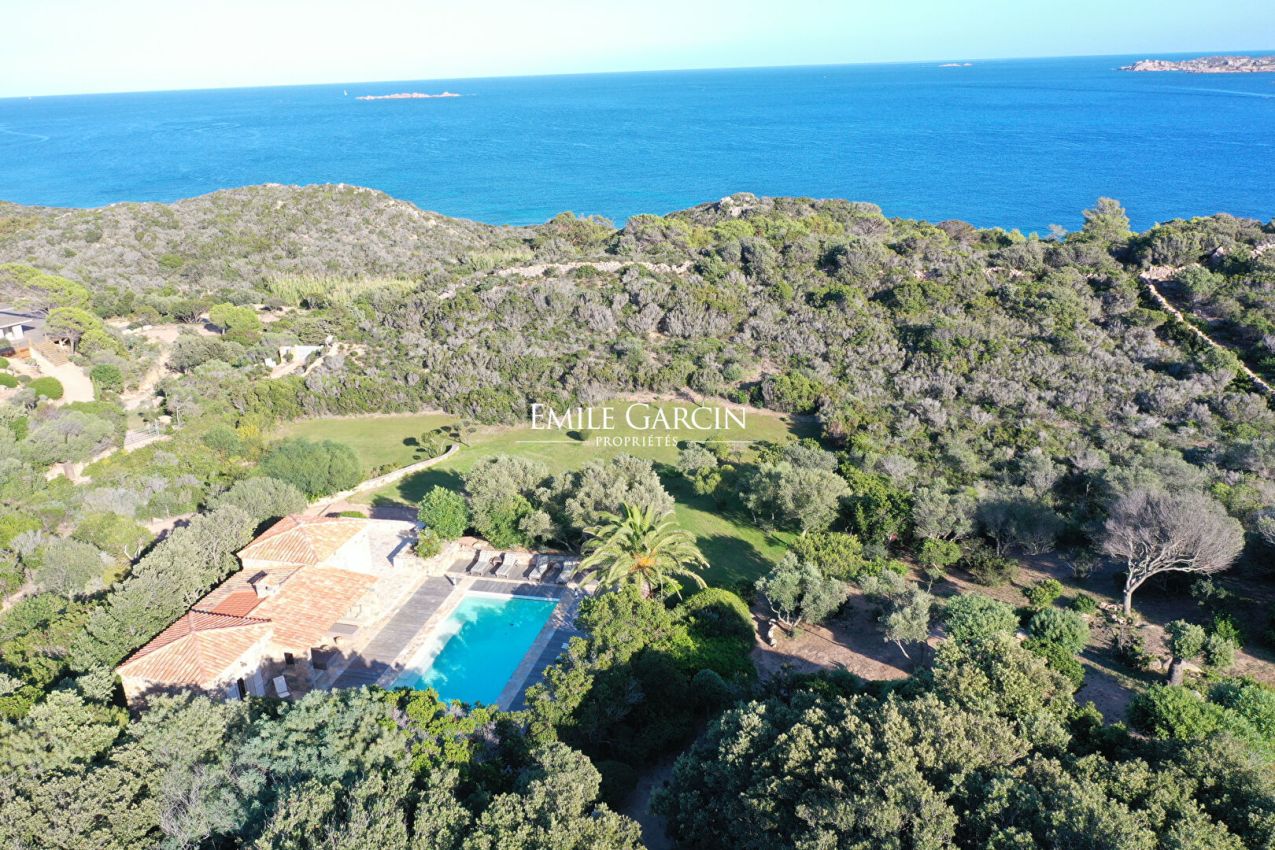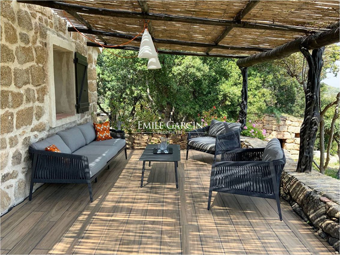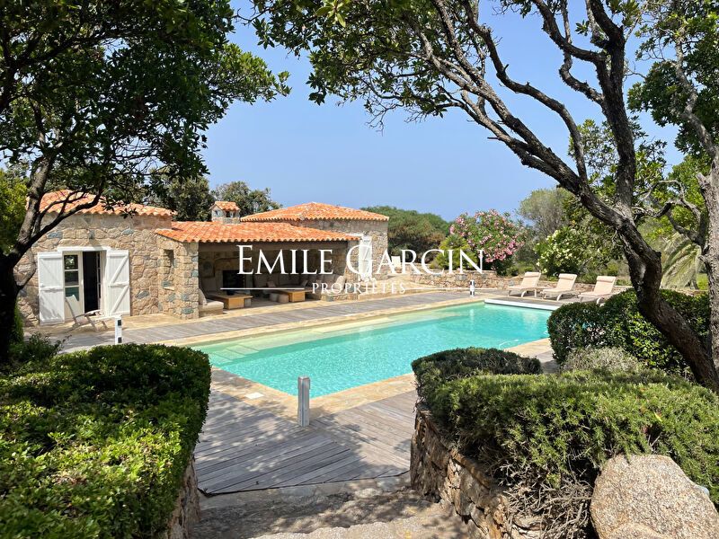 Converted sheepfold located on 2 hectares of leafy gardens. Exceptionally located 250 metres from the seafront, this true haven of peace presents authenticity, olive trees and maquis. 5 bedrooms, 5 bathrooms. Beautiful 2-hectare garden planted with olive trees, holm oaks and other Mediterranean vegetation. Heated swimming pool (12.5m x 5.5m secured by radar terminals. Handsome al fresco lounge fitted with large sofas and a fireplace near the swimming pool, an ideal place to enjoy the outdoors in every season. Several small wild coves accessible on foot, via a footpath crossing the maquis. Cleaning: 5 x 3 hours per week (included in the cost of your stay). Option to hire an additional chef. An ideal place to savour the authenticity and nature of Corsica among family and friends. Figari Airport: 30 mins. Bonifacio: 10 mins. Beach: 15 mins (by foot).