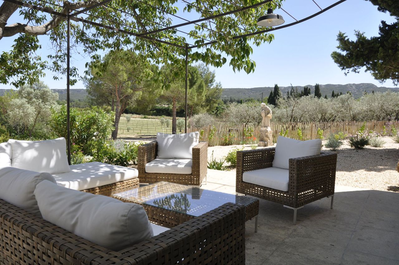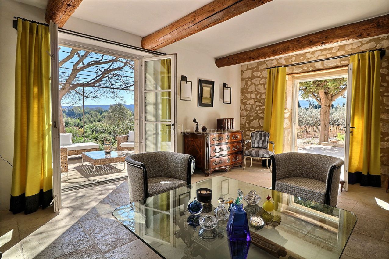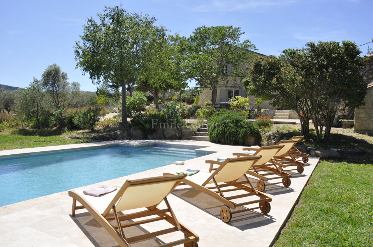 Located just one minute from the charming village of Eygalières, this beautifully renovated farmhouse offers delightful living areas and picturesque views of the Alpilles mountains. 5 bedrooms, 4 bathrooms, air conditioning and a heated salt-water swimming pool (protected by a cover and alarm system) and pool house with kitchen and living area. Sitting on two hectares of land featuring olive trees, gardens and a petanque area, this beautiful family retreat in the heart of Provence will delight adults and children alike.