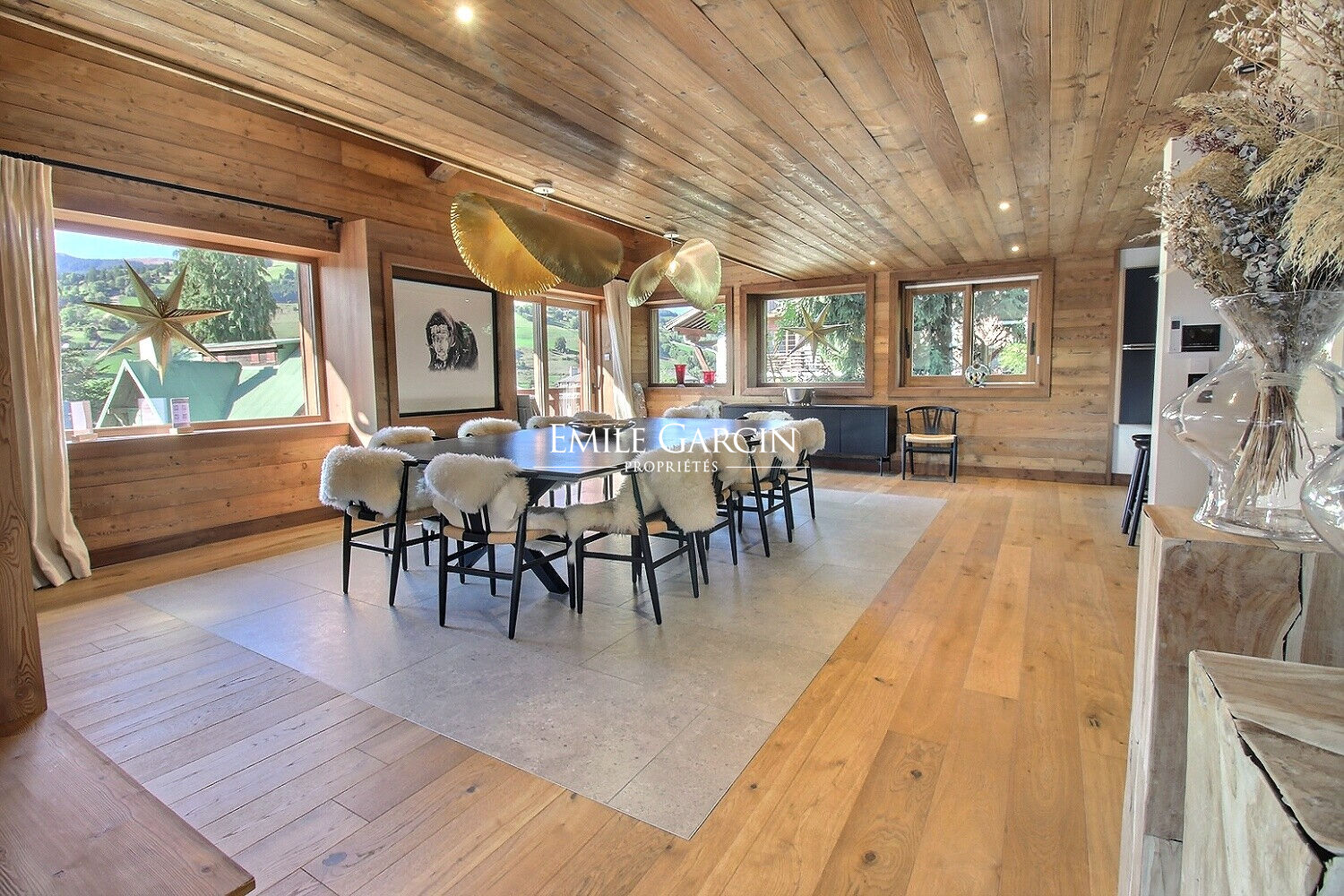 Idyllically located just a few minutes' walk from the pedestrianized centre of Megève village, and within easy reach of the Rochebrune ski lifts, this magnificent chalet of 330 sq.m is spread over three levels served by an elevator. It features a vast cathedral-style living room with fireplace and south/west-facing terrace, a dining room opening onto a fully equipped kitchen, five ensuite bedrooms including a master bedroom under the eaves, a wellness area with indoor pool, sauna and gym, and a ski equipment store.