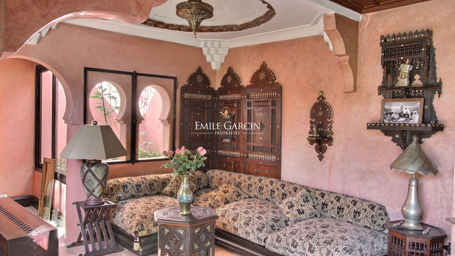 Charming townhouse comprising 400 m² of living area on 450 m² of private grounds. Located a few minutes walk from the Koutoubia and the Jemaa el Fna square, this unique and atypical setting makes the ideal destination for a family break. It presents two living rooms overlooking the garden, five bedrooms, four bathrooms and a hammam. Additional facilities include a heated outdoor swimming pool.