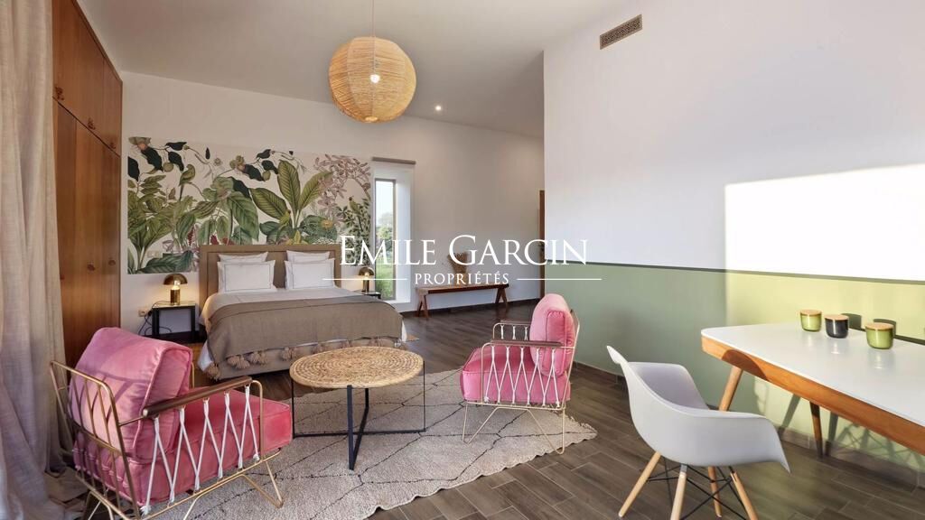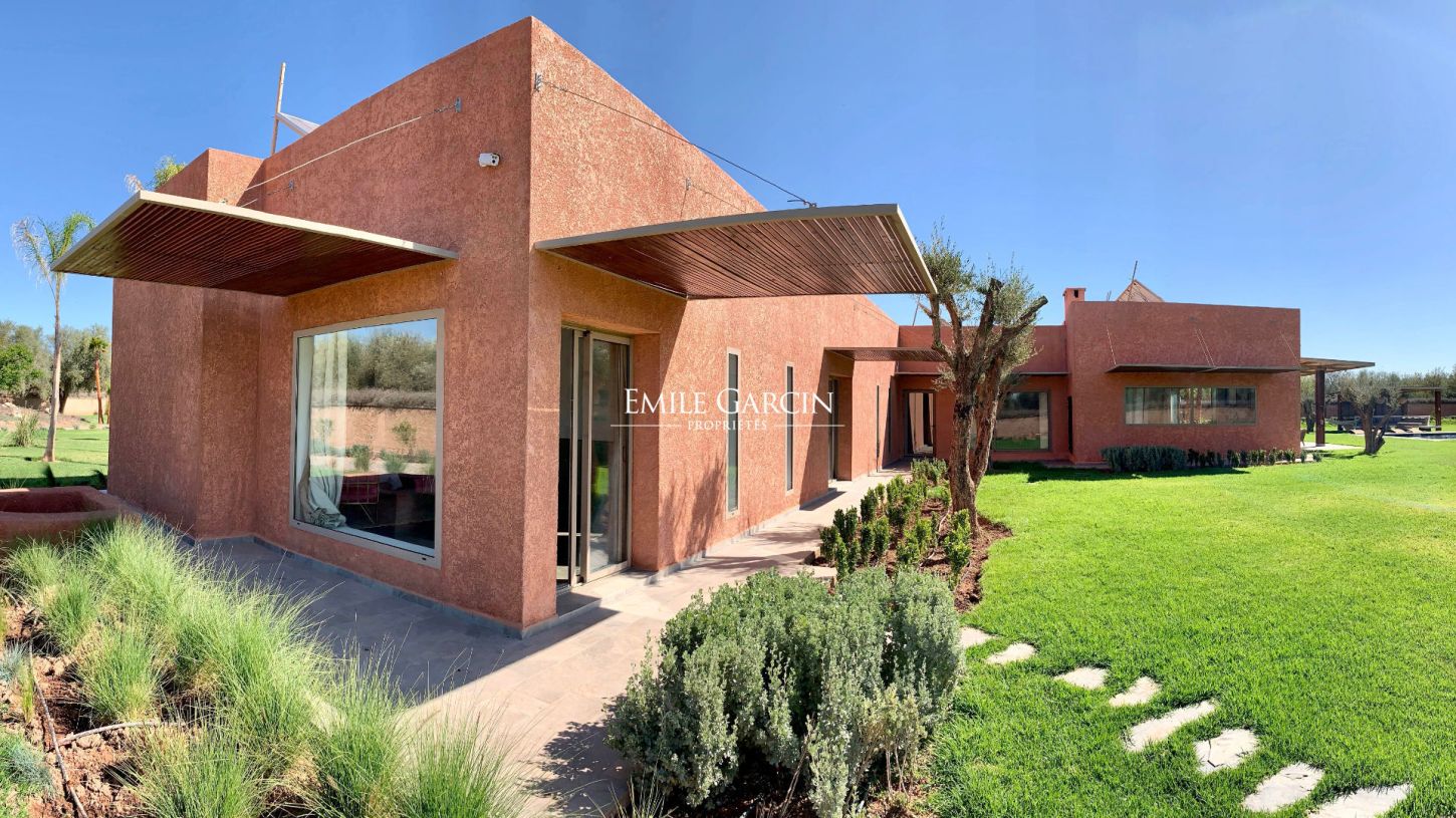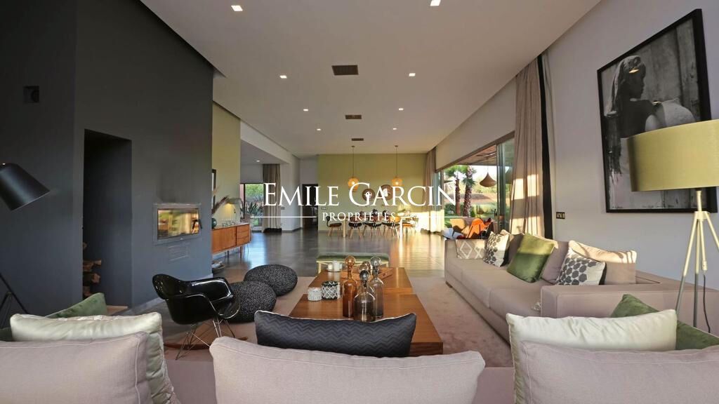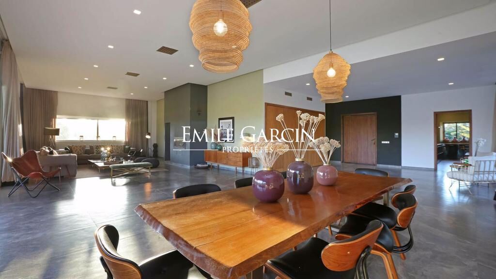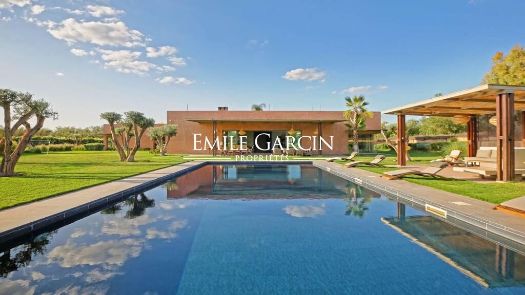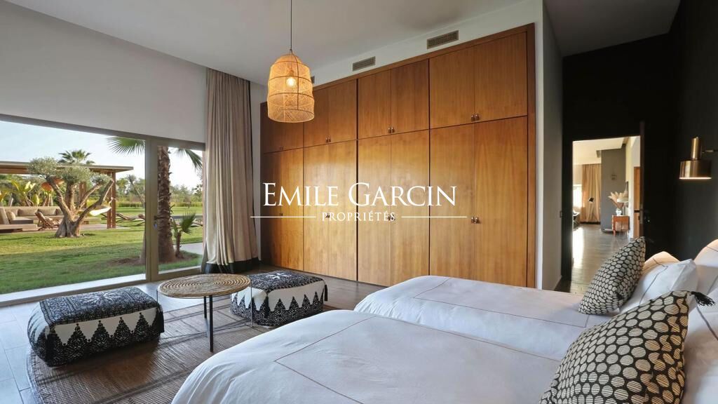 Contemporary single-level eco villa presenting 500 m² of living area on a hectare of leafy grounds (olive and palm trees) facing the Atlas Mountains. The property offers four suites (of 35 m² on average), in addition to a study/bedroom, a large living room with fireplace, a fully equipped kitchen and a swimming pool (15m x 7m). It is located on the outskirts of Marrakech, just 25 minutes from the city centre and 10 minutes from the nearest golf courses. In the grounds, you will find a Berber lodge (70 m²) presenting two bedrooms and a living room. From 750 EUR / night