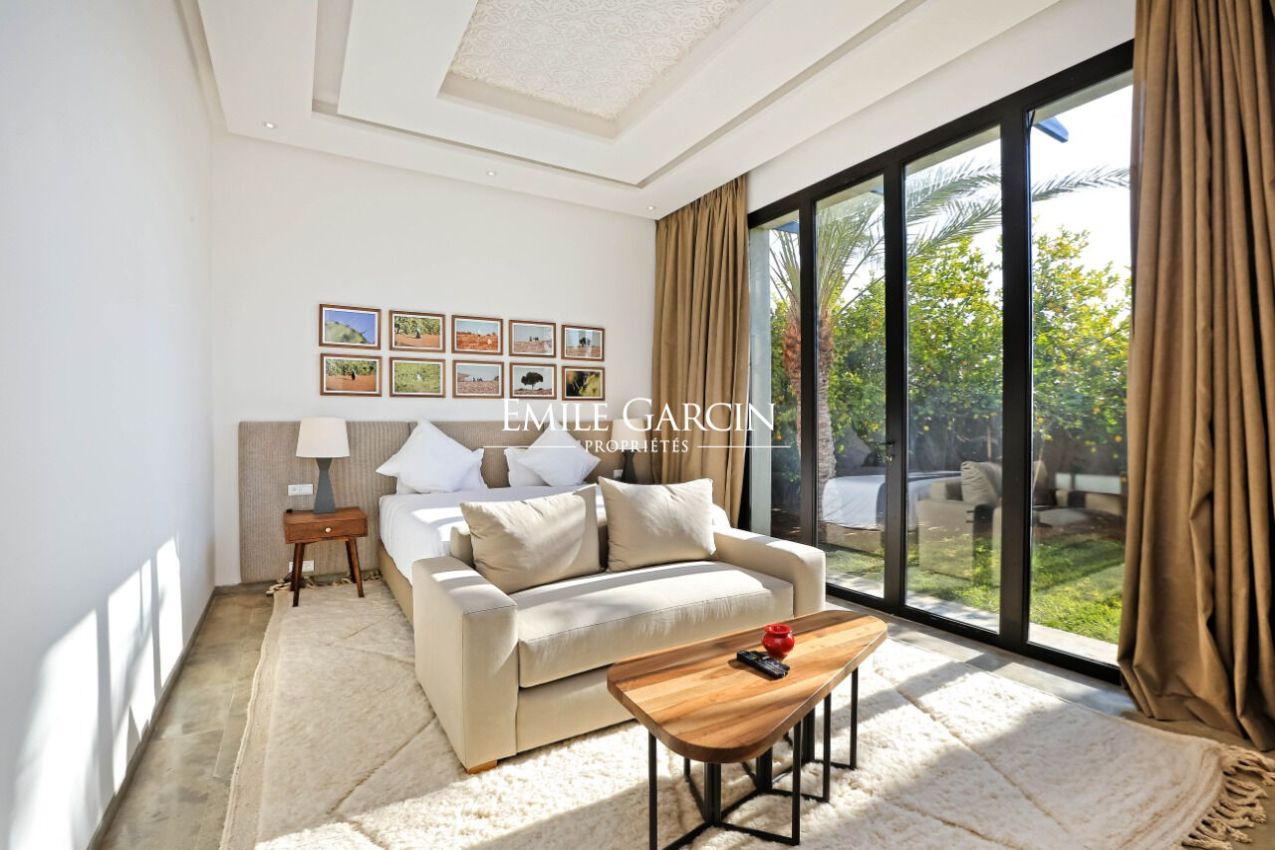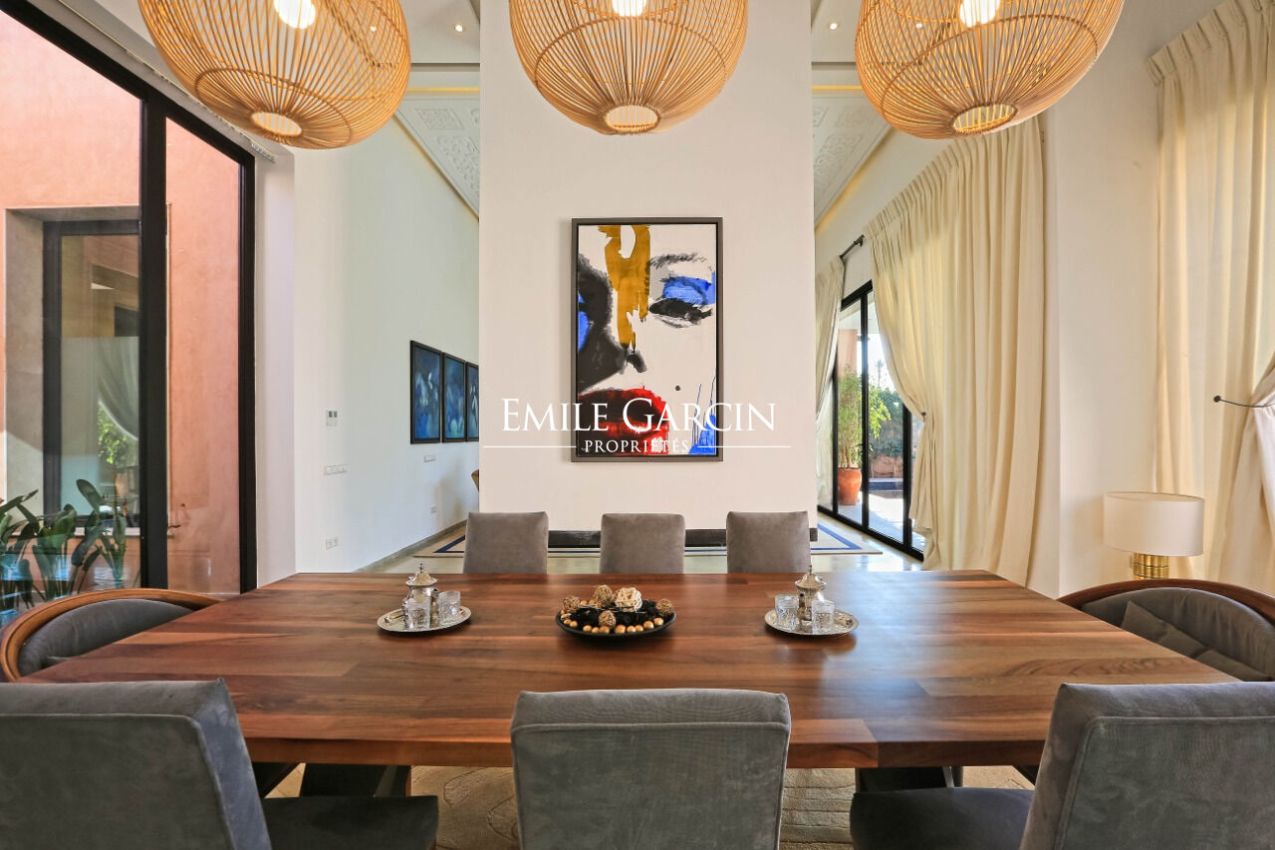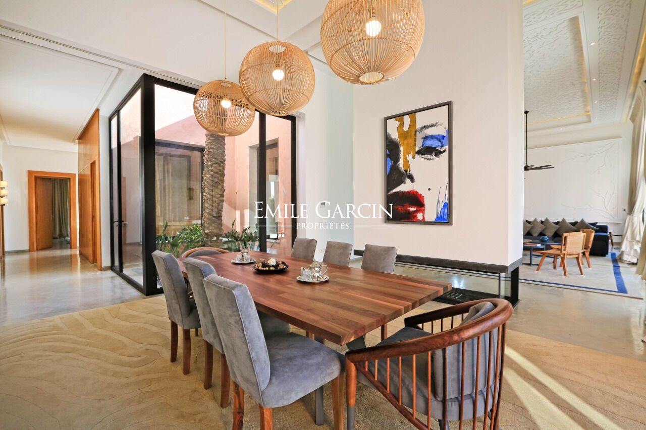 Beautiful single-level house of 600 m² located in the Palmeraie, just 15 minutes from Marrakech. It presents five bright and spacious suites. The reception area is composed of a large double living room with fireplace. Outside, there is a beautiful swimming pool (unheated) and 2000 m² of gardens. Rate: 690 EUR per night including chef and housekeeper. Minimum of two-night stay during the low season, four nights during the high season. From 690 EUR per night.