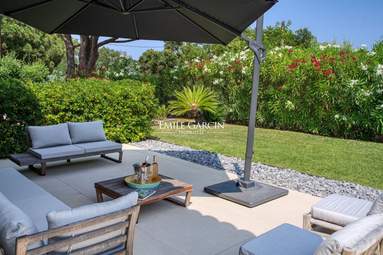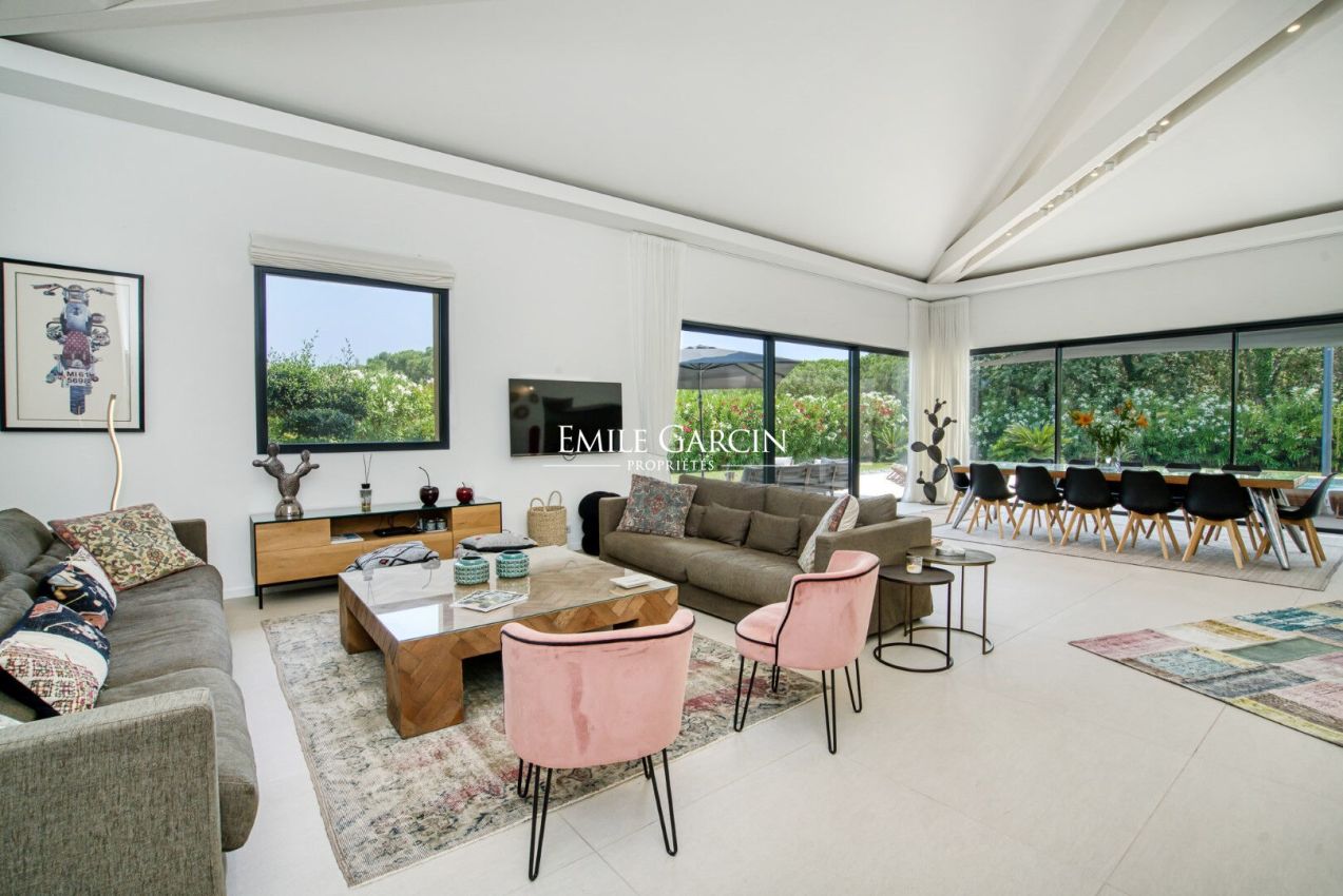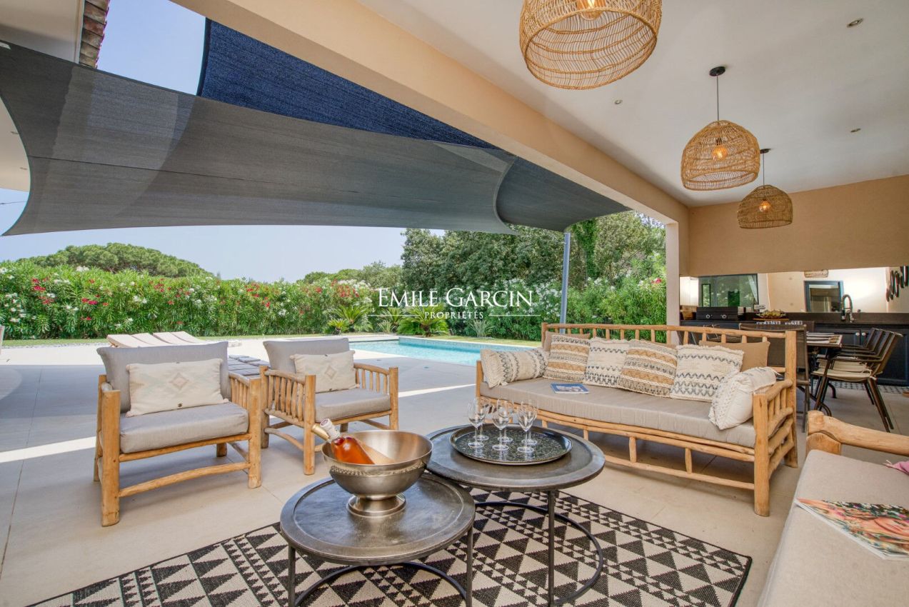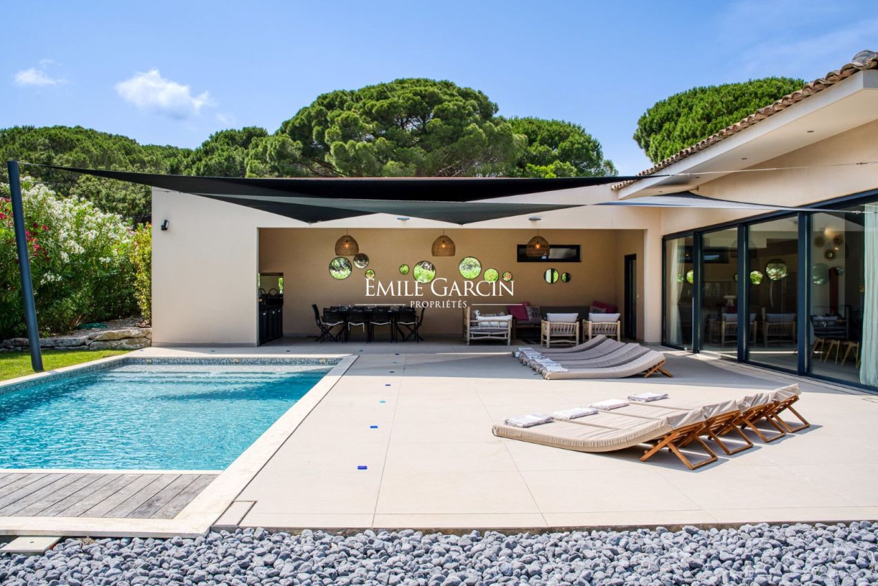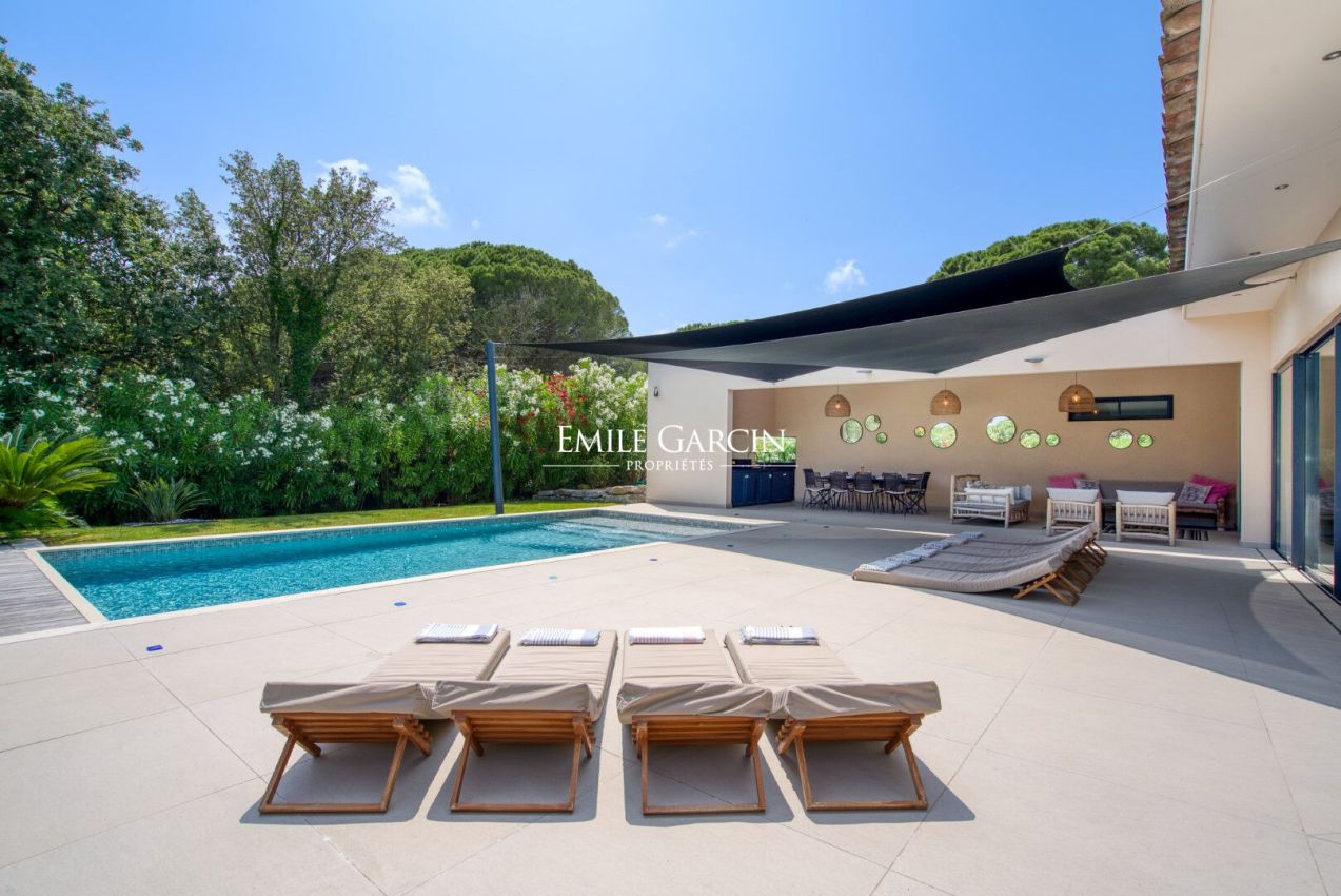 Located near the beaches of Pampelonne and the village of Ramatuelle, this magnificent modern villa of 270 sq.m on a landscaped plot of 2,200 sq.m is ideal for holidays with friends or family. Large living spaces. Heated swimming pool. Petanque ground. Services included. 5 bedrooms and 5 bathrooms. Registration number 83101000270AG