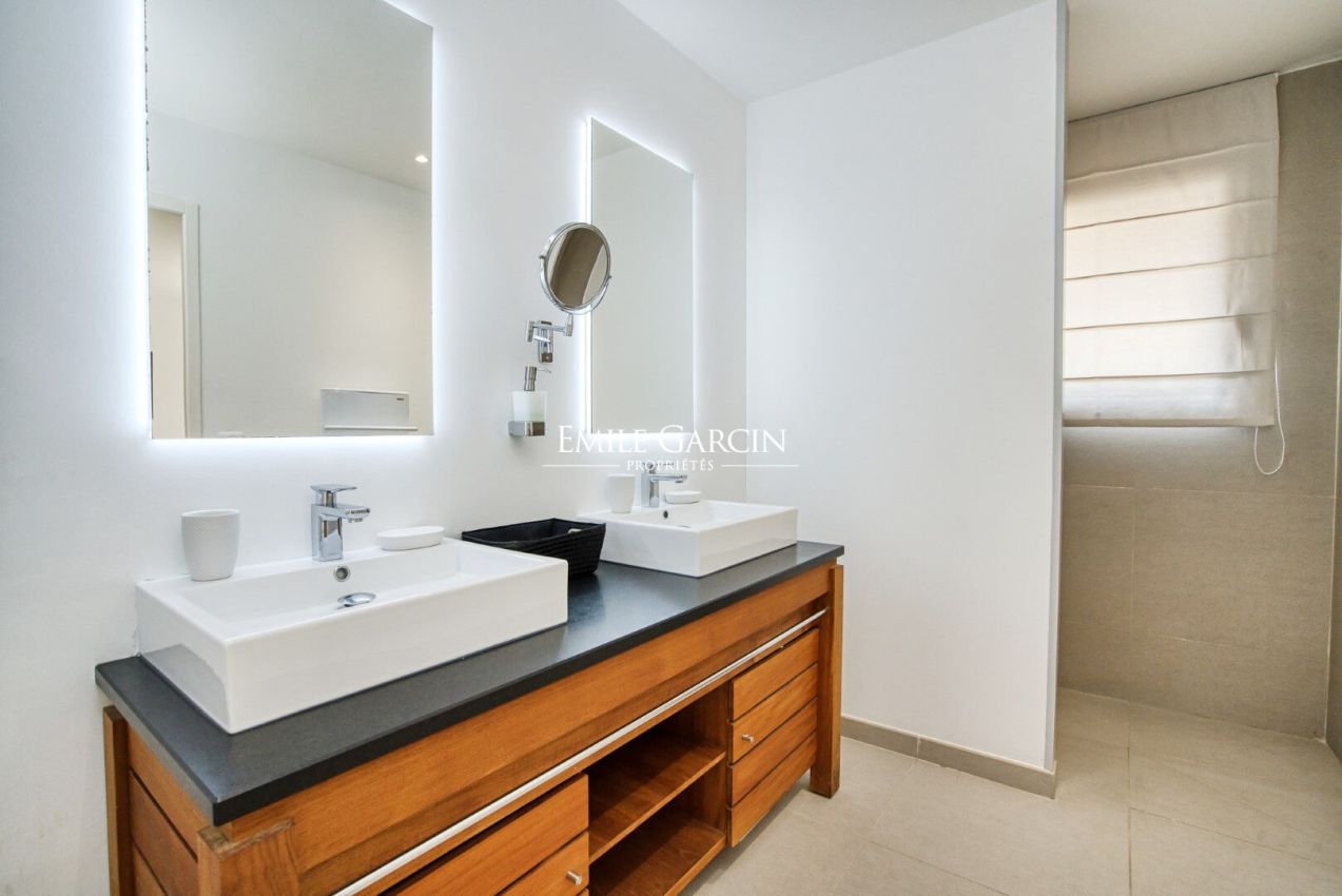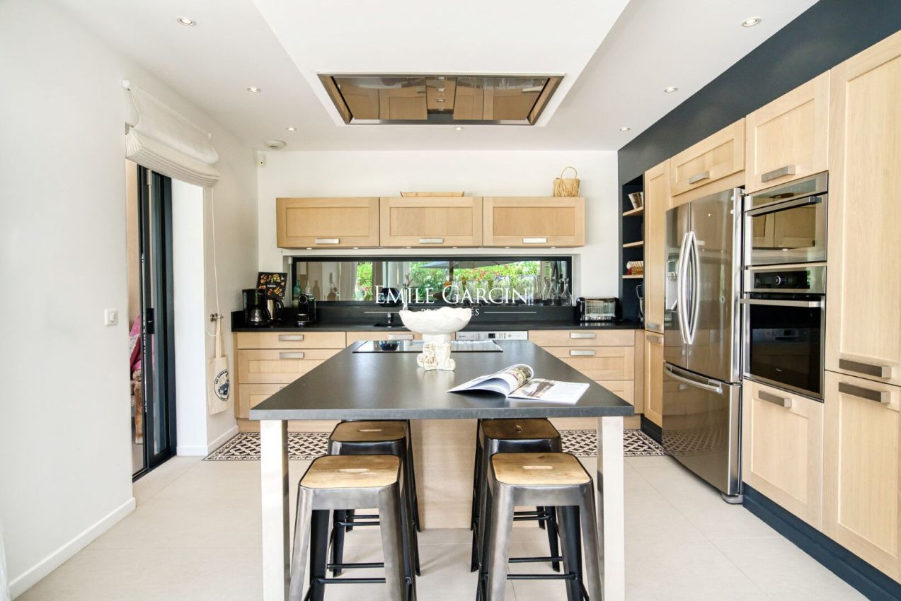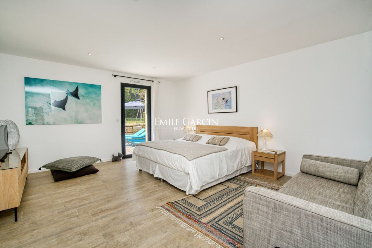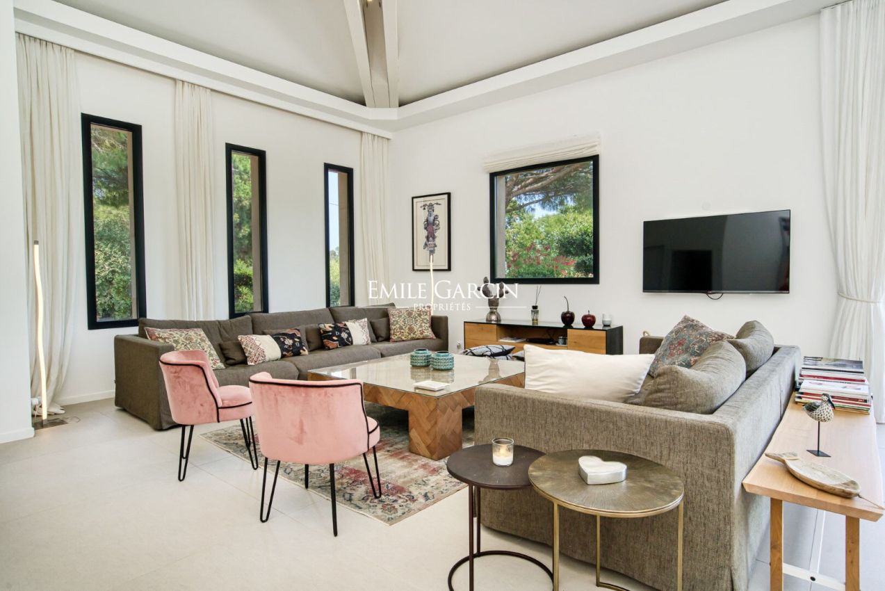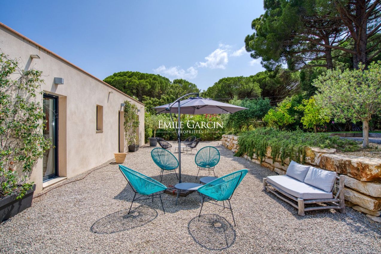 Located near the beaches of Pampelonne and the village of Ramatuelle, this magnificent modern villa of 270 sq.m on a landscaped plot of 2,200 sq.m is ideal for holidays with friends or family. Large living spaces. Heated swimming pool. Petanque ground. Services included. 5 bedrooms and 5 bathrooms. Registration number 83101000270AG