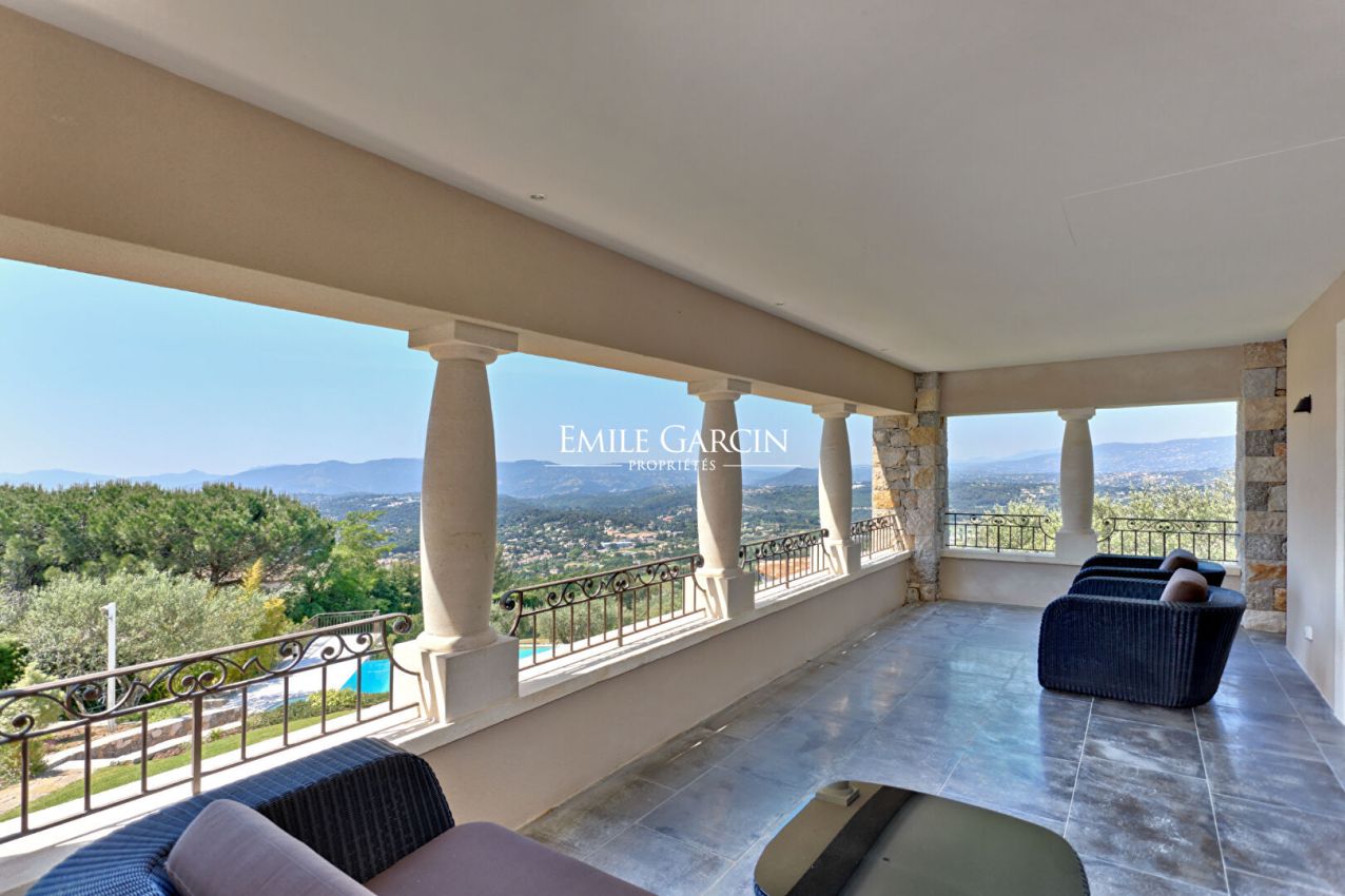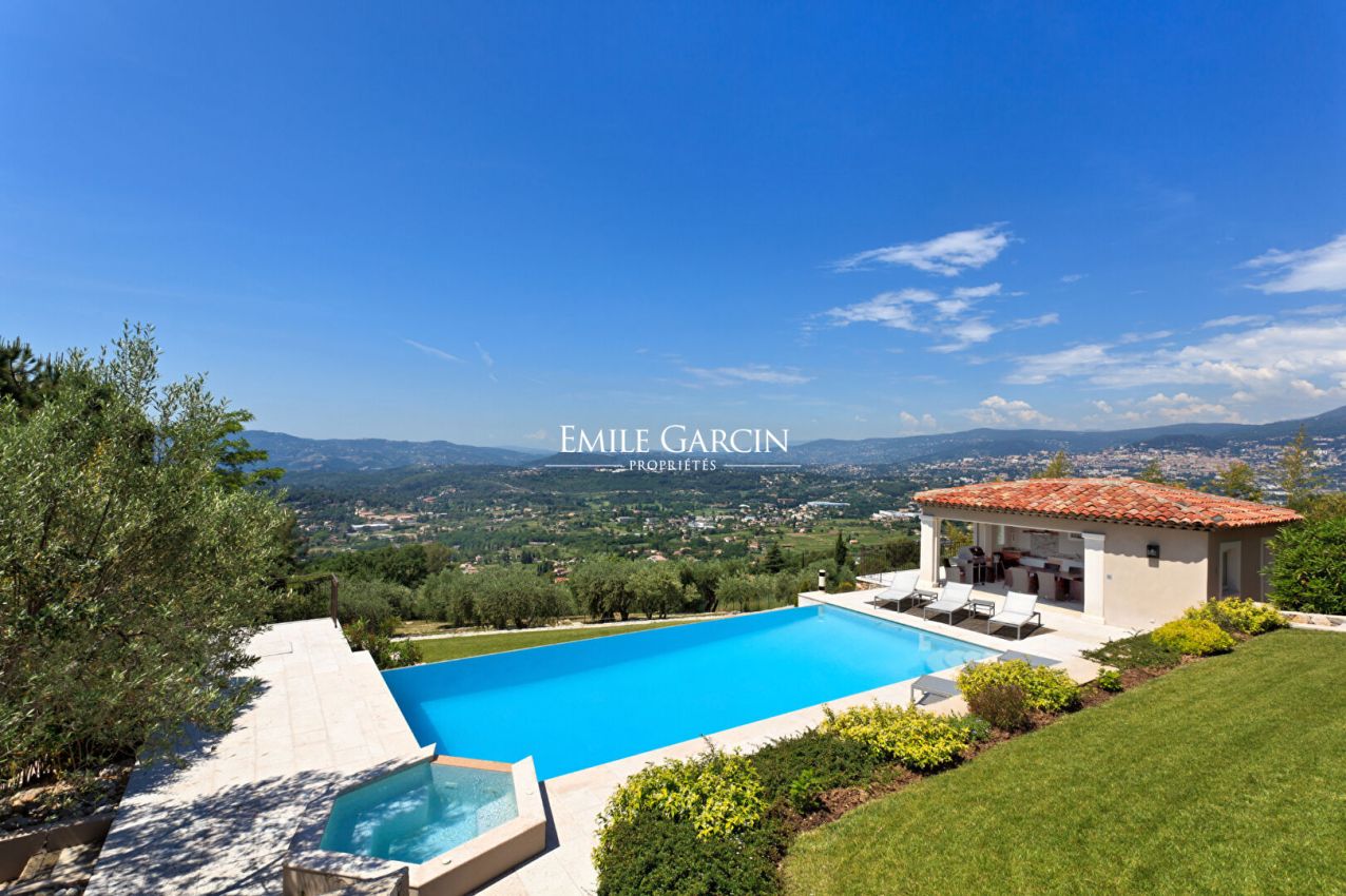 Immaculately renovated house for sale close to Mougins. Perfect condition throughout. Reception rooms, 4 bedrooms, 4 bathrooms. Westerly aspect and far reaching views. Utterly peaceful. The property is surrounded by 5000 sq.m of gardens with an infinity swimming pool, pool-house and olive grove.