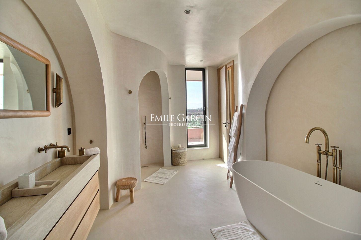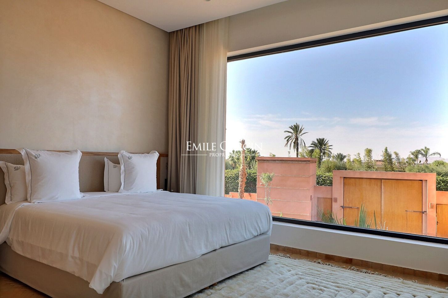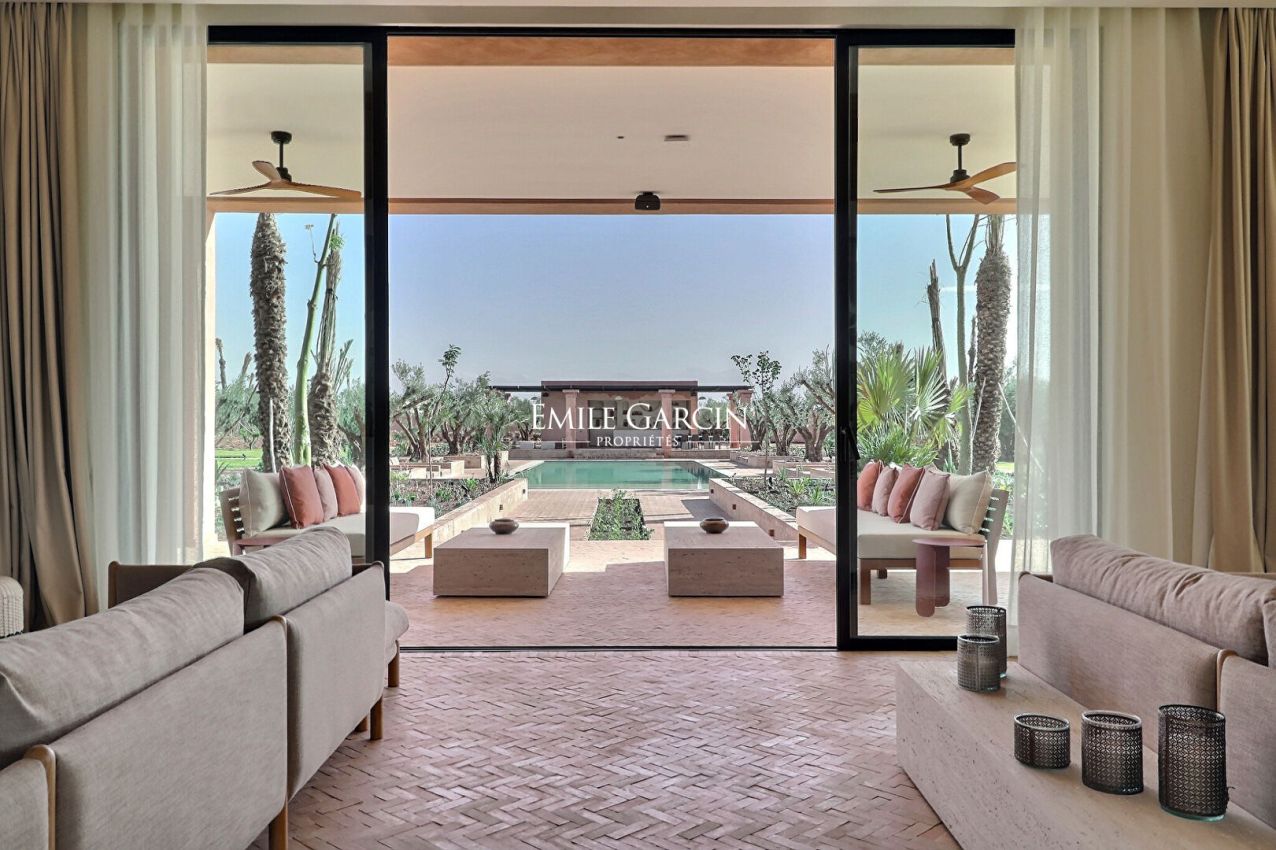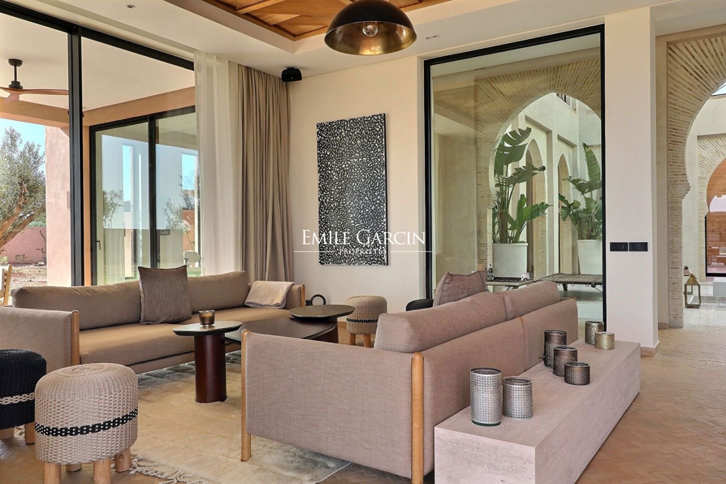 This sublime and elegantly decorated modern villa is located a few minutes from the main golf courses of Marrakech. The six bedrooms (including a 100-sq.m master suite) are arranged around a central patio. Beautiful living room with fireplace overlooking the garden. TV lounge. Outdoor space presenting one hectare of grounds with a view of the Atlas mountains, a 25-metre heated swimming pool, a pétanque area, a paddle court and a beautiful pool house with lounge and bar. Use of a large spa with hammam and massage room. Available from 2400 EUR per night. Sleeps 12 people.
