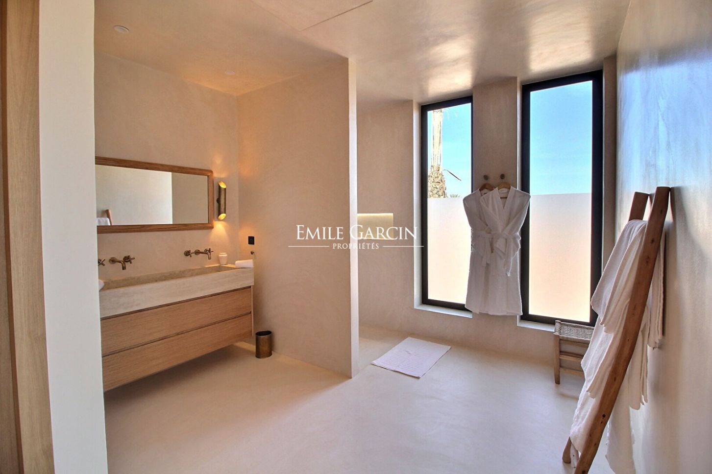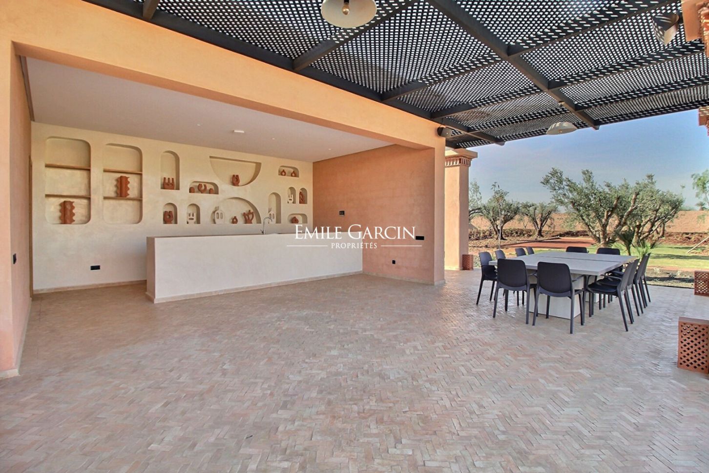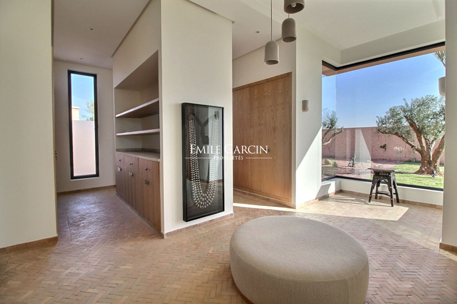 This sublime and elegantly decorated modern villa is located a few minutes from the main golf courses of Marrakech. The six bedrooms (including a 100-sq.m master suite) are arranged around a central patio. Beautiful living room with fireplace overlooking the garden. TV lounge. Outdoor space presenting one hectare of grounds with a view of the Atlas mountains, a 25-metre heated swimming pool, a pétanque area, a paddle court and a beautiful pool house with lounge and bar. Use of a large spa with hammam and massage room. Available from 2400 EUR per night. Sleeps 12 people.