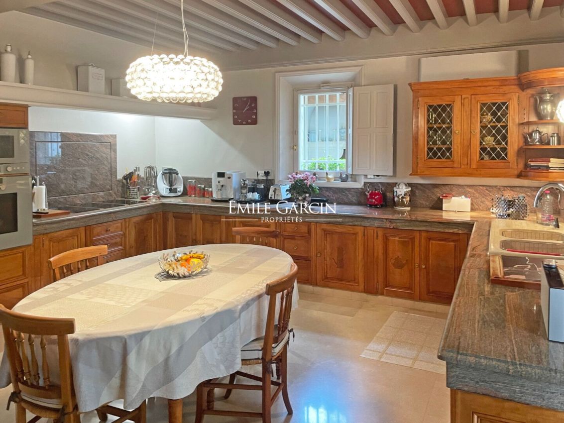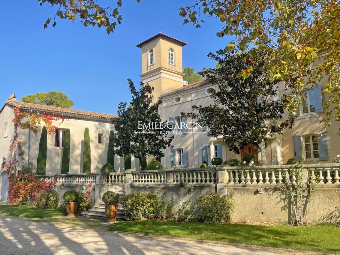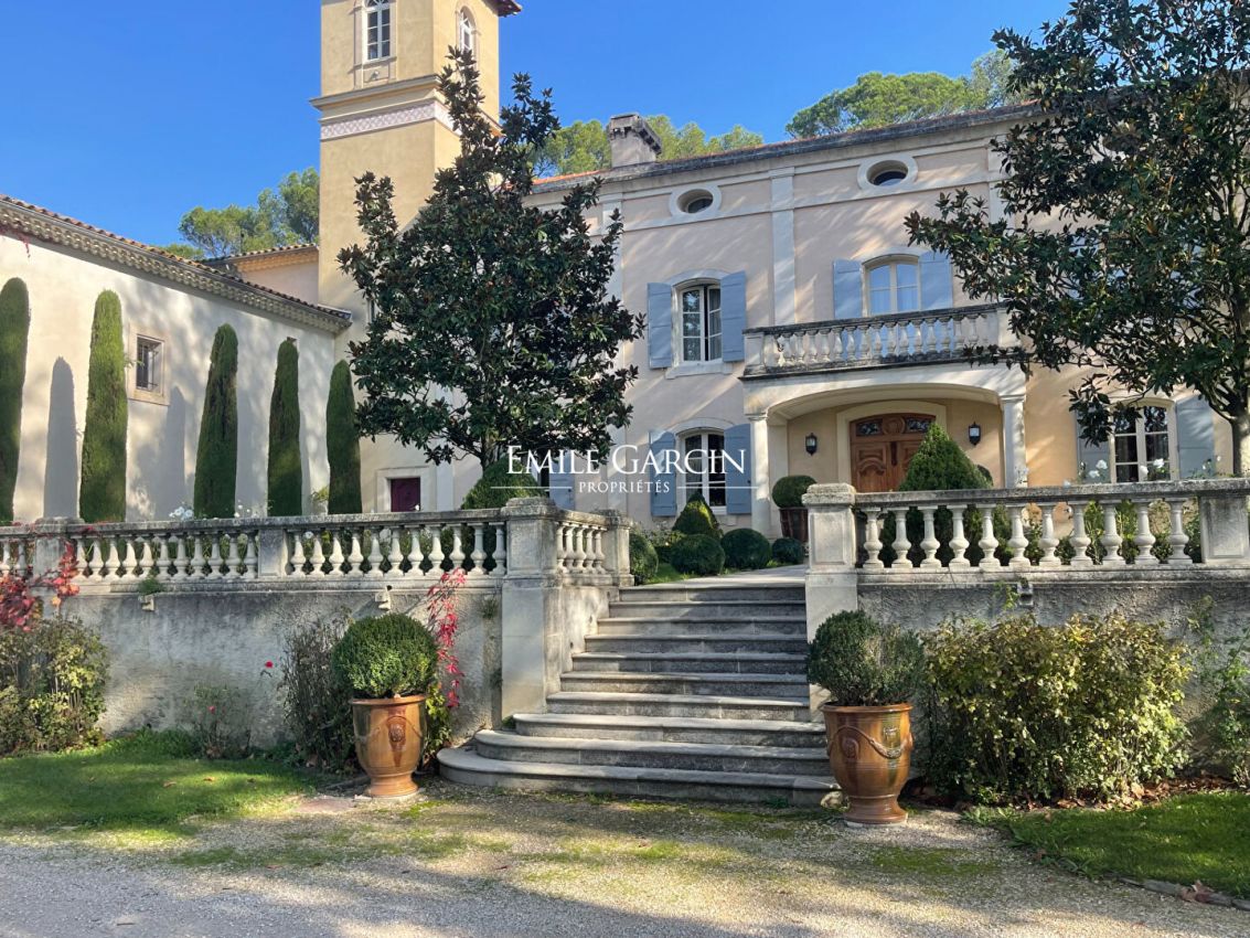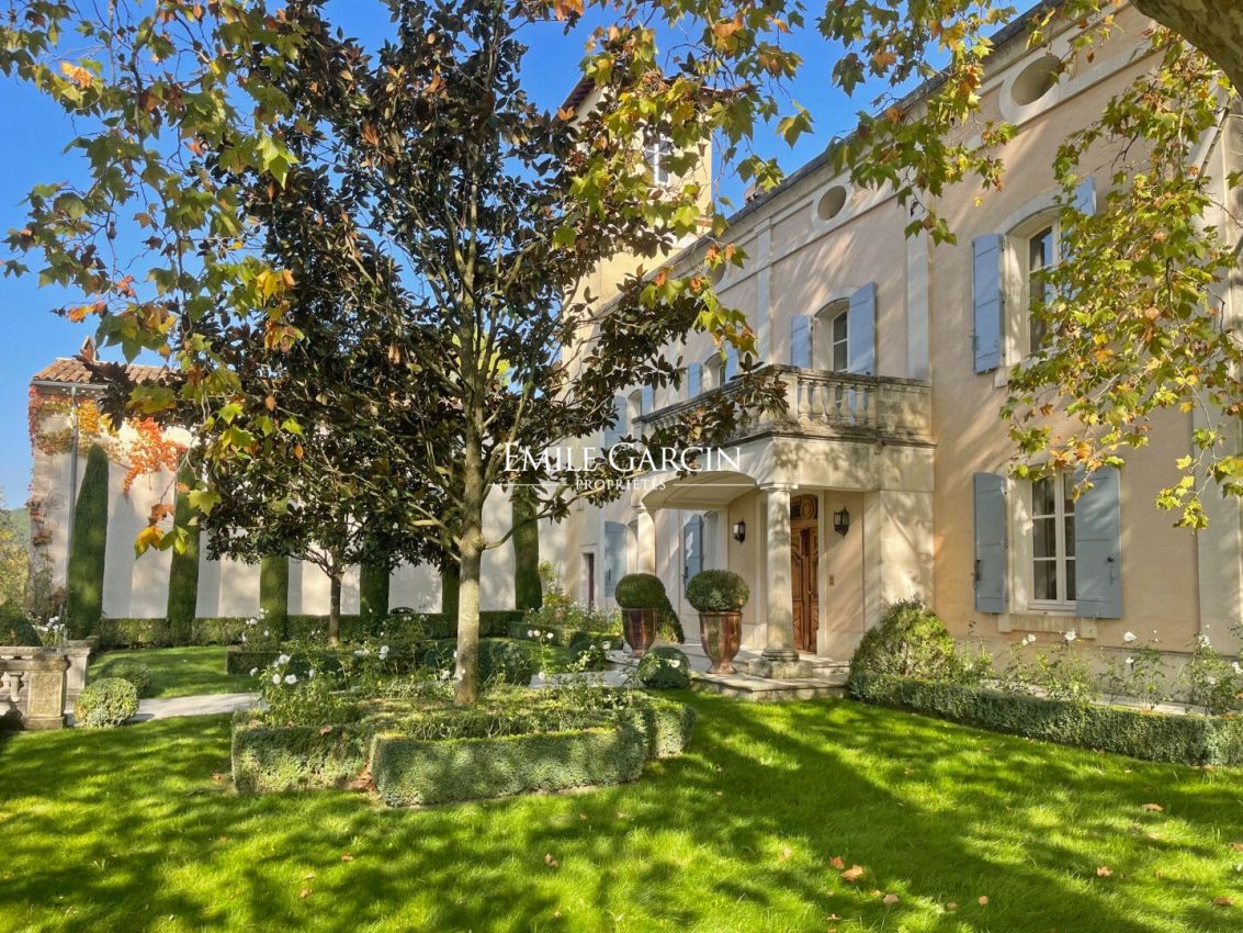 Property sitting on 20 hectares of private grounds surrounded by wooded hills. Peaceful but not isolated, the property comprises a converted farmhouse of approximately 500 sq.m with several reception rooms, a large family kitchen backing onto a terrace and five comfortable ensuite bedrooms. In a separate wing of the house, there are two beautiful large empty rooms totalling 200 sq.m. The property also presents a private chapel and a large stone shed. The magnificent grounds are adorned by ancient trees (pines, oaks, olive trees, fruit trees), terraced gardens, ponds and meadows. The location is 2.5 km from the nearest shops, 35 minutes from AVIGNON TGV station, and an hour from Marseille and its airport.