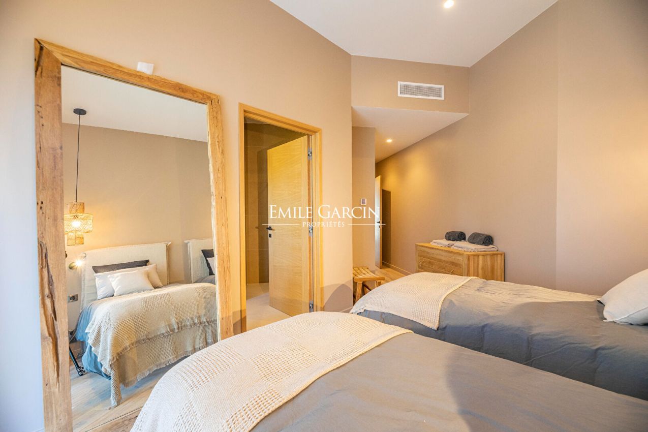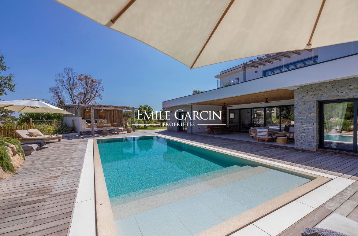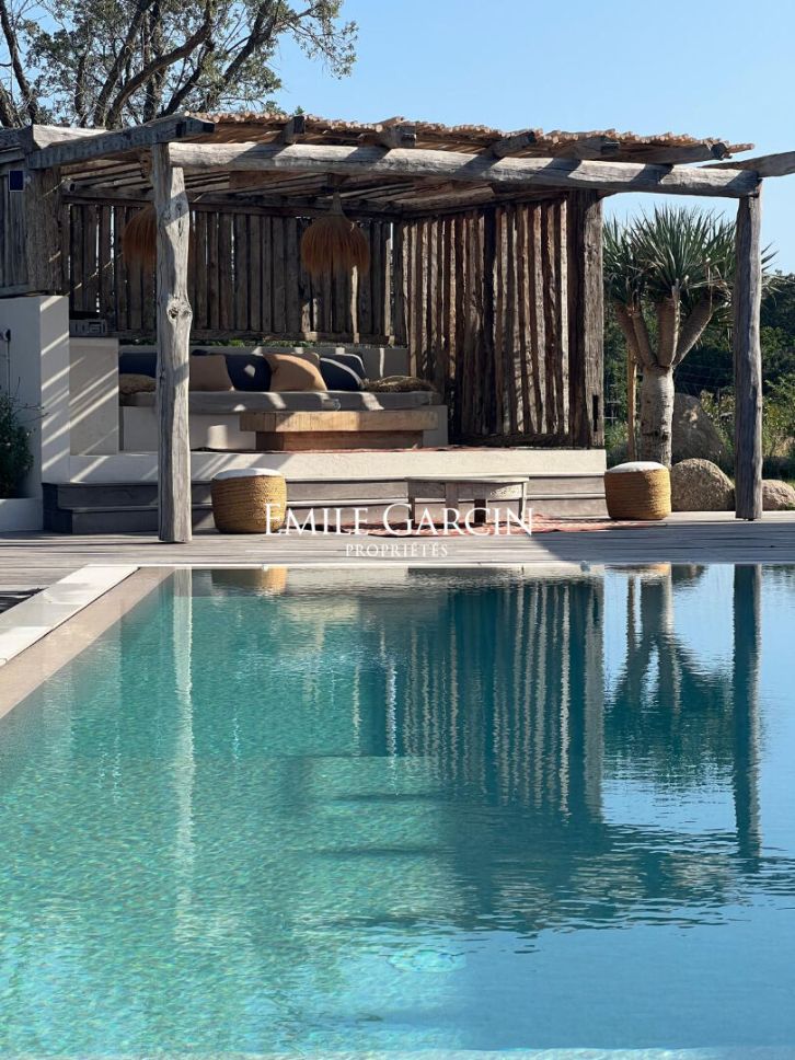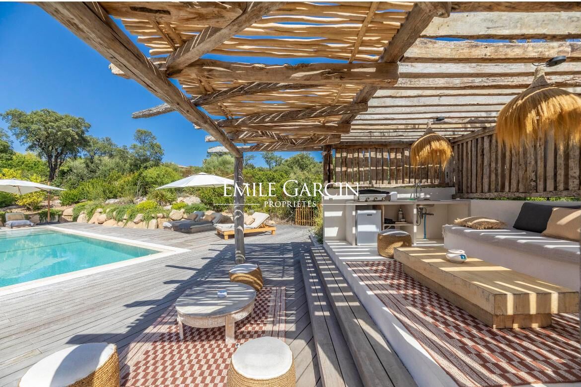 Magnificent designer house located in a quiet area less than 10 minutes by foot from the famous Cabanon Bleu on St Cyprien Beach. Tastefully decorated and presenting high quality facilities, this property is ideal for a relaxing beach break near Porto-Vecchio. Fully equipped and air-conditioned, it can accommodate up to 10 people across 5 bedrooms and 5 bathrooms. Heated mirror swimming pool (11 x 4.5m) treated with salt. Pool house. Figari Airport: 45 mins. Porto-Vecchio: 25 mins. Cabanon Bleu: 10 mins by foot. The entrance serves a large, bright living room with large windows and high ceilings. The living space is split between a living room equipped with sofas, TV and fireplace and a fully equipped open kitchen with central island. On the ground floor, there are four bedrooms. The first bedroom is equipped with a 180 cm double bed or 2 x 90cm beds. The second, third and fourth bedrooms are equipped with 160 cm beds. All the bedrooms have their own shower/bathroom and toilet. Upstairs, there is a reading corner on the mezzanine backing onto a large terrace equipped with sun loungers overlooking the garden and swimming pool. A final bedroom (the master) is located on this level, equipped with a 180 cm double bed, a full bathroom (bathtub and shower), separate WC, dressing room and terrace access.