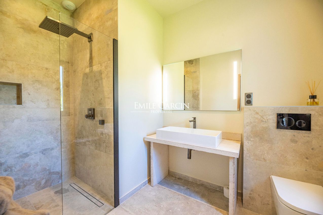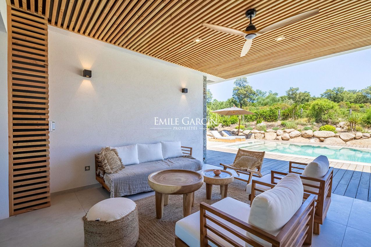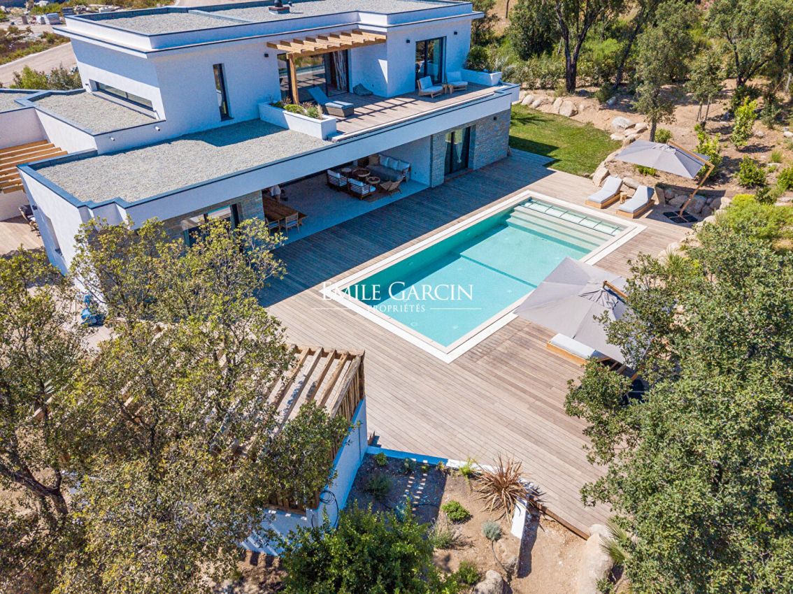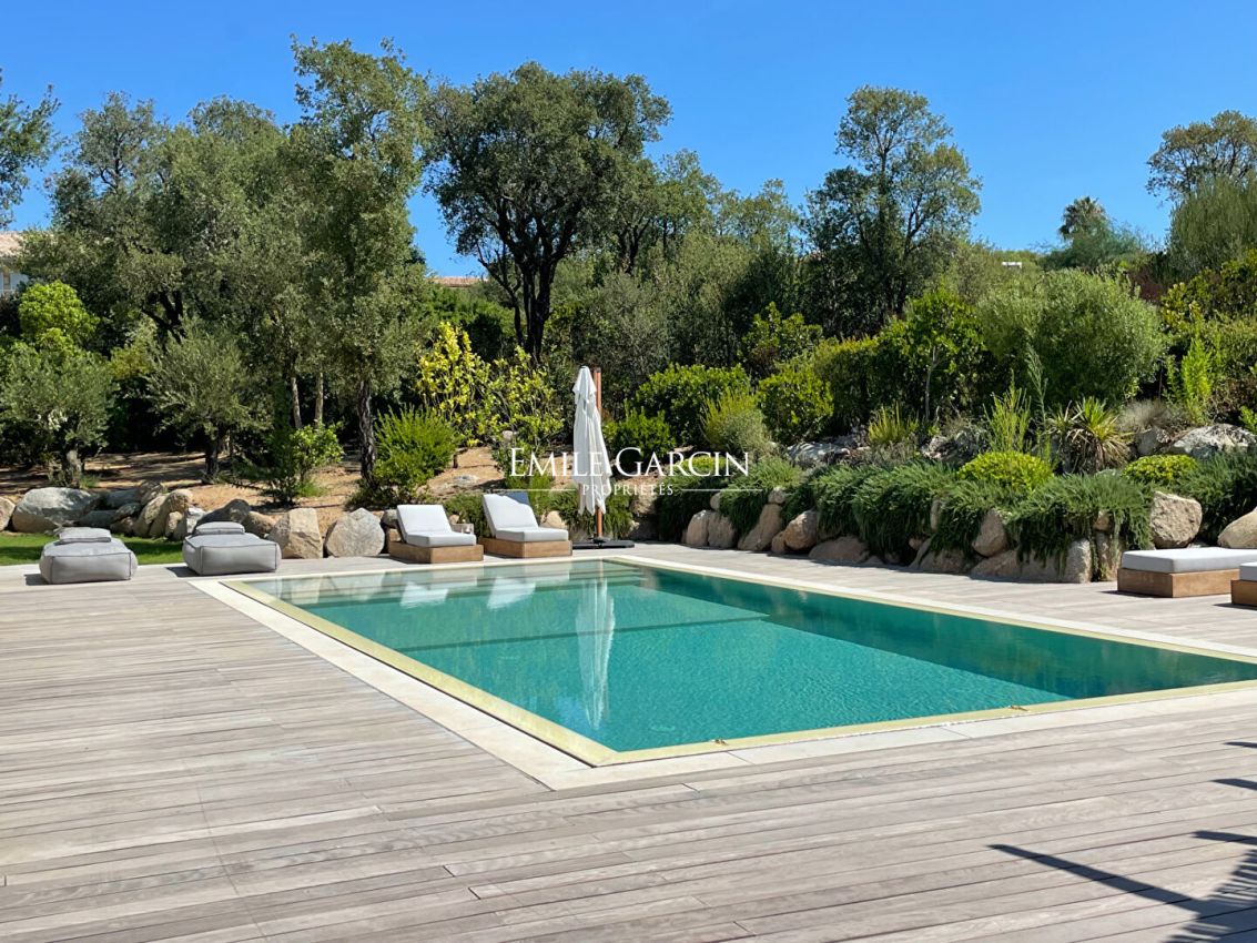 Magnificent designer house located in a quiet area less than 10 minutes by foot from the famous Cabanon Bleu on St Cyprien Beach. Tastefully decorated and presenting high quality facilities, this property is ideal for a relaxing beach break near Porto-Vecchio. Fully equipped and air-conditioned, it can accommodate up to 10 people across 5 bedrooms and 5 bathrooms. Heated mirror swimming pool (11 x 4.5m) treated with salt. Pool house. Figari Airport: 45 mins. Porto-Vecchio: 25 mins. Cabanon Bleu: 10 mins by foot. The entrance serves a large, bright living room with large windows and high ceilings. The living space is split between a living room equipped with sofas, TV and fireplace and a fully equipped open kitchen with central island. On the ground floor, there are four bedrooms. The first bedroom is equipped with a 180 cm double bed or 2 x 90cm beds. The second, third and fourth bedrooms are equipped with 160 cm beds. All the bedrooms have their own shower/bathroom and toilet. Upstairs, there is a reading corner on the mezzanine backing onto a large terrace equipped with sun loungers overlooking the garden and swimming pool. A final bedroom (the master) is located on this level, equipped with a 180 cm double bed, a full bathroom (bathtub and shower), separate WC, dressing room and terrace access.
