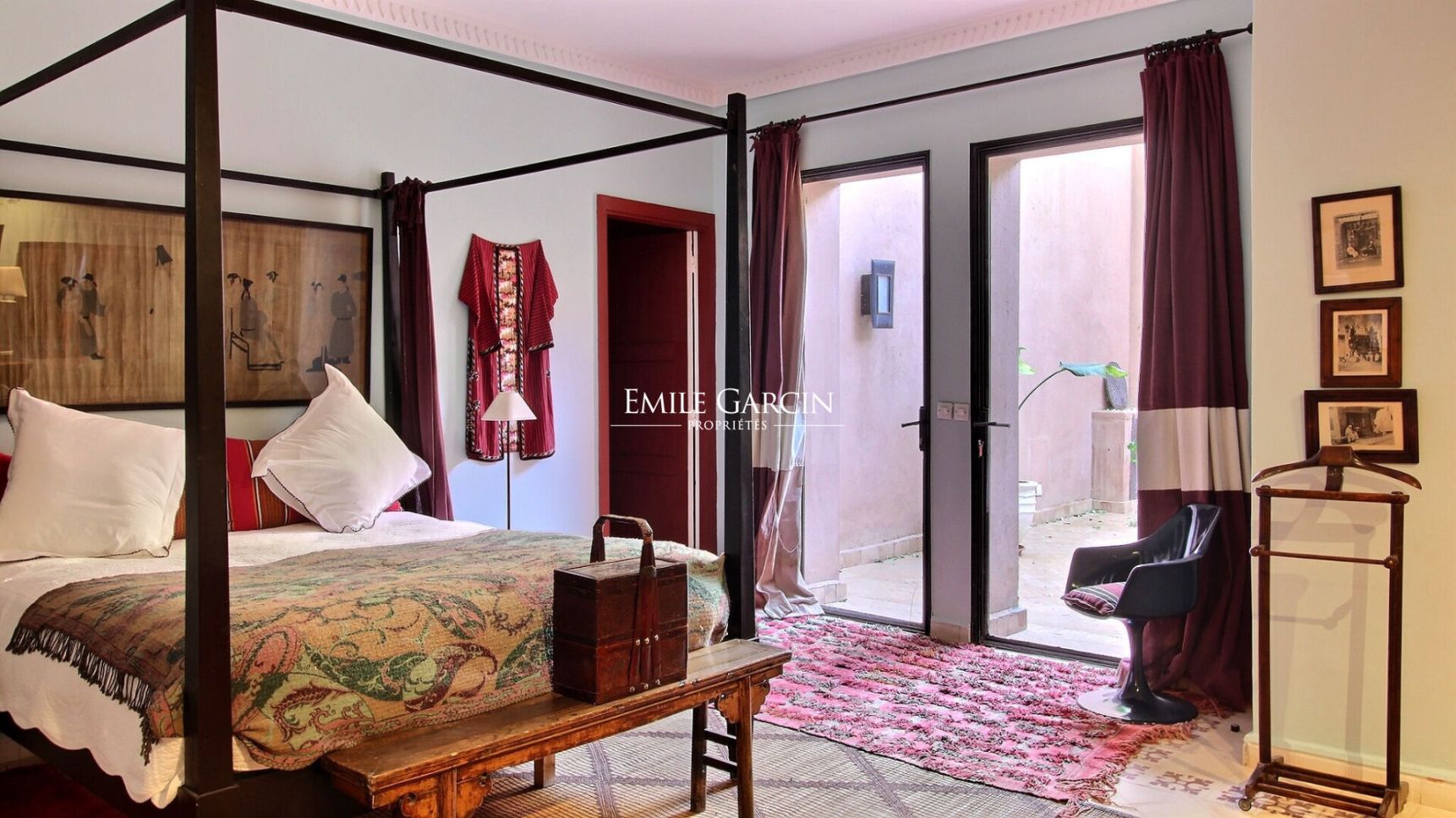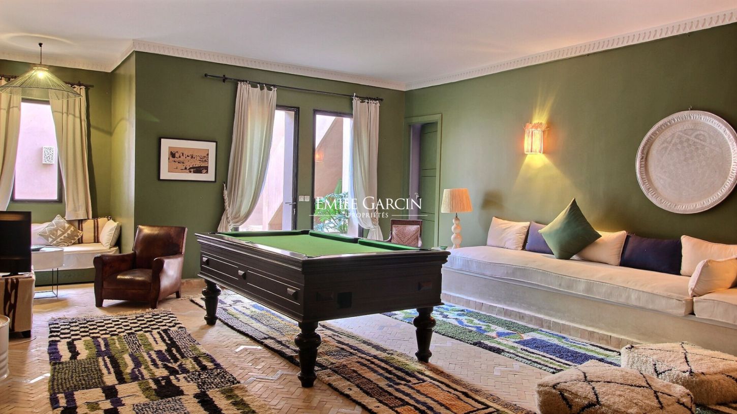 For rent luxurious property in the heart of the Palmeraie of Marrakech. This magnificent 9 bedroom house will appeal to a stay with family or friends. 2 hectare garden with 25m long swimming pool, hammam. The house perfectly mixes authenticity and Moroccan charm, magnificent patio, large living room, dining room, office and equipped kitchen. It has 4 bedrooms on the ground floor including 2 with private terraces upstairs, 4 large suites, fireplace and a Moroccan living room. In the basement, 1 large bedroom with bathroom and terrace, 1 large games room. Capacity: 18 pers. From: 1100 EUR / night - Villa 9ch. From: 800 EUR / night - Villa 4ch.