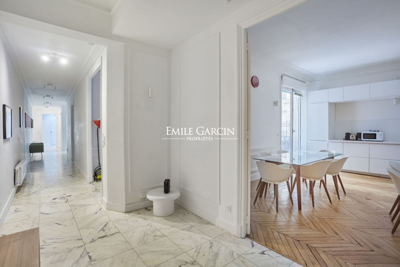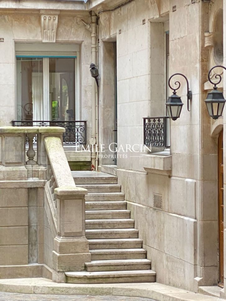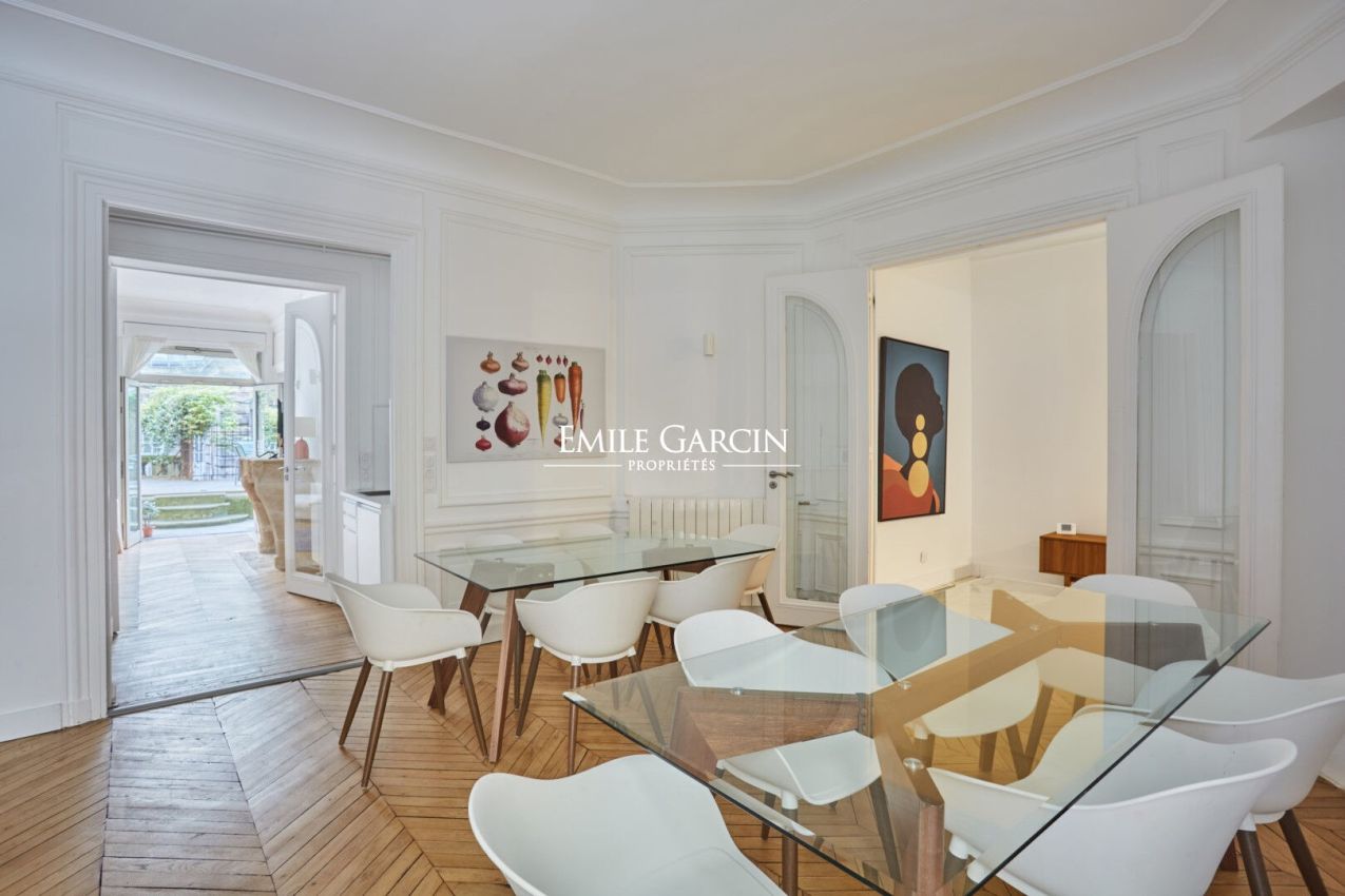 Peacefully located near Trocadéro, this spacious and fully renovated ground-floor apartment presents 182 sq.m of living area with a terrace of 85 sq.m terrace. It is sold with two parking spaces within the building. The interior comprises a private entrance, a beautiful reception room, an open kitchen, a master suite with storage space backing onto a charming leafy terrace, and three other bedrooms overlooking the courtyard with bathrooms and shower rooms. The property features herringbone parquet flooring, a fireplace, mouldings and a ceiling height of 3.10 metres. It also includes a cellar. Option to purchase a double lockup storage box directly accessible from the building's courtyard. Suitable for use as a small business premises. Condominiums of 15 units (). Annual expenses : 2220 euros.
