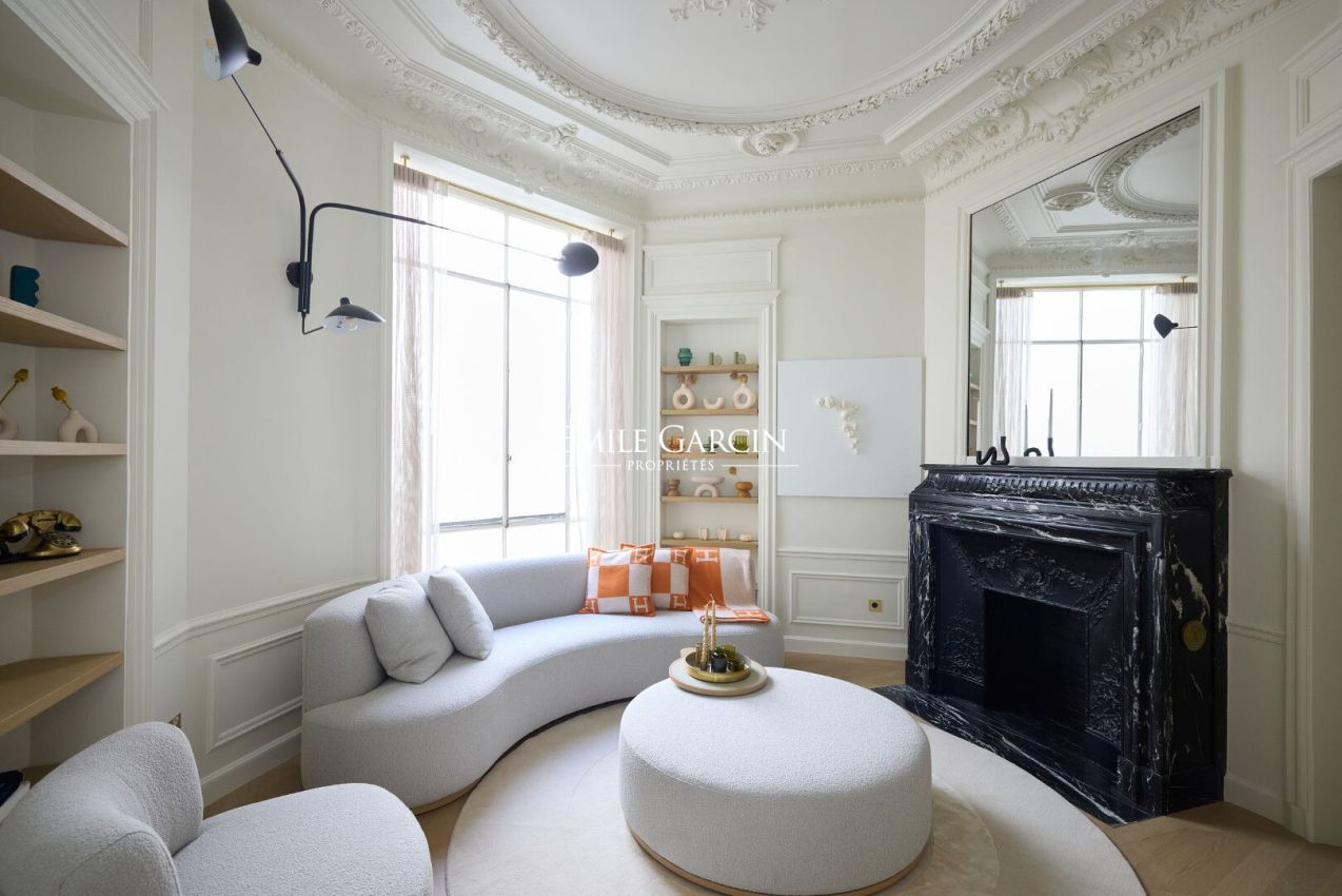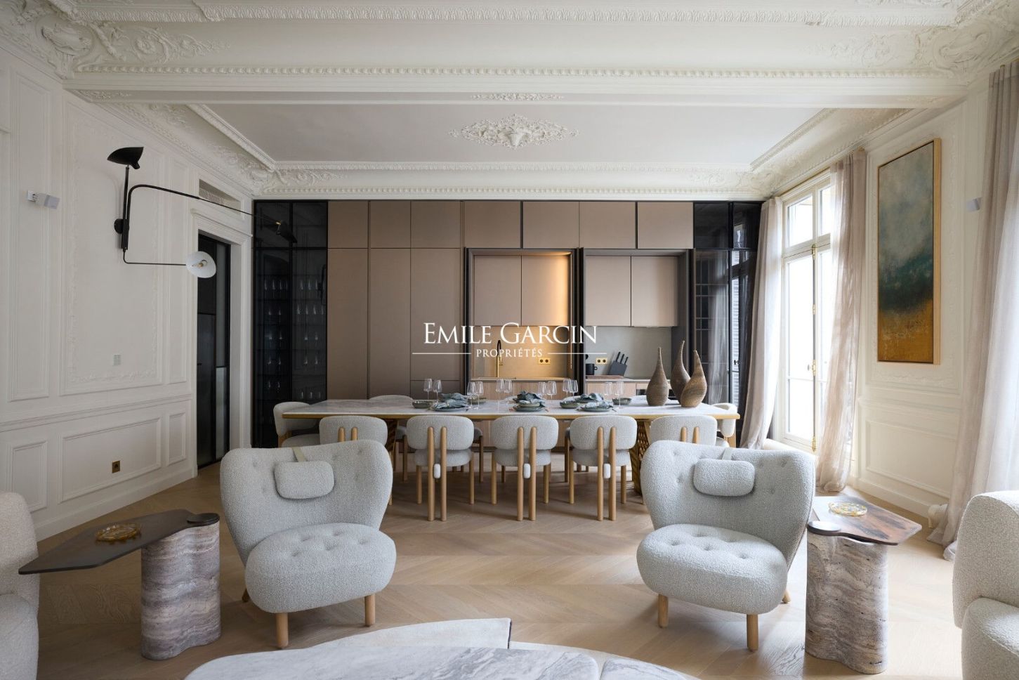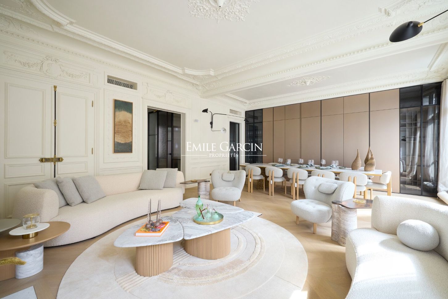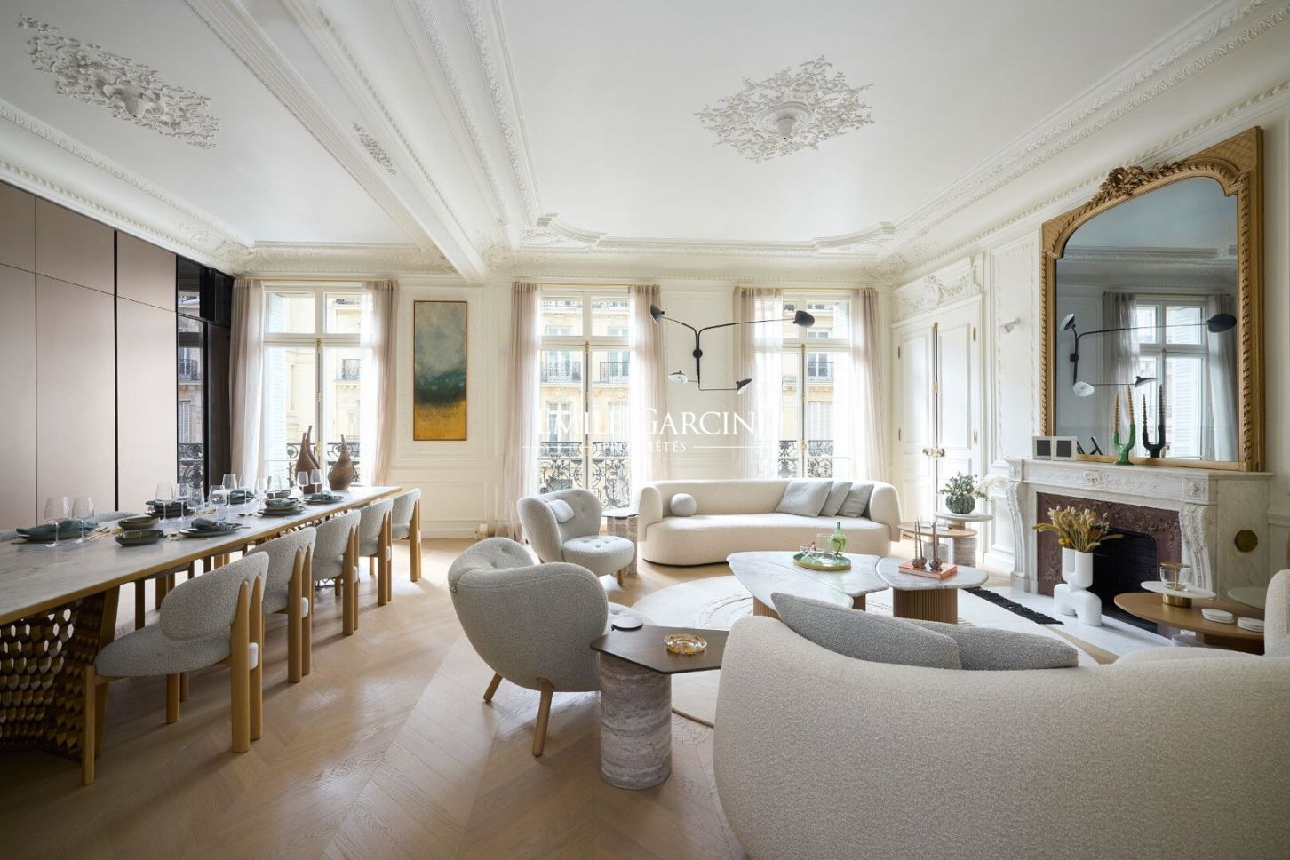 Paris VIII -Golden Triangle - Located in a beautiful Haussmannian freestone building, on the third floor by elevator, this superb apartment of approximately 160sqm has been completely redone by an architect, renovated with noble materials. Offering beautiful light with its southern exposure and benefiting from a beautiful ceiling height of more than 3.30 meters, it consists of an entrance, a large living room, an American kitchen as well as a small fully equipped kitchen, a dining room, a master suite with its bathroom and two bedrooms with a bathroom. Air-conditioned and home automation. A cellar in the annex. Rare