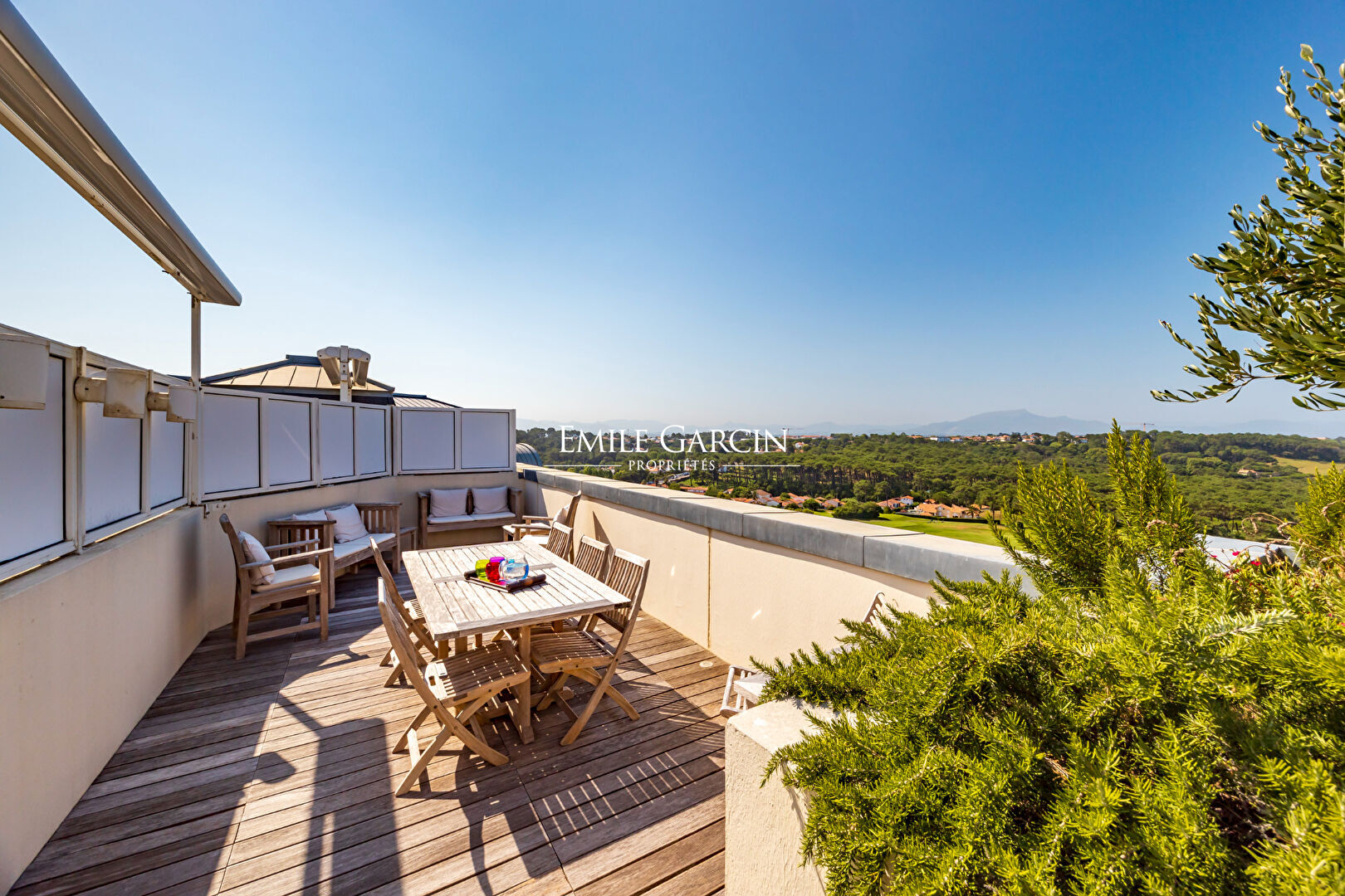 Property located on the top floors of the most beautiful old Art Deco hotel on the Basque coast, overlooking the Ilbarritz golf course just a few steps from the beachfront, 5 minutes from shops and only 10 minutes from the train station and airport. Presenting approximately 126 sq.m of living area (113 sq.m Carrez law), this duplex apartment has been restored and decorated with elegance and taste. The first level consists of an entrance hall with storage cupboards, a separate WC and two ensuite bedrooms, including the master suite, which both offer spectacular views. On the upper floor, a spectacular living room measuring 45 sq.m is bathed in light thanks to its large windows and beautiful ceiling height of over three metres. The separate kitchen also boasts a unique view of the Château d'Ilbarritz. The terrace presents a 270-degree panoramic view taking in the majestic Pyrenees mountain range, from the French Basque Country to the Spanish mountains, as well as the magnificent coastline and the soothing lines of the Biarritz golf course. Thanks to its triple aspect (east, south and west), the apartment is bathed in natural light at all hours of the day. Completely redesigned by a renowned architect, the property offers clean architecture, a high-end finish and a perfect blend of design and comfort. The lighting is equipped with dimmers, while specific lighting highlights the works hanging on the walls. Modern comfort is guaranteed in every detail: videophone, alarm system, safe, Bose audio system in each room, fibre broadband, centralised ventilation. The property is also sold with a private parking space (a second space could be negotiated). Residents also have access to a garden, a large communal heated swimming pool (20 x 12m) and a sunbathing area. It all sits in a spectacular setting with views of the sea and mountains, within the comfort of a private and secure condominium. A truly unique property for lovers of extraordinary real estate.