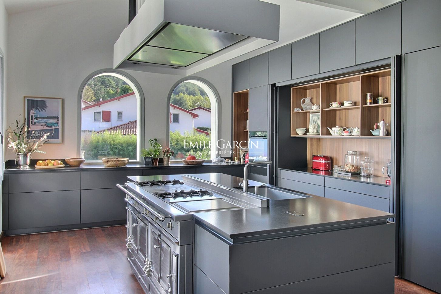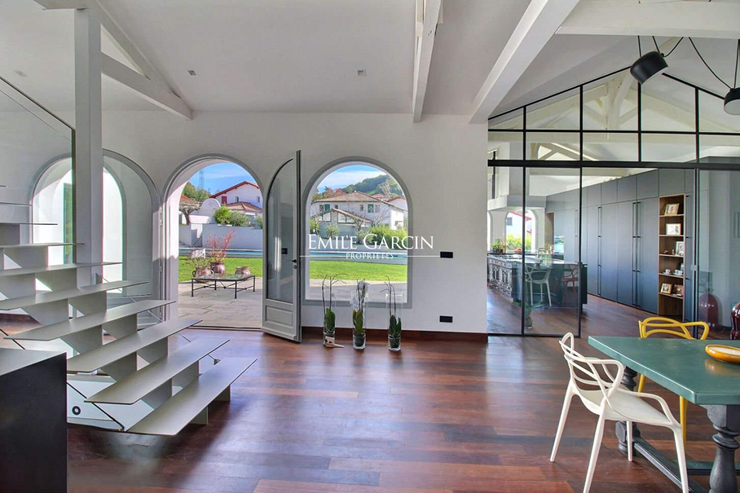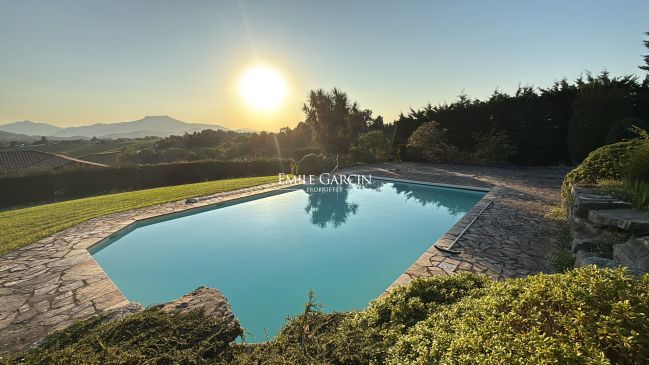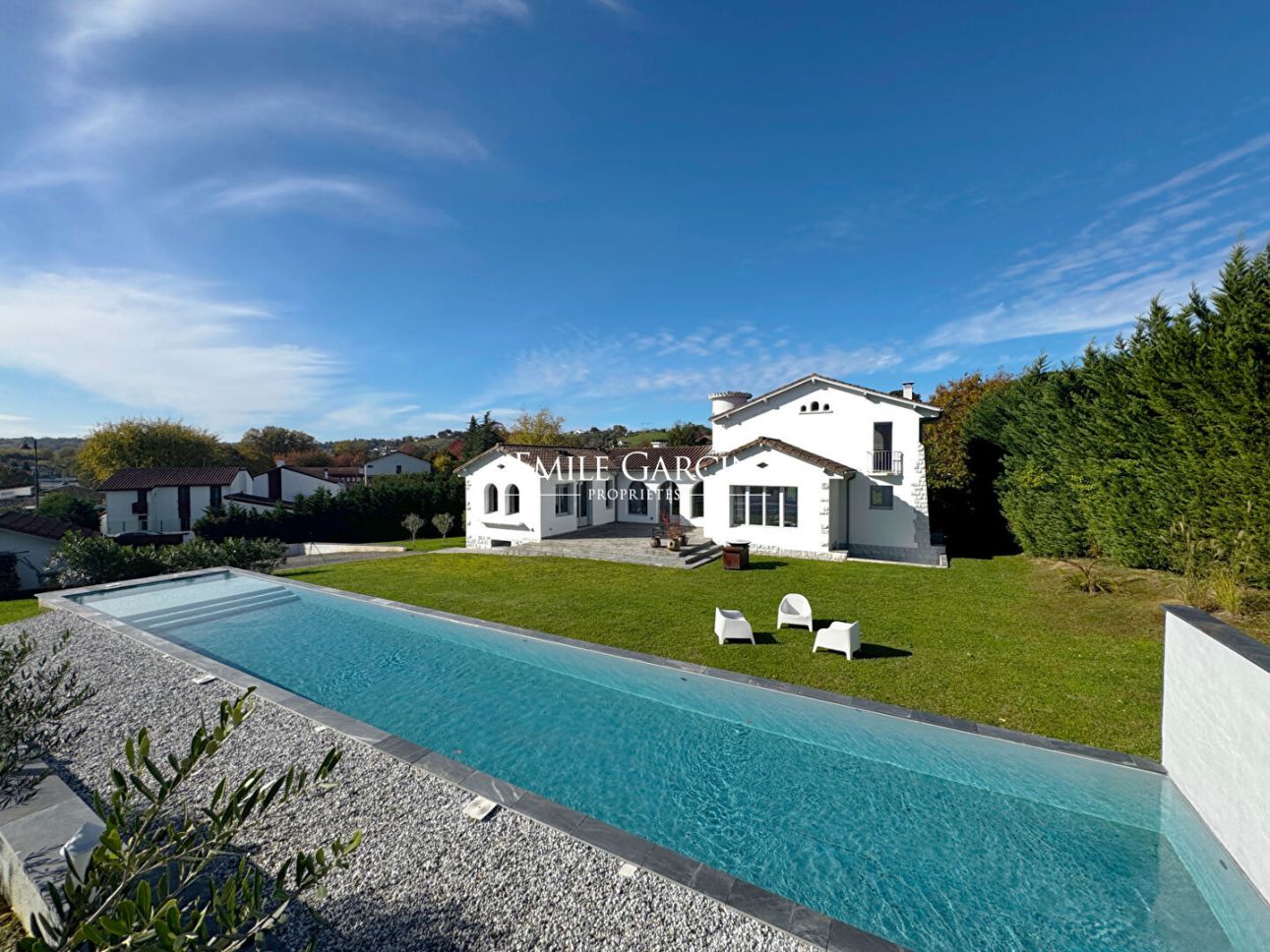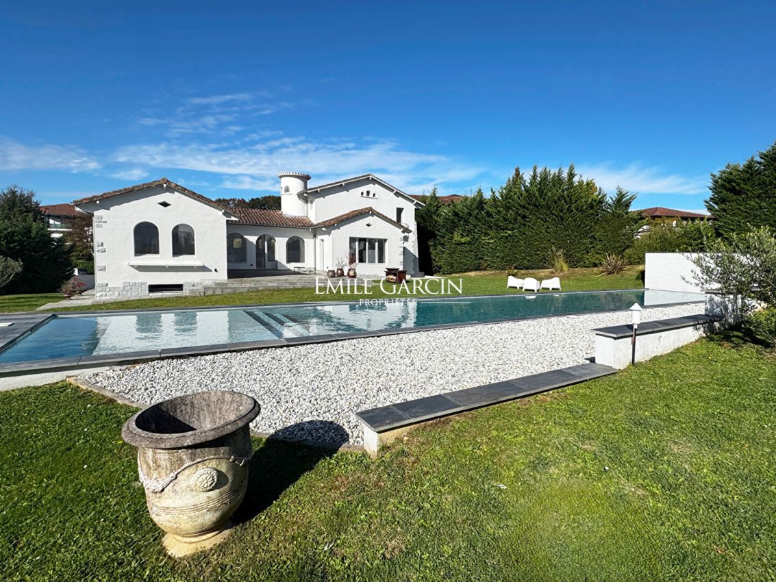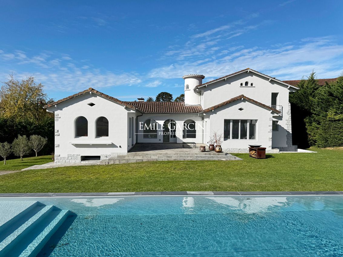 In the heart of the village of Hasparren, this exceptional 337 sq m property boasts a rare location, combining village life with the tranquility of a protected environment. Set within a landscaped garden of 2,139 sq m, just steps from shops and services, this residence embodies the refined Basque lifestyle. Designed by the iconic architect Pavlovsky, this villa unfolds its spaces, orchestrated around a 170 sq m triple reception room that harmoniously connects with an exceptional kitchen. A true gastronomic gem, the kitchen is centered around a prestigious La Cornue range. The clean lines of the white architecture, enhanced by arches, create a perfect harmony between authenticity and confident modernity. The living spaces, bathed in natural light thanks to generous bay windows, reveal cathedral-like volumes with exposed beams. Two fireplaces, one wood-burning for the authentic feel of winter fires, the other gas for contemporary comfort, add a touch of refinement. A superb master suite with its bathroom, opening onto a view of the garden and pool, occupies the entire upper floor. On the garden level, there is an office with ample storage, a laundry room, a dressing room, a shower room, and two impeccably appointed en suite bedrooms, each with its own bathroom and shower room. A separate entrance allows for private entertaining. A garden planted with fruit and olive trees features a 24-meter lap pool, a true asset for both sport and relaxation, blending elegantly into this rare setting in the heart of the city. An outdoor shower completes this exceptional aquatic space. A 50 sq m outbuilding offers multiple possibilities for conversion (pool house, workshop, guest studio), while a garage and parking for five vehicles ensure optimal convenience. This architect-designed villa presents a unique opportunity to acquire an exceptional property in the heart of Hasparren, combining luxurious amenities, spectacular proportions, and a refined lifestyle. Blending Basque authenticity with contemporary modernity, this residence will appeal to discerning buyers seeking an exceptional living environment close to all conveniences.