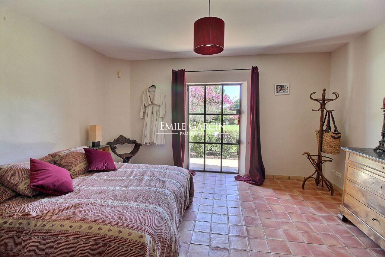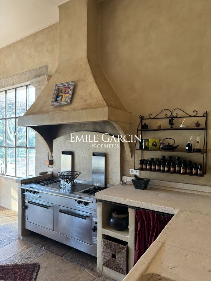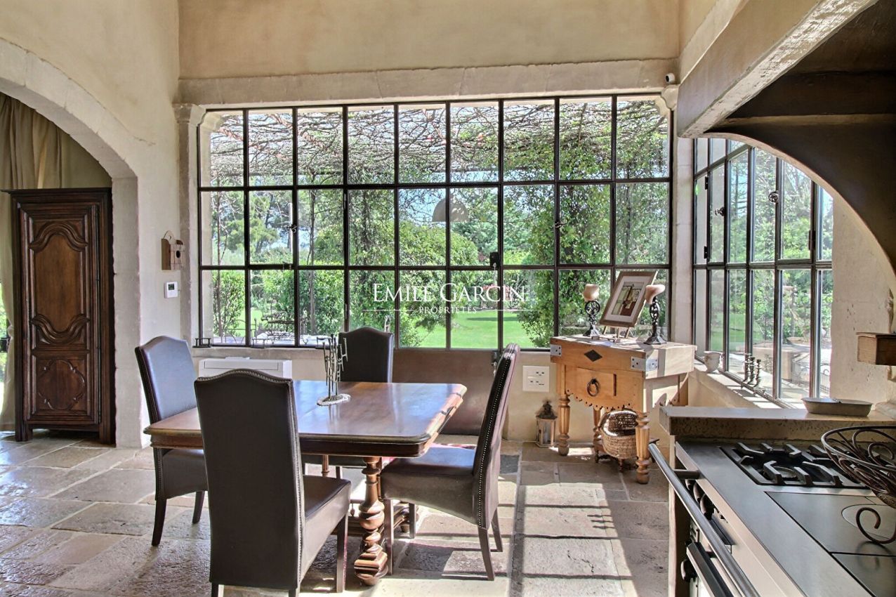 Beautiful stone house idyllically located in the countryside near Saint-Rémy-de-Provence, peaceful and not overlooked. It presents approximately 290 sq.m of living area over two levels, built using high quality construction materials (natural stone paving, large wrought iron windows, old beams, patinas). The spacious reception rooms back onto a terrace and garden. It comprises a dining room, a large living room with high ceiling and fireplace and a typical Provencal kitchen with utility area, as well as six bedrooms, including three at garden level and one in a small adjoining studio. Landscaped garden with swimming pool.