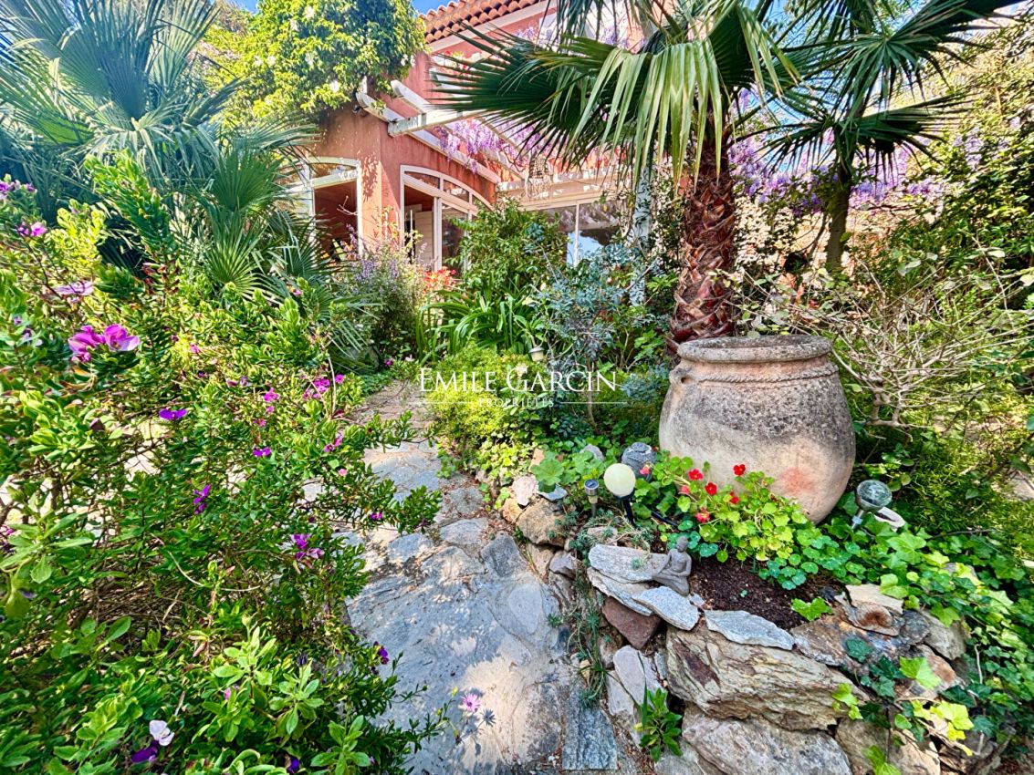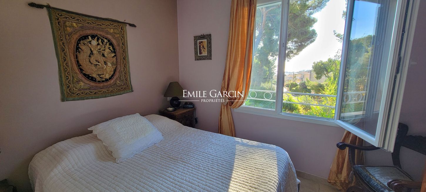 Located 15 minutes by foot from the port and beaches of Bandol, this house presents 100 sq.m of living area and a 20 sq.m garage on 520 sq.m of private grounds (with space for the installation of a swimming pool). The ground floor comprises a living room, a dining room and an adjoining kitchen backing onto a veranda. The first floor is composed of a master suite with tropézienne and two additional bedrooms sharing a bathroom. This south-facing house offers a sea view. The outdoor spaces include two terraces, a lush garden adorned with beautiful Mediterranean flora and a garage partially converted into a bedroom. Cellar of 20 sq.m.