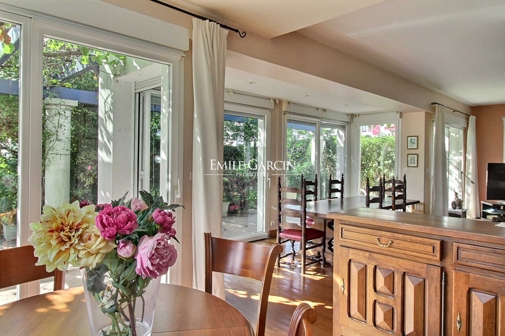 Located in Biarritz, close to the shops of the Saint-Martin district, this house of approximately 230 sq.m stands out for its spacious and bucolic feel. The ground floor features a vast reception area including a living room with fireplace, a dining room and a kitchen-diner. Also on the ground floor are a bedroom with shower room and toilet, a laundry room, a utility room with boiler facilities, and a guest WC. An elevator offers access to the upper floor, which includes a large hallway now converted into a cards room and four bedrooms (two of which have their own shower room), as well as a dressing room and a bathroom. Additional facilities include a large garage.