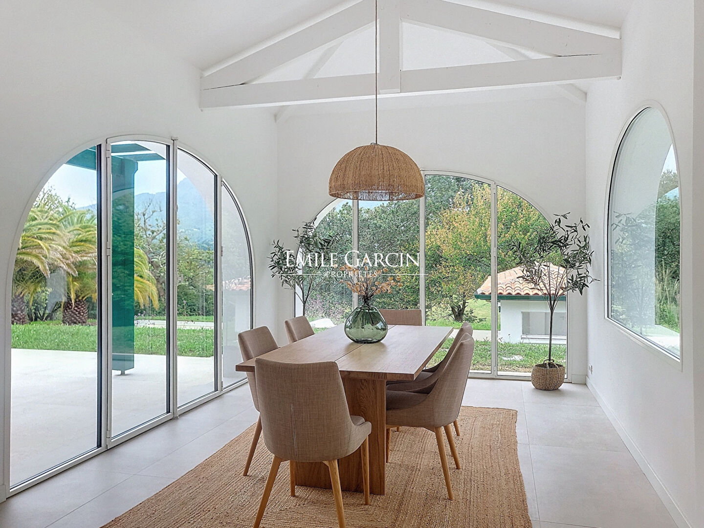 Located in an idyllic rural setting between the countryside and the mountains, within easy reach of the ocean and all local amenities, this unique property presents approximately 300 sq.m of living area. It has been renovated in line with traditional Basque architecture, lending it a sense of character and luxury in an intimate setting. The ground floor comprises an entrance hall, a large reception room with fireplace, an adjoining kitchen equipped with high-end appliances, three ensuite bedrooms, an office, a secure room, a utility room and a guest WC. A large terrace facing the Larrun mountain is the perfect setting in which to relax and unwind. The upper floor offers two additional ensuite bedrooms, one of which also has a hammam. A large balcony affords a delightful view of the mountains and the pool area. It all sits on 8,400 sq.m of leafy landscaped grounds featuring a pétanque area, a swimming pool, a pool house, a sauna and a Nordic bath, perfect for days and evenings spent among friends and family. A separate double garage is equipped with a high-speed charging station. A fully renovated outbuilding presents a living room, an open kitchen and a bedroom (perfect for use a guest accommodation, a caretaker?s lodgings or service quarters). A unique property, tucked away in lush green surroundings, combining serenity, magnificent views and a high-end modern finish.