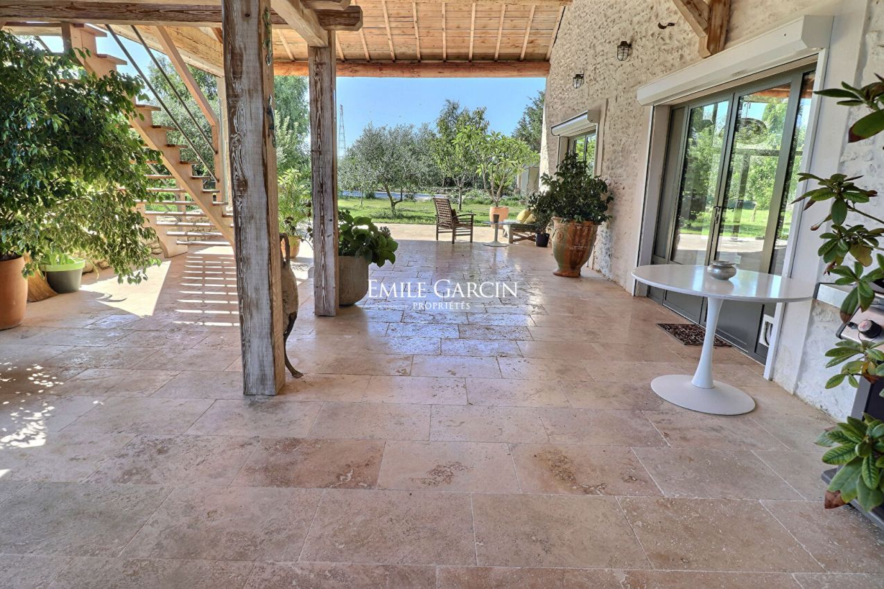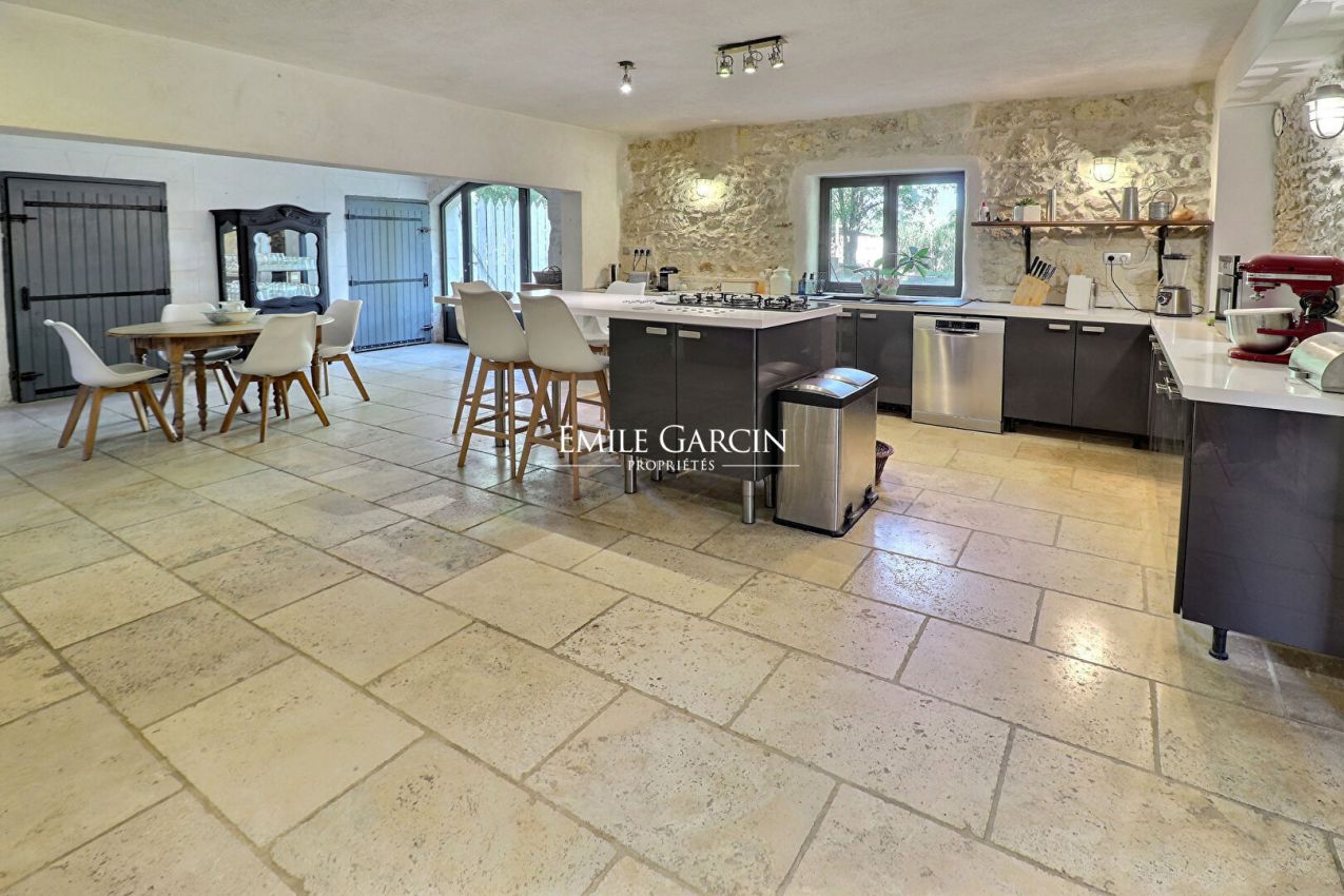 Located a few minutes from the village of Vallabrègues, a charming enclave in the Gard serving as the gateway to the Bouches-du-Rhône region, this magnificent and perfectly maintained stone farmhouse stands out for its spaciousness, light and authenticity. The vast main building comprises two large bright ensuite bedrooms, a functional dressing room, an office, a north-facing modern fitted kitchen backing onto a vegetable garden, an adjoining utility room/pantry, and a splendid living room of nearly 80 sq.m with large windows backing onto a garden and covered terrace with dining facilities. On the upstairs floor, accessible via two independent entrances, you will find: to the west, an apartment of approximately 70 sq.m comprising two bedrooms, a bathroom with WC, and a kitchen area, ideal for accommodating family friends or as a rental property; and to the east, an impressive 100 sq.m yoga room with great potential (suitable for use as an artistic workshop, a reception room or a wellness area), plus a bedroom and a shower room/WC. Outside, the relaxing garden of approximately 3,600 sq.m is planted with trees and flowers. There you will also find a large covered terrace, a beautiful swimming pool, a pool house, visitor parking facilities and a hangar. This unique property presents a winning blend of Provençal charm, comfort and potential. It would make the perfect residence for a large family, or could be converted into a gîte or other business premises.