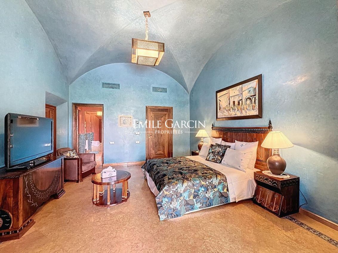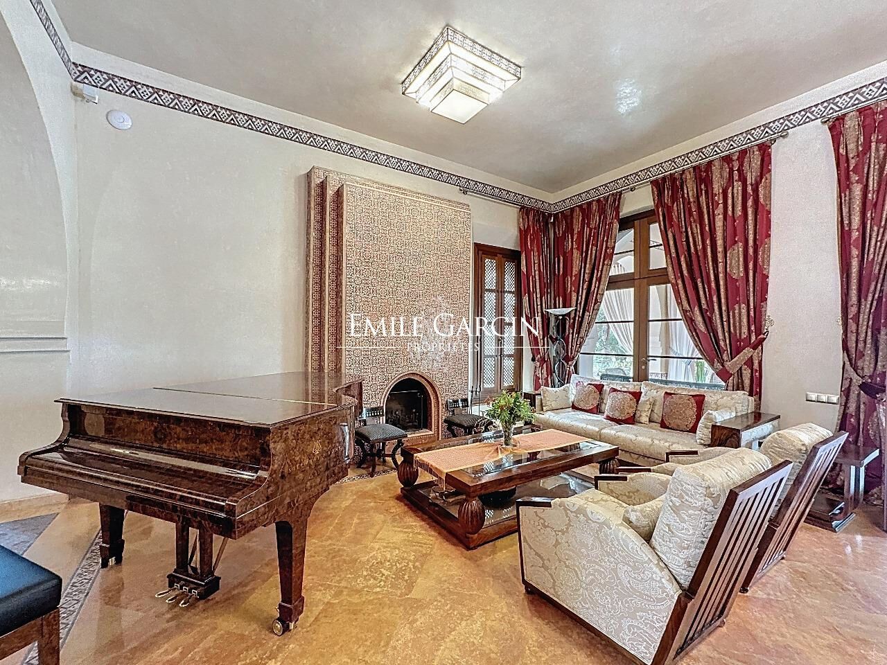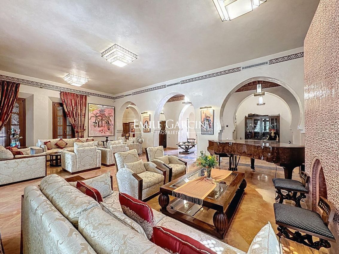 Located in the heart of the Palmeraie, this exceptional property presents 900 sq.m of living area on 36,500 sq m of leafy landscaped grounds. Designed with meticulous adherence to traditional Moroccan craftsmanship, this palace offers high-end materials and an exquisitely elegant finish: marble, authentic zellige tiles, carved cedar ceilings, solid walnut woodwork, and tadelakt walls. Every room exudes a unique Moorish sense of authenticity and refinement. The main property includes a living room backing onto the garden and sunbathing area, a lounge with a fireplace, a dining room, a leafy patio with central fountain, a fully equipped kitchen and pantry, four ground-floor suites and a separate upstairs apartment with spacious suite, office, dressing room and bathroom. In the grounds, you will find a hammam, a separate pavilion housing a gym, landscaped terraces and a heated swimming pool. The garden features winding paths lined with lush, abundant vegetation including majestic palm trees, Washingtonia palms, olive trees, fruit trees and a collection of cacti. The property also includes staff quarters and high-end facilities such as underfloor heating, ducted air conditioning, a home automation system and technical rooms. Presenting the perfect blend of prestige, intimacy and accessibility, this unique property offers a prime location in the heart of the Palmeraie district of Marrakech.