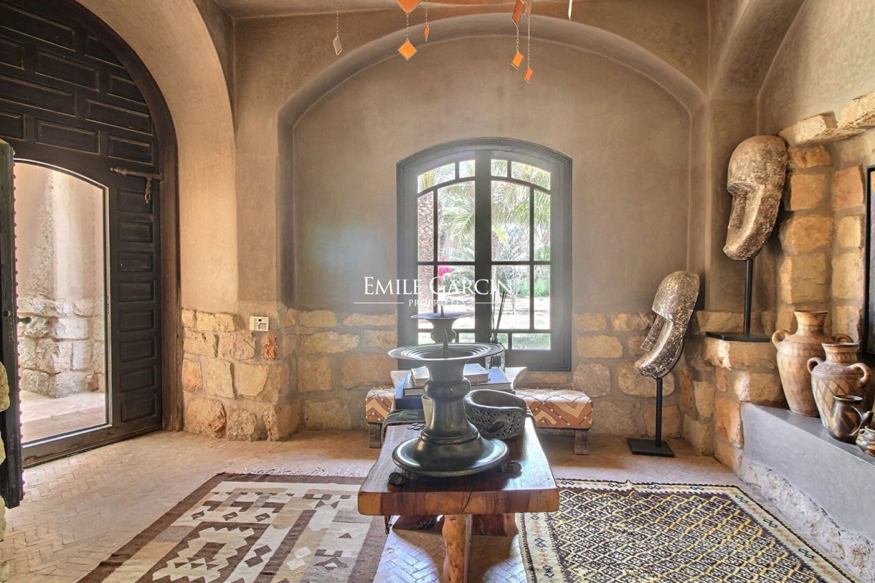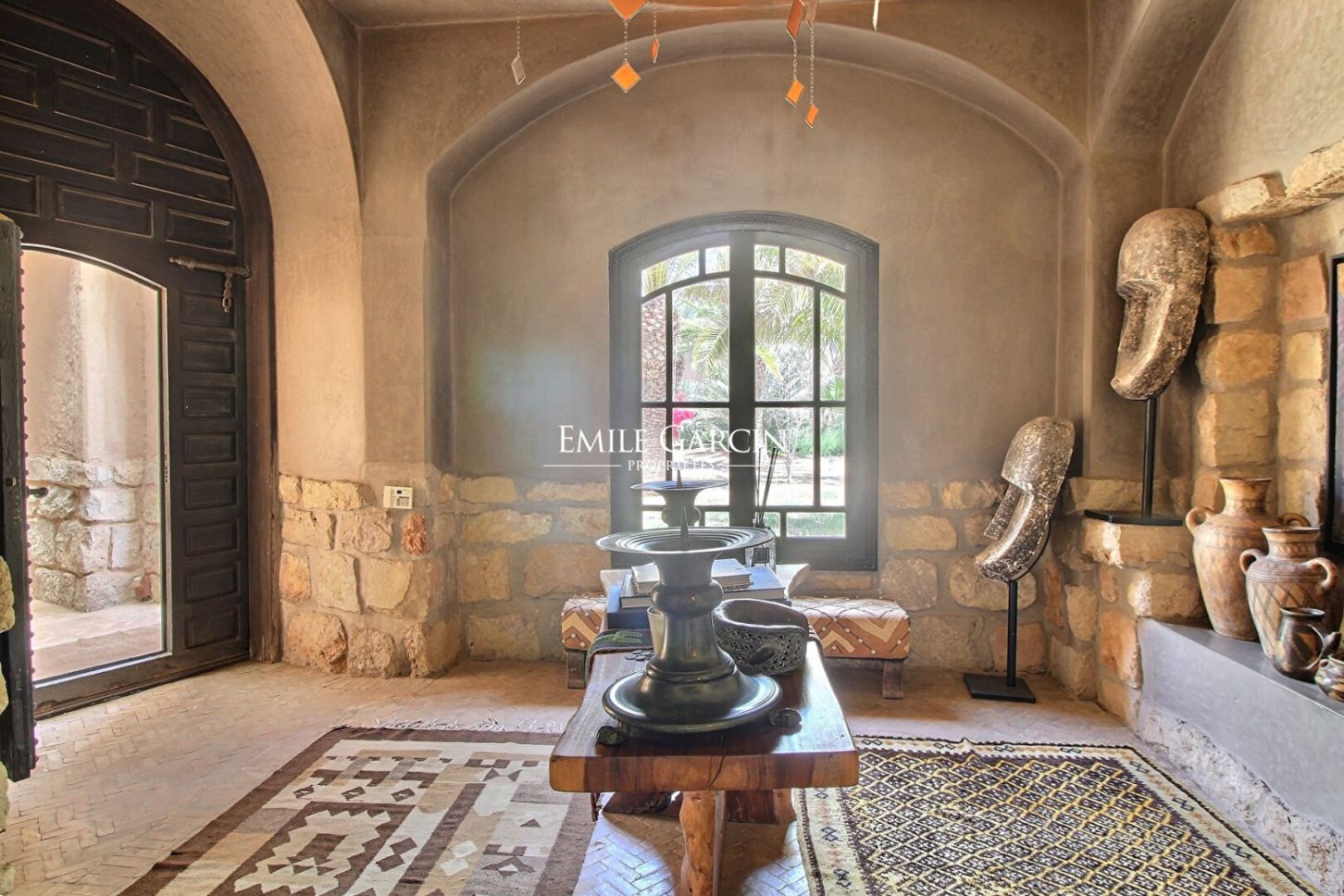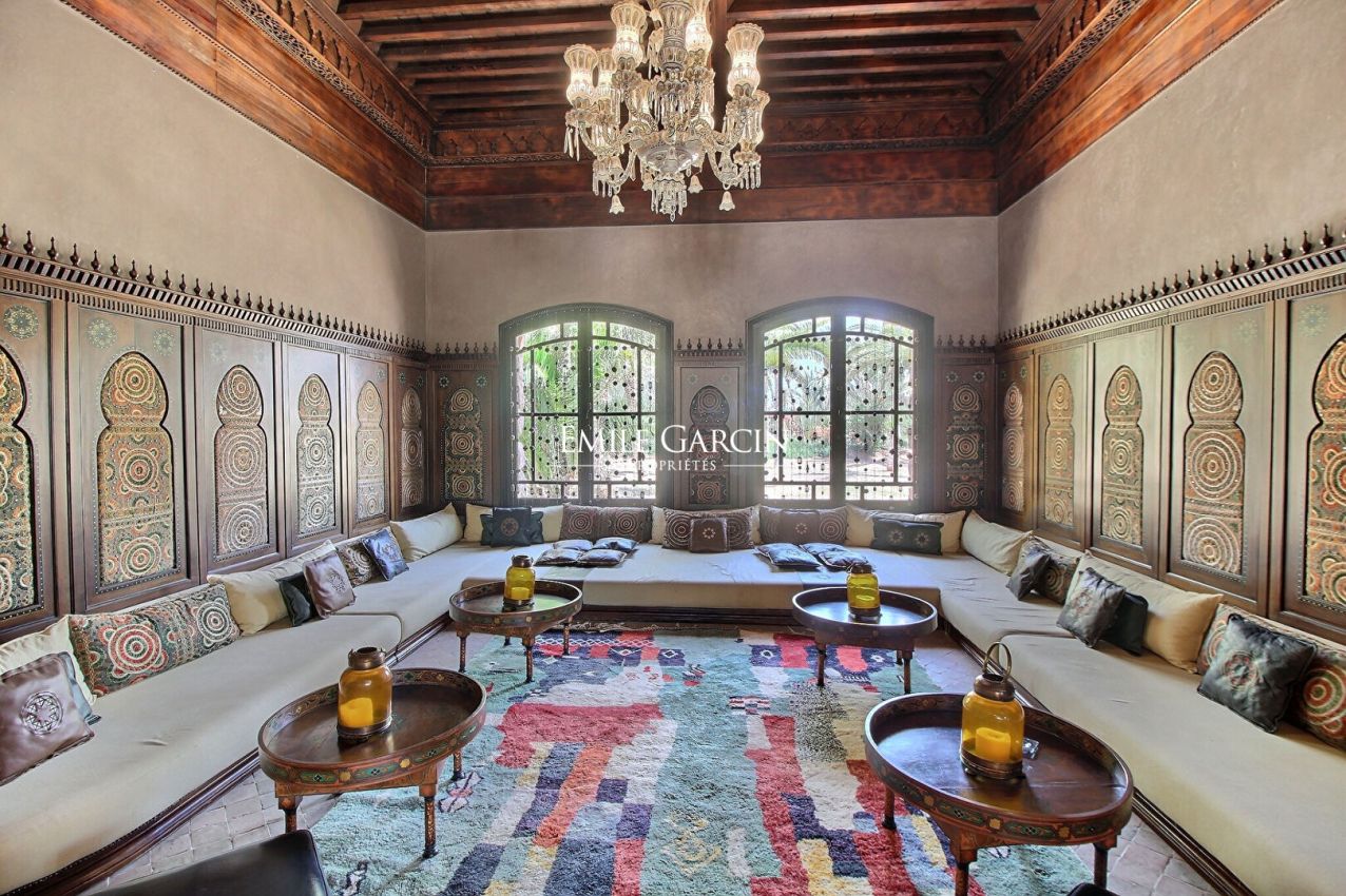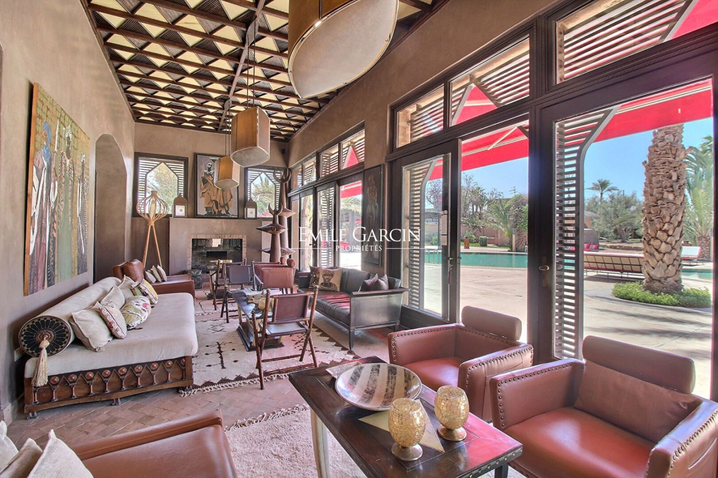 Located in the heart of the Palmeraie district of Marrakech, this Moorish-style property presents 1,200 sq.m of living area on 1 hectare of private grounds. The property offers several reception areas including a TV lounge, a dining room, a lounge with fireplace and a library overlooking the garden. There are four suites on the ground floor, as well as a superb master suite upstairs equipped with a lounge with fireplace and a private terrace affording a beautiful view of the surroundings. In the basement, there is a wellness area with hammam and massage room and a home gym, as well as staff accommodation. Additional facilities include a large furnished terrace with outdoor fireplace, an infinity pool and a pool house. Sculpted and vaulted ceilings and walls. Exceptional architecture. Breathtaking views of the Atlas Mountains.