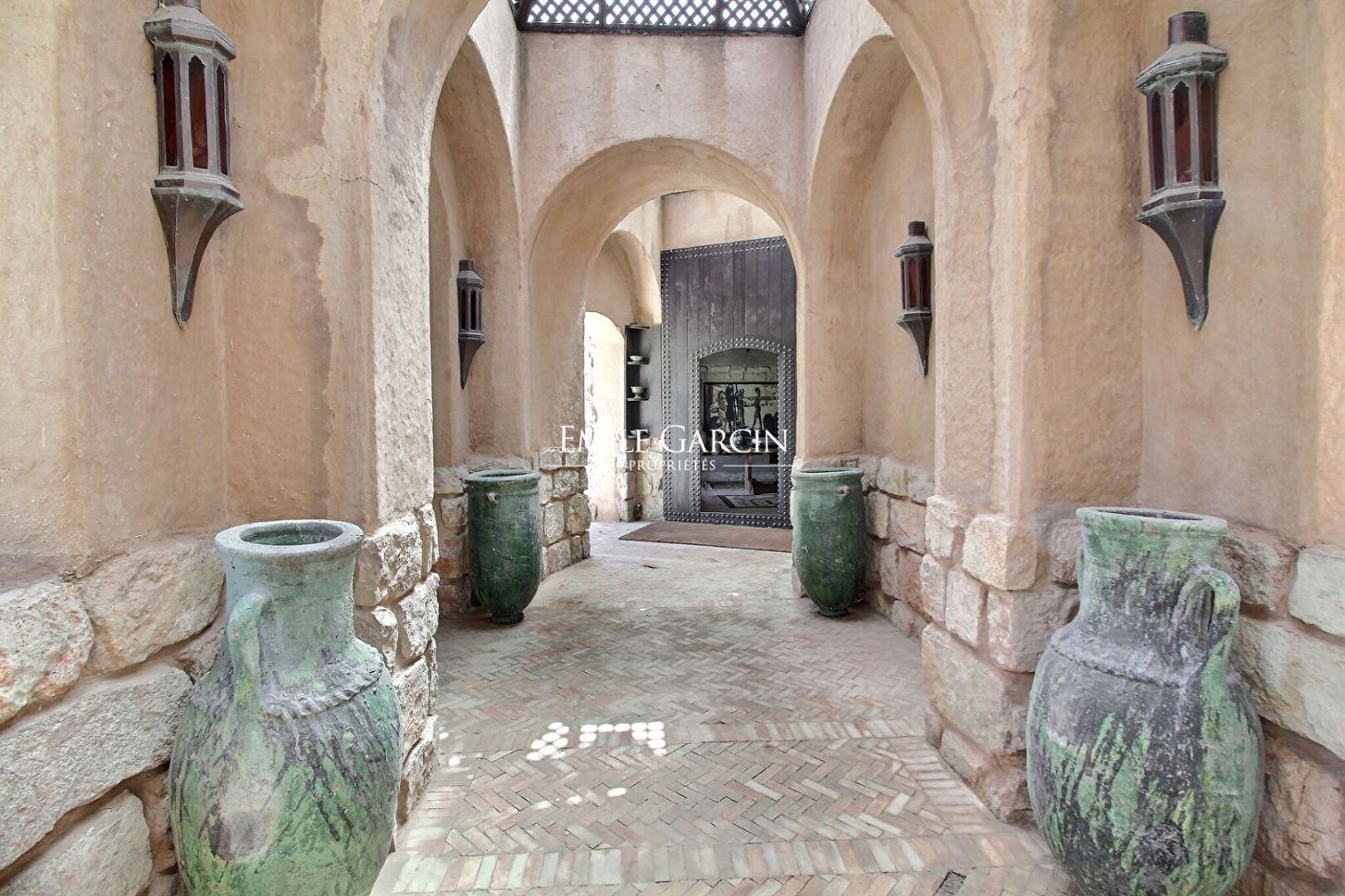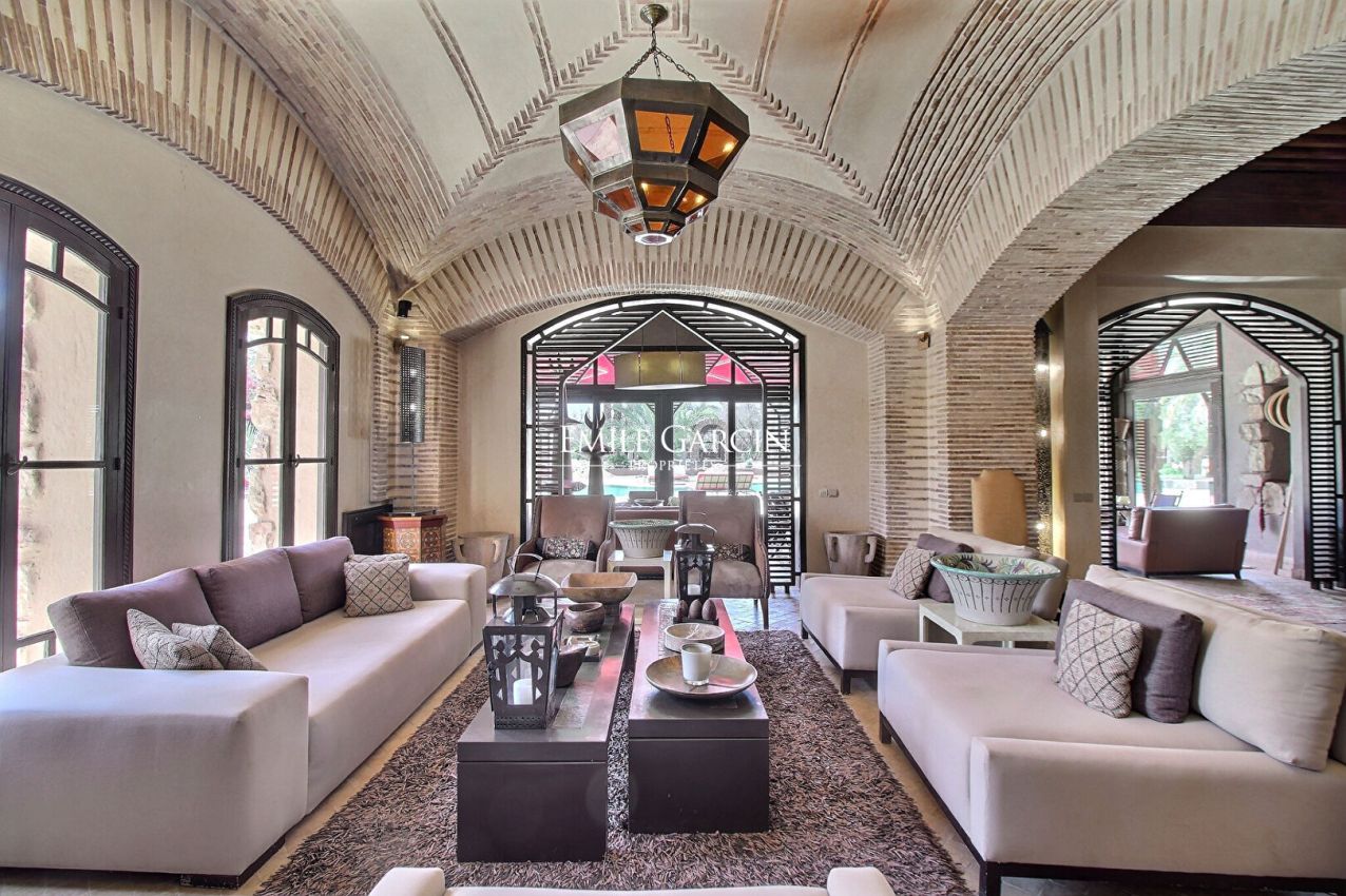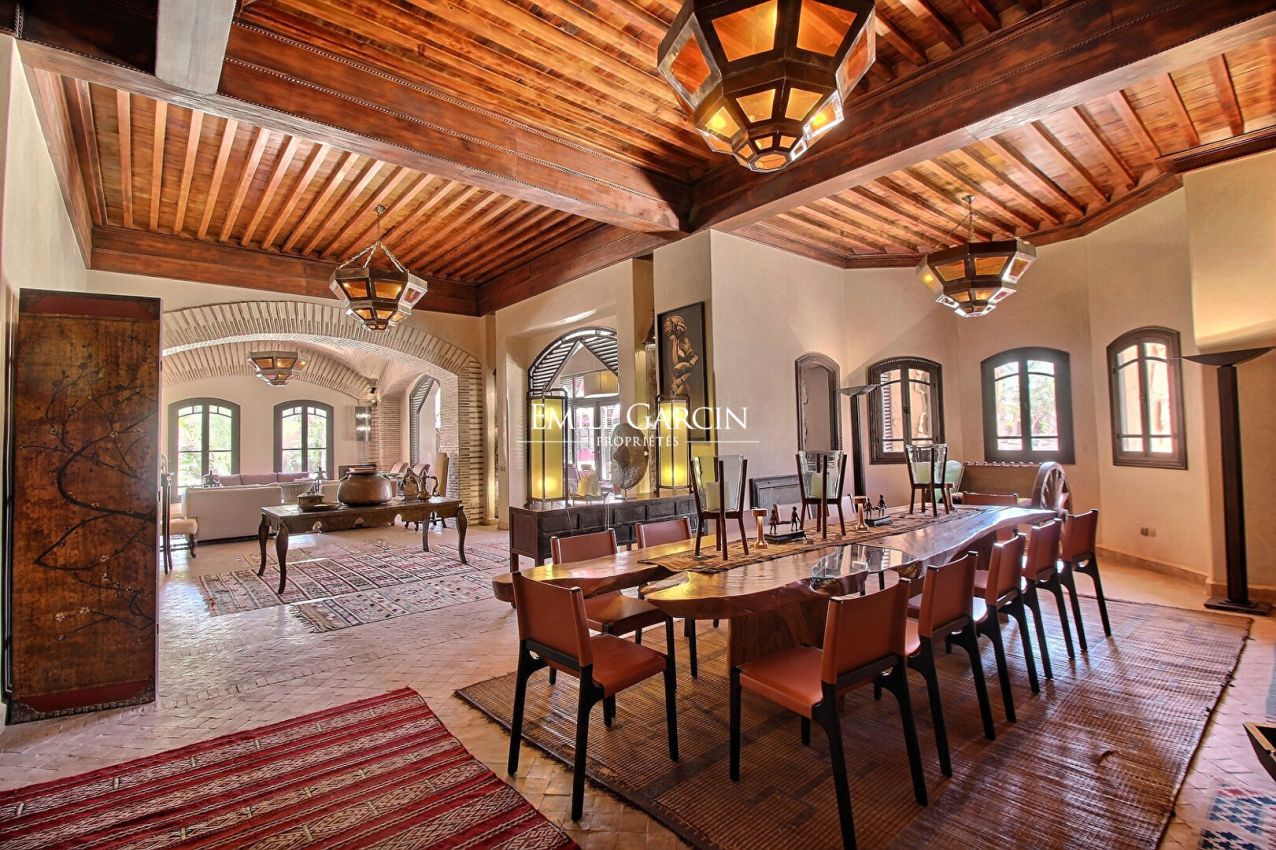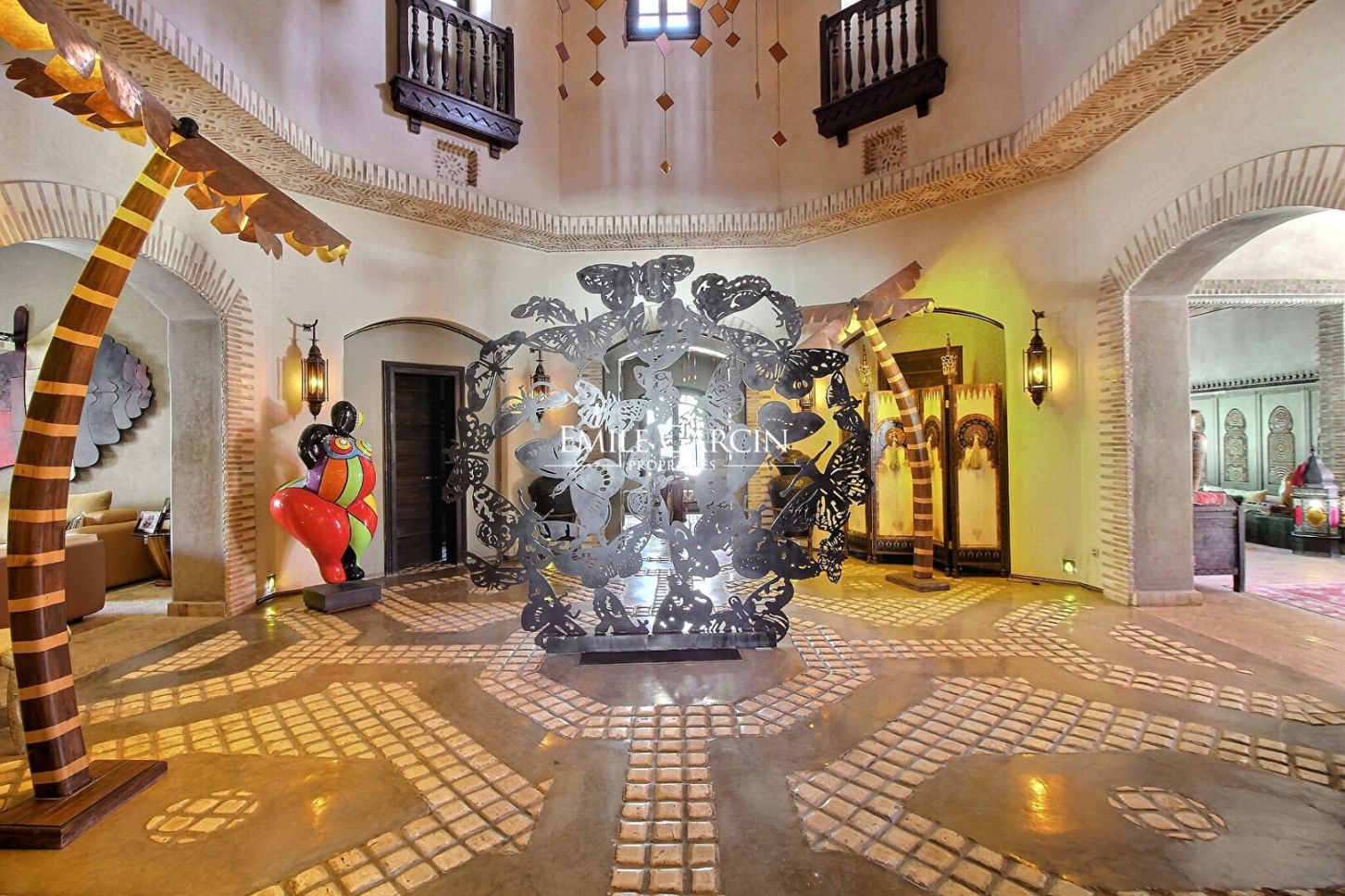 Located in the heart of the Palmeraie district of Marrakech, this Moorish-style property presents 1,200 sq.m of living area on 1 hectare of private grounds. The property offers several reception areas including a TV lounge, a dining room, a lounge with fireplace and a library overlooking the garden. There are four suites on the ground floor, as well as a superb master suite upstairs equipped with a lounge with fireplace and a private terrace affording a beautiful view of the surroundings. In the basement, there is a wellness area with hammam and massage room and a home gym, as well as staff accommodation. Additional facilities include a large furnished terrace with outdoor fireplace, an infinity pool and a pool house. Sculpted and vaulted ceilings and walls. Exceptional architecture. Breathtaking views of the Atlas Mountains.