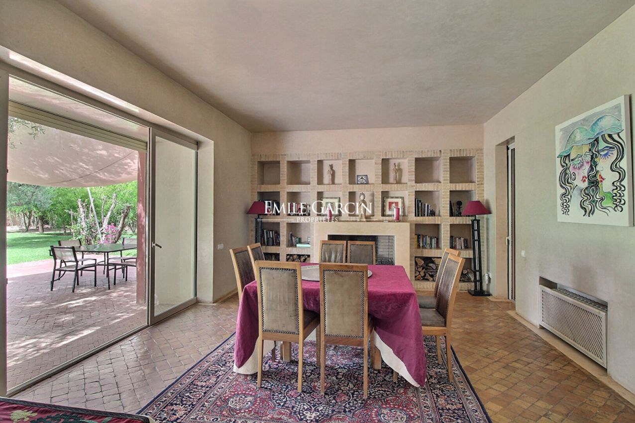 Surrounded by an orchard and olive grove just 10 km from the centre of Marrakech, this stunning property presents 700 sq.m of living area on 6,000 sq.m of private grounds. It features a spacious reception room with fireplace and dining area backing onto the garden, a TV lounge, and six beautiful suites with private bathrooms and dressing rooms. Additional facilities include a 25-metre outdoor swimming pool and a gym with heated indoor plunge pool and hammam. Gas central heating. Breathtaking views of the Atlas Mountains. A truly charming property.