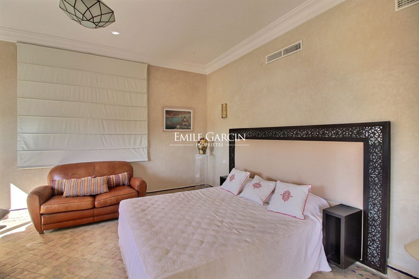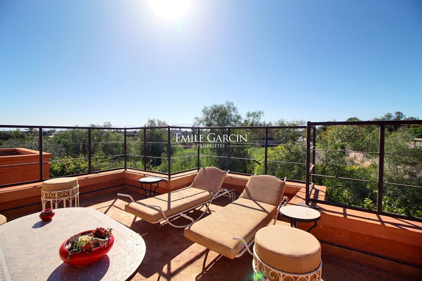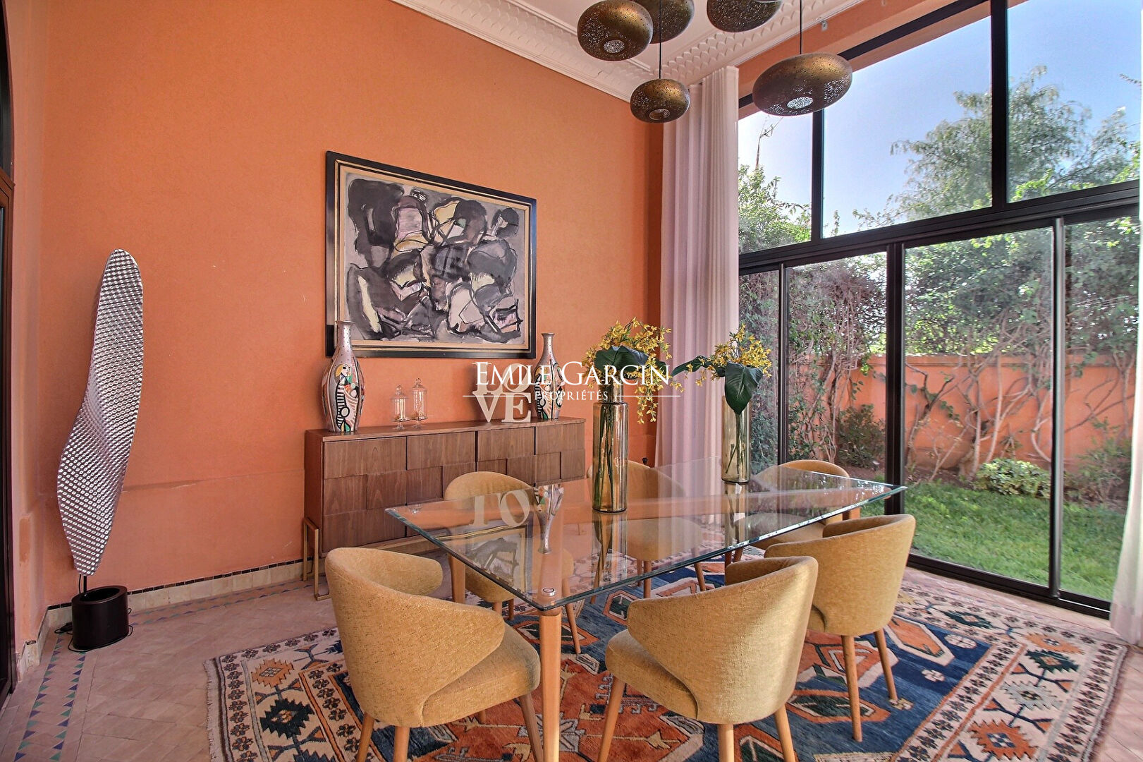 Located on a golf resort, this magnificent villa presents a harmonious style blending modernity, Moorish inspiration and a high-end finish. Offering 300 sq.m of living area on 900 sq.m of private grounds, the property comprises: a reception room with a fireplace, a dining room, a fully equipped modern kitchen, three ground-floor bedrooms, and an upstairs master suite with a furnished terrace and stunning views of the Atlas Mountains. Outside, you will find a lounge area, a relaxation space and a swimming pool. Additional facilities include a basement housing a utility room, a two-car garage and staff quarters. This exceptional property represents an ideal opportunity for a primary home or secondary residence combining comfort and refinement in an enchanting setting with views of the Atlas Mountains.