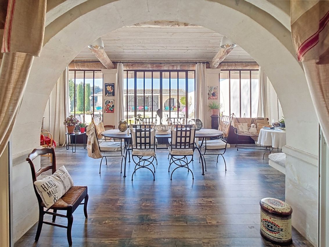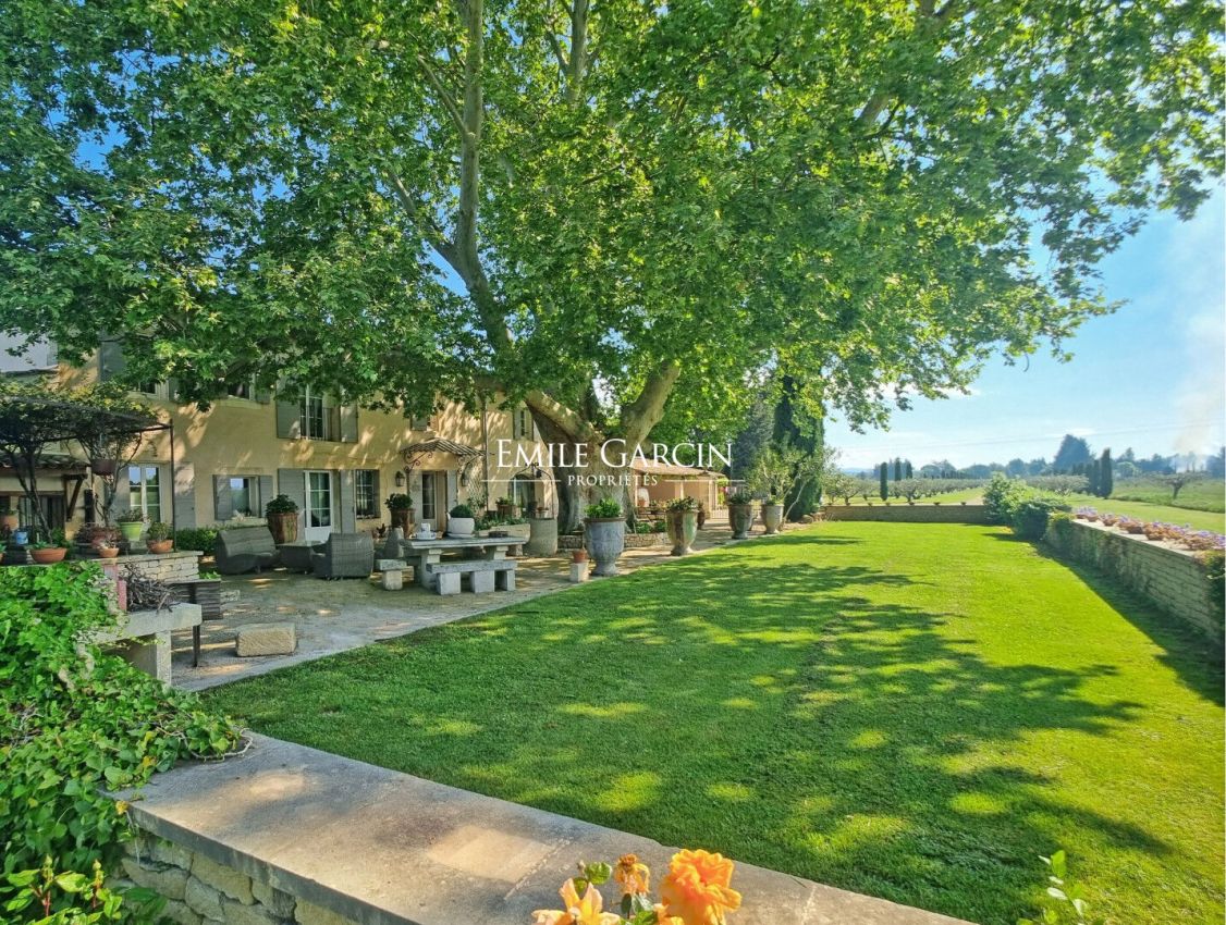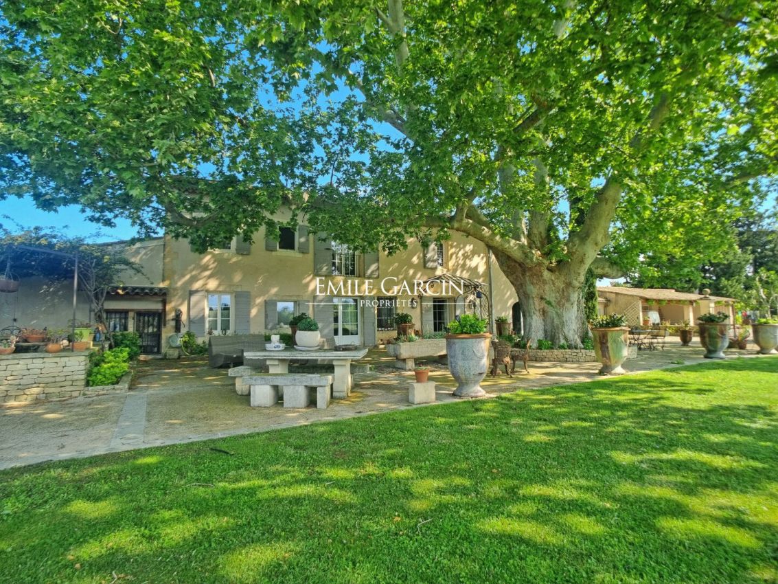 Magnificent 19th-century property on 4.7 hectares of land equipped with swimming pool, garage, shed, and stables, for sale near L'Isle-sur-la-Sorgue in the Vaucluse region. Peacefully located in the countryside, this authentic stone farmhouse was renovated in 2007. Retaining all its period charm, it presents a living area of ??over 300 sq.m spread across the main house and an outbuilding. Upon entering the interior courtyard of the farmhouse, you will be won over by the magnificent plane tree, approximately 400 years old, providing natural shade in the summer. The ground floor consists of a welcoming living room with a wood-burning stove, a fitted kitchen, a large 47-sq.m dining room, a vast 52-sq.m living room backing onto a 30-sq.m veranda facing the swimming pool. Upstairs, you will find a bright 27-sq.m master suite with a large private bathroom, four other bedrooms and two shower rooms. Additional facilities include laundry rooms, a boiler room, a cellar, a large 67-sq.m garage, an 86-sq.m vehicle shelter, a 130-sq.m shed, two horse boxes and a tack room. The outbuilding has been converted into a 60-sq.m pool house consisting of a living room, a kitchen, a bedroom and a shower room. The 47,000 sq.m of private plot of land features an olive grove (for olive oil production) and a meadow for horses, plus a majestic heated swimming pool (15 x 7m) with counter-current swimming system. Several boreholes supply the property. Geothermal heating, fireplace, wood stove, reversible air conditioning, solar panels, double glazing, automatic watering system, automatic gates, alarm, septic tank. The location is in the countryside and close to the villages of the Luberon: 5 minutes from the A7 motorway, 30 minutes from Avignon TGV station, and 45 minutes from Marseille Provence international airport.