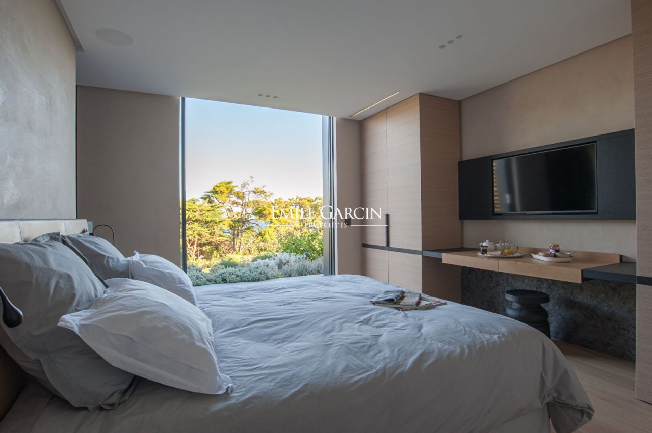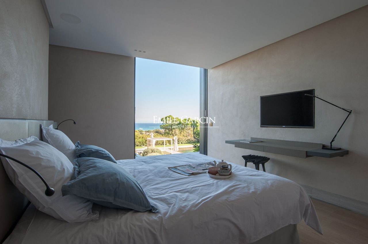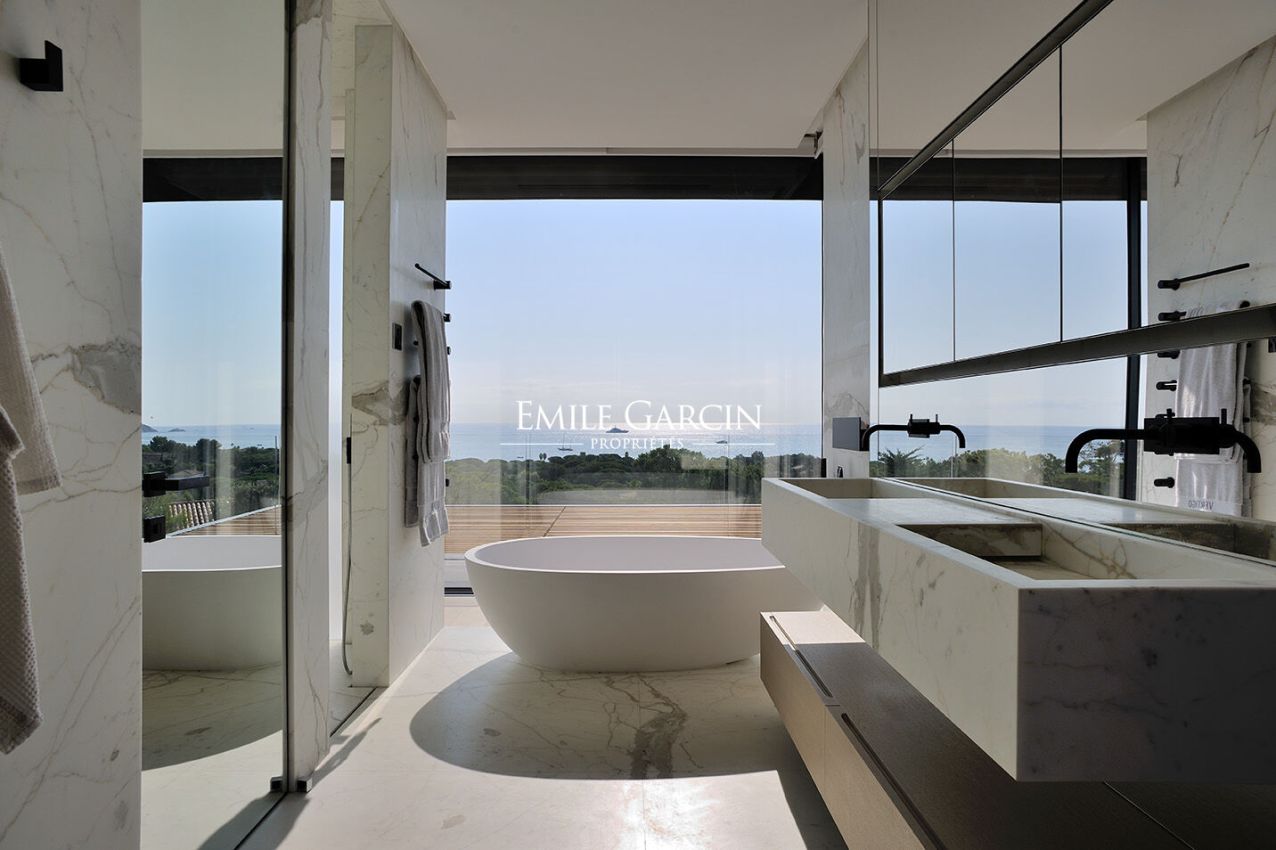 Located in the most exclusive area of Ramatuelle, overlooking the Bay of Pampelonne, this modern villa presents 500 m² of spacious living area with a breathtaking panoramic sea view. Particular attention has been paid to the choice of high quality construction materials. It offers exceptional levels of comfort and luxury facilities. The ideal setting for holidays with family or friends. Furnished pool house. Heated mirror pool. Petanque court. Two home cinemas. Hammam. Home gym. 6 bedrooms, 6 bathrooms. Service apartment (two bedrooms, one bathroom).