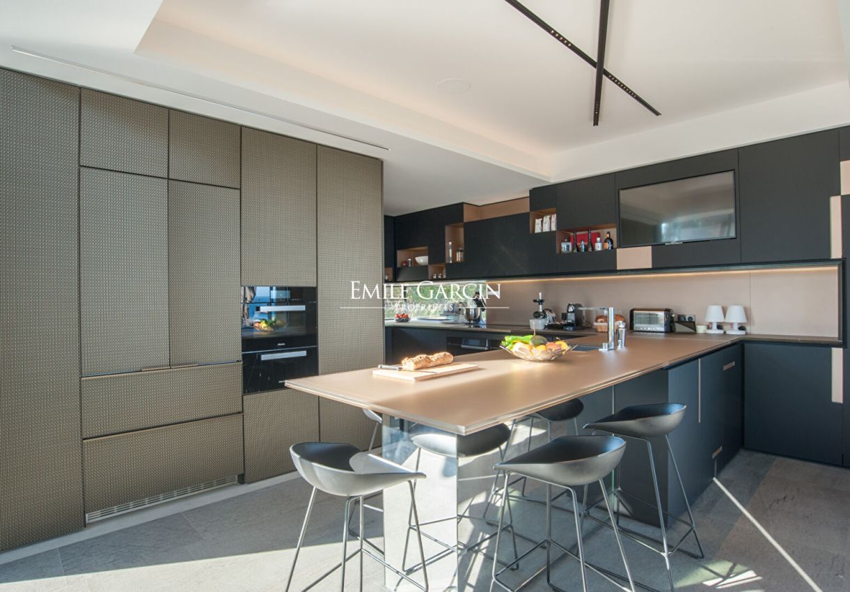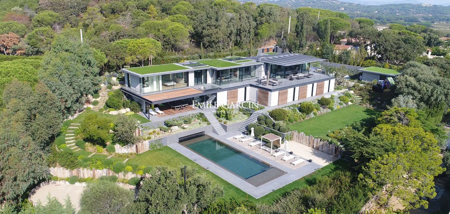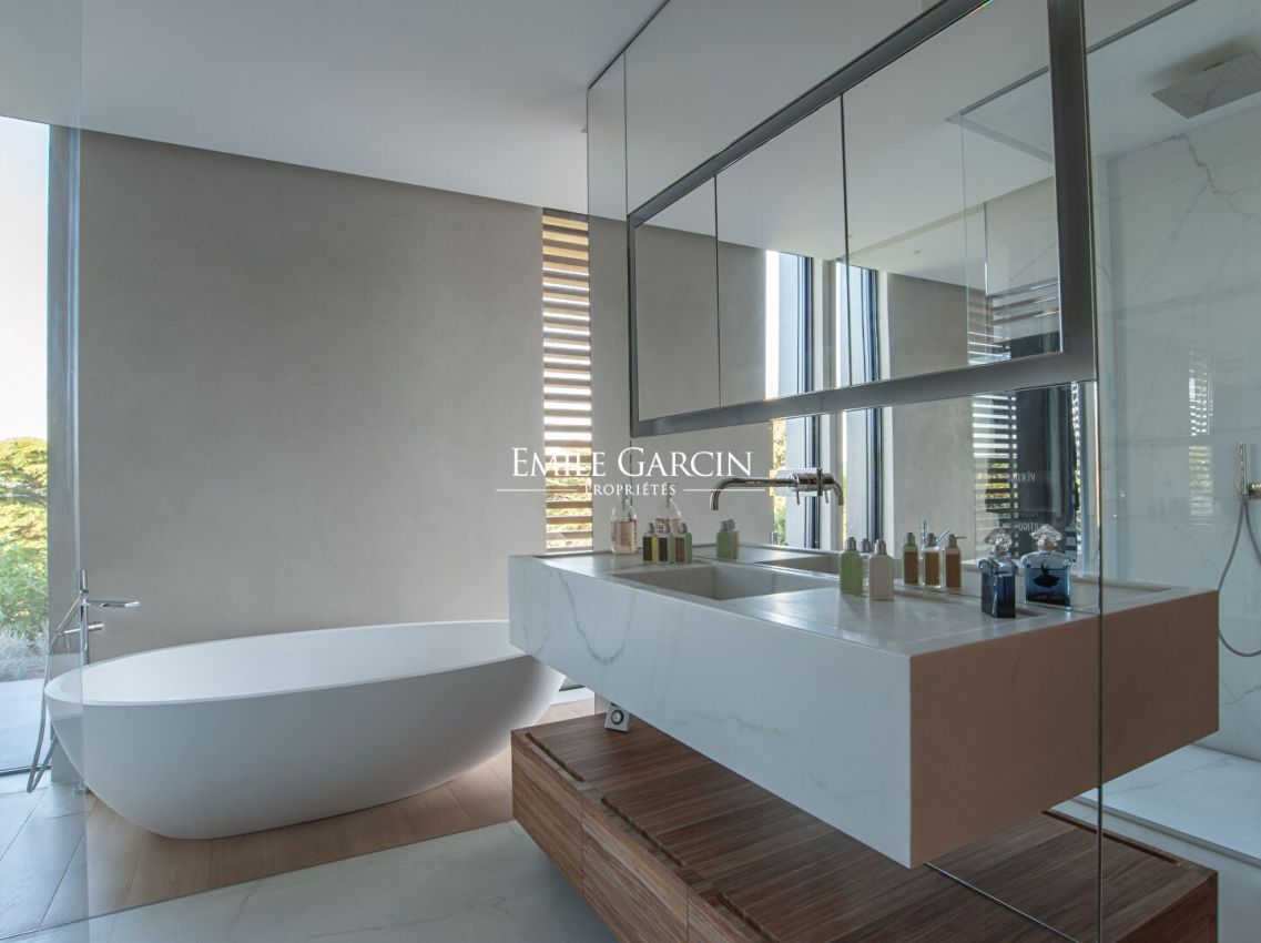 Located in the most exclusive area of Ramatuelle, overlooking the Bay of Pampelonne, this modern villa presents 500 m² of spacious living area with a breathtaking panoramic sea view. Particular attention has been paid to the choice of high quality construction materials. It offers exceptional levels of comfort and luxury facilities. The ideal setting for holidays with family or friends. Furnished pool house. Heated mirror pool. Petanque court. Two home cinemas. Hammam. Home gym. 6 bedrooms, 6 bathrooms. Service apartment (two bedrooms, one bathroom).