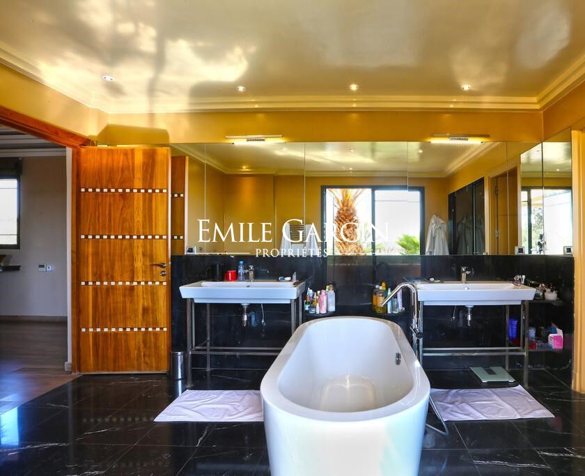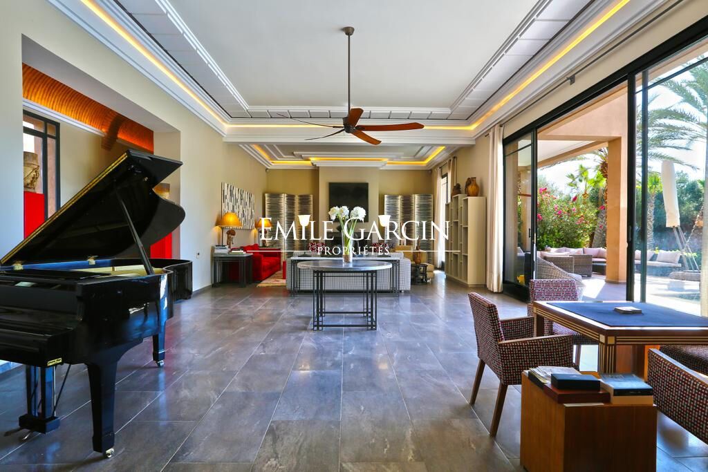 Stunning villa of 950 sq.m idyllically located next to a golf course, just a few minutes from Marrakech. Seven large bedrooms with ensuite bathrooms, including a 120 sq.m master suite and a child's bedroom with separate beds. Boasting a triple living room, this bright and tastefully decorated house is arranged around a central patio. Large heated swimming pool, hammam and massage room, small home gym. Sleeps 16. Nightly rates start from 2500 EUR.