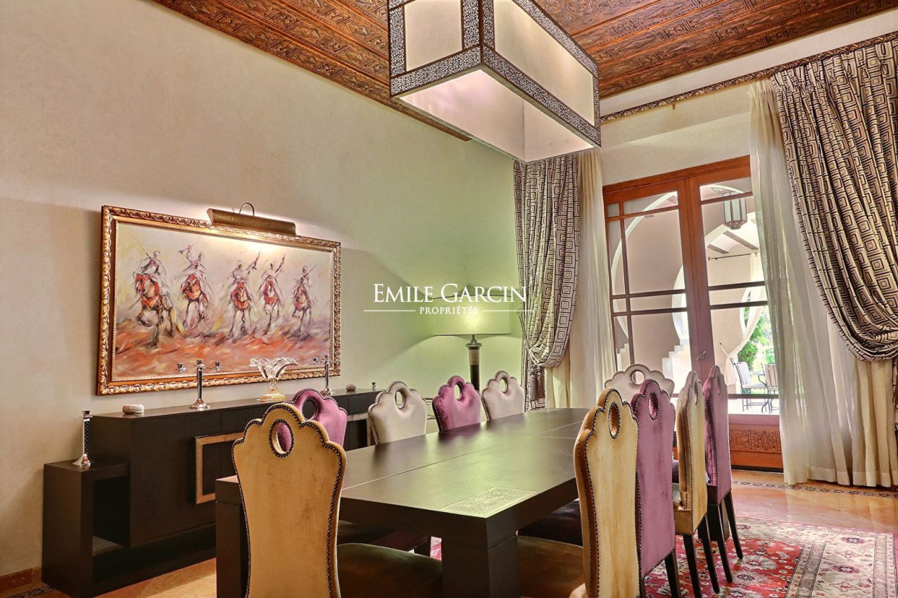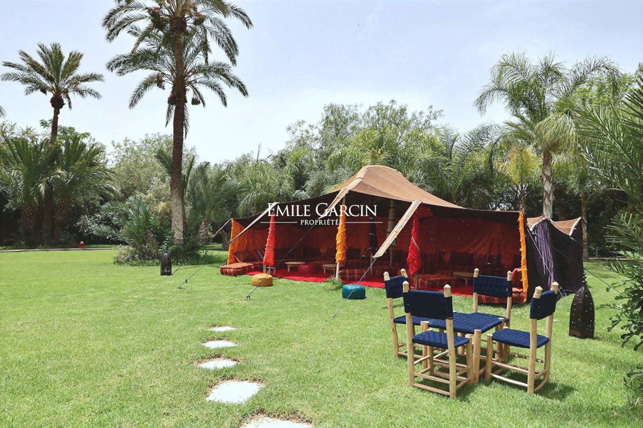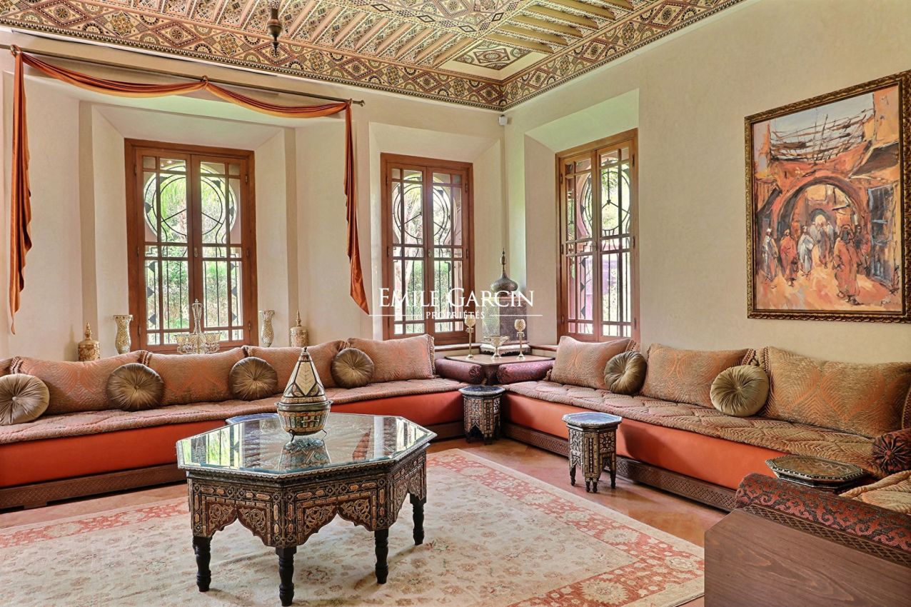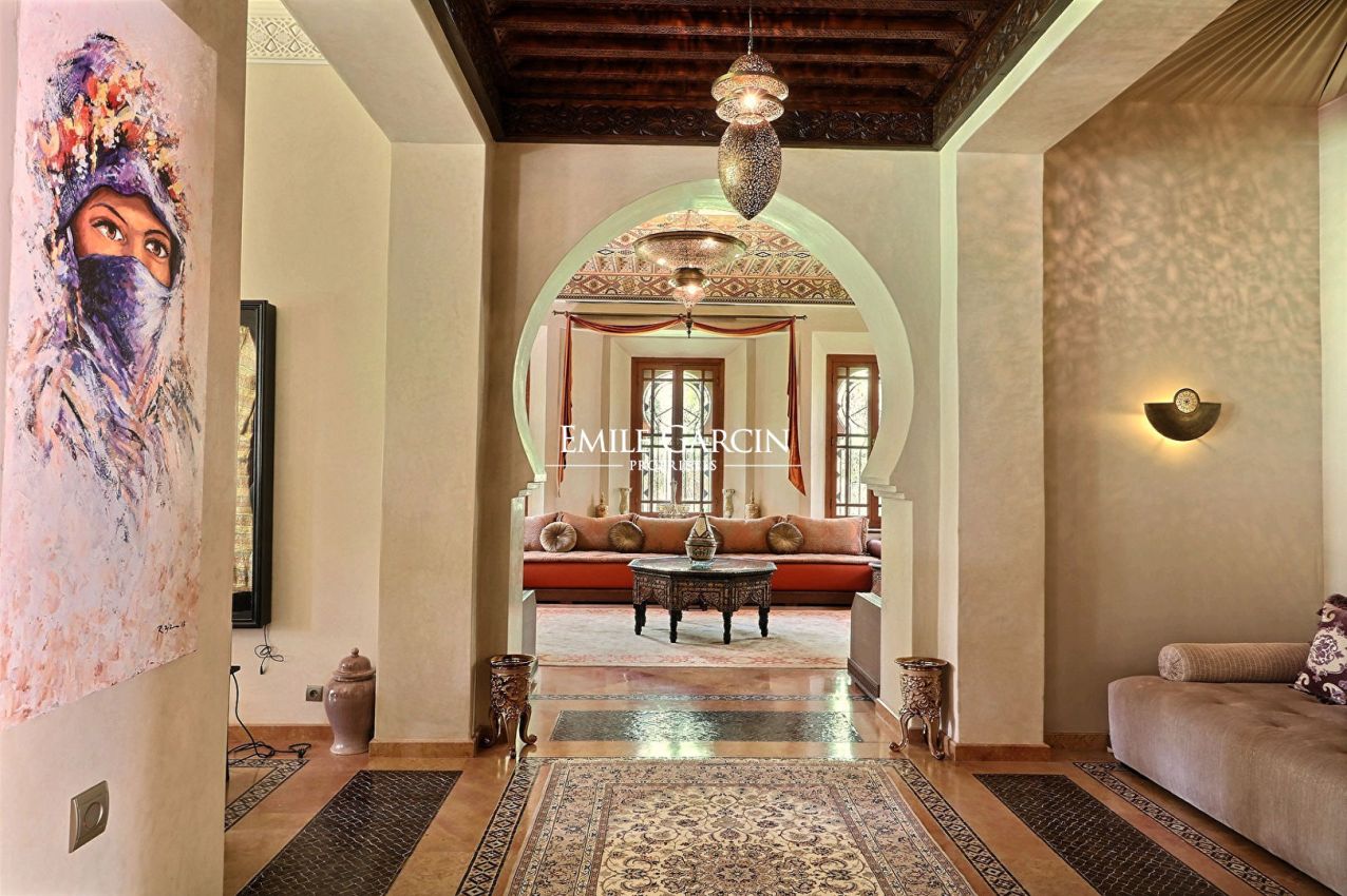 Beautiful property presenting 1000 m² of living space on 1.6 hectares of leafy grounds in the Palmeraie district. The property comprises five bedrooms with ensuite bathrooms, three lounges (including one with a fireplace), a dining room, a fully fitted kitchen and a spa with traditional hammam and massage room. Heated swimming pool and pool house. The property also includes domestic quarters made up of three bedrooms and a bathroom, and the services of a housekeeper and caretaker. From 900 EUR / night