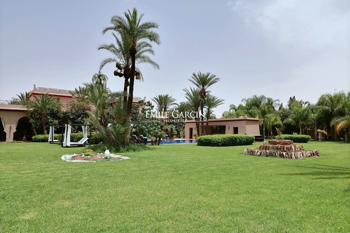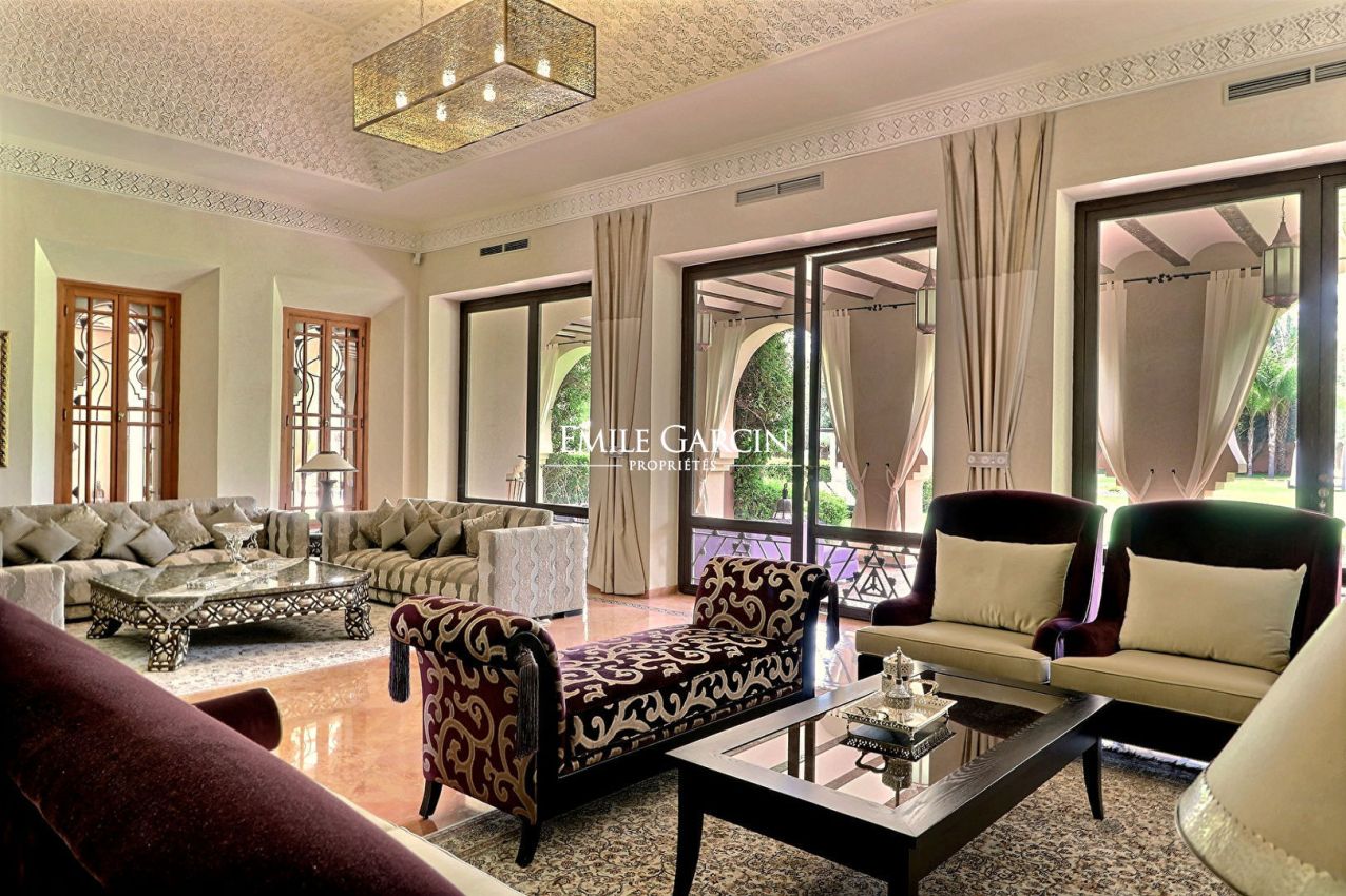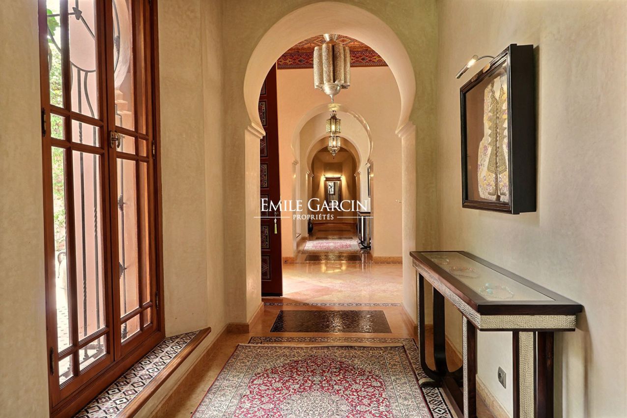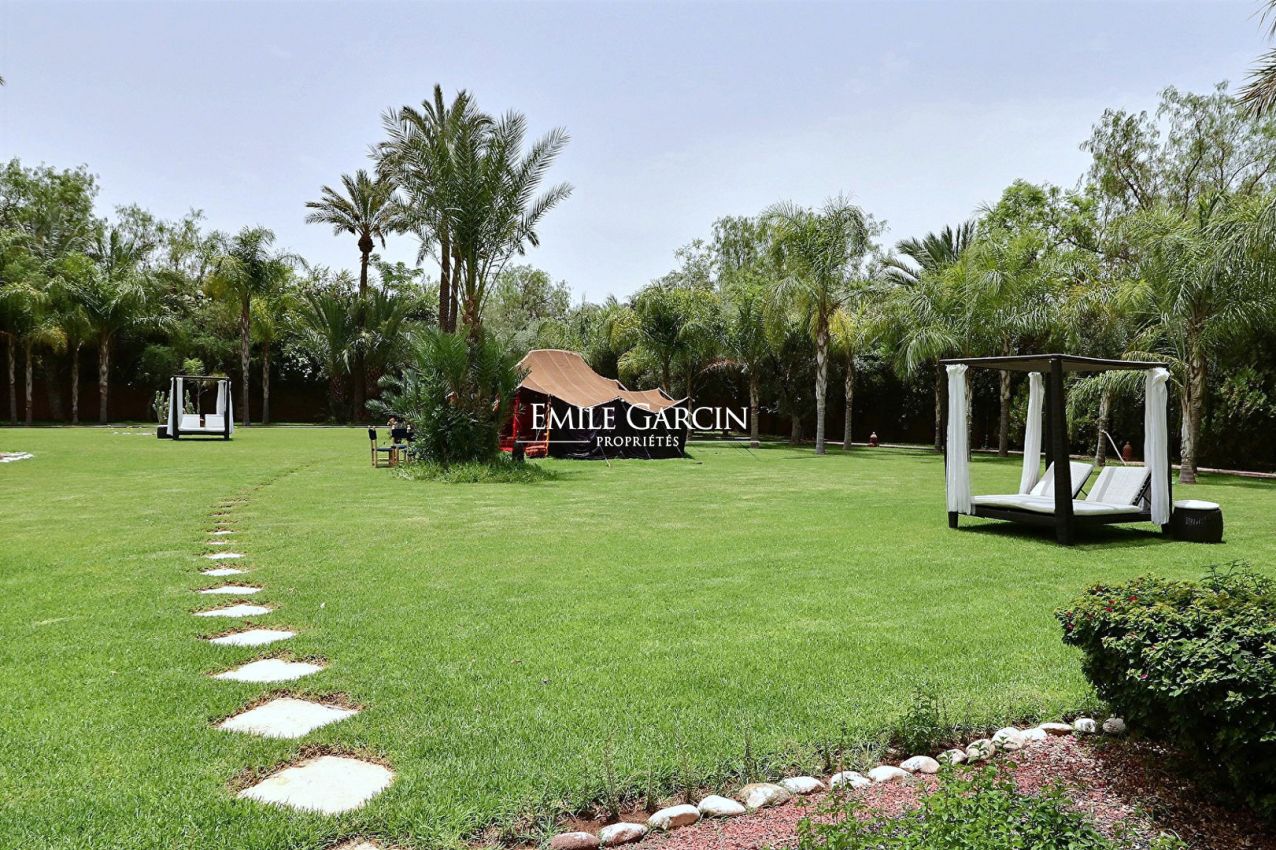 Beautiful property presenting 1000 m² of living space on 1.6 hectares of leafy grounds in the Palmeraie district. The property comprises five bedrooms with ensuite bathrooms, three lounges (including one with a fireplace), a dining room, a fully fitted kitchen and a spa with traditional hammam and massage room. Heated swimming pool and pool house. The property also includes domestic quarters made up of three bedrooms and a bathroom, and the services of a housekeeper and caretaker. From 900 EUR / night