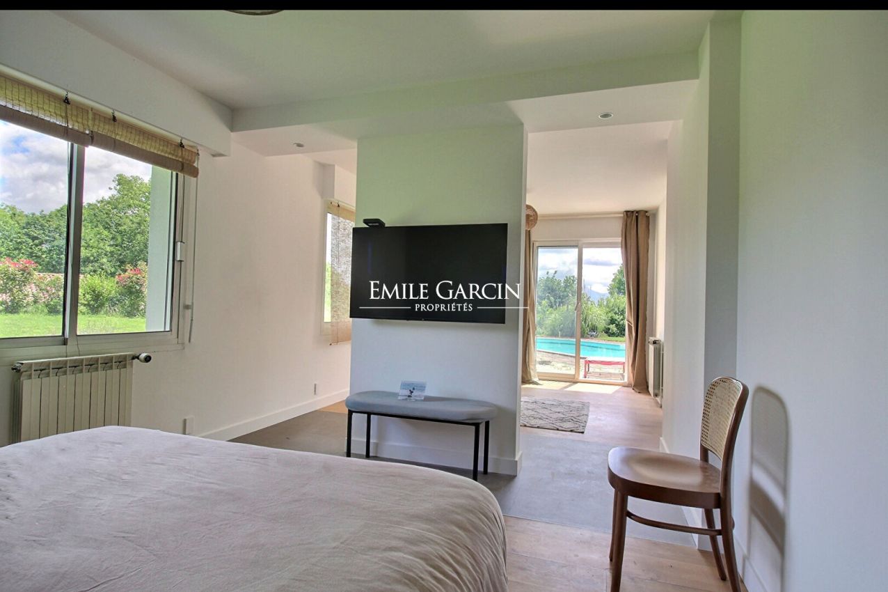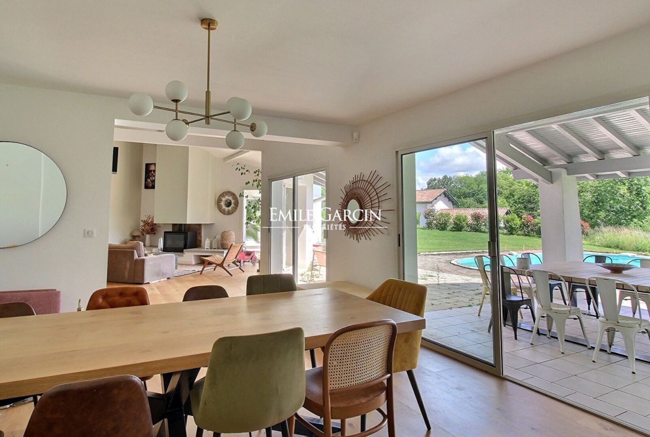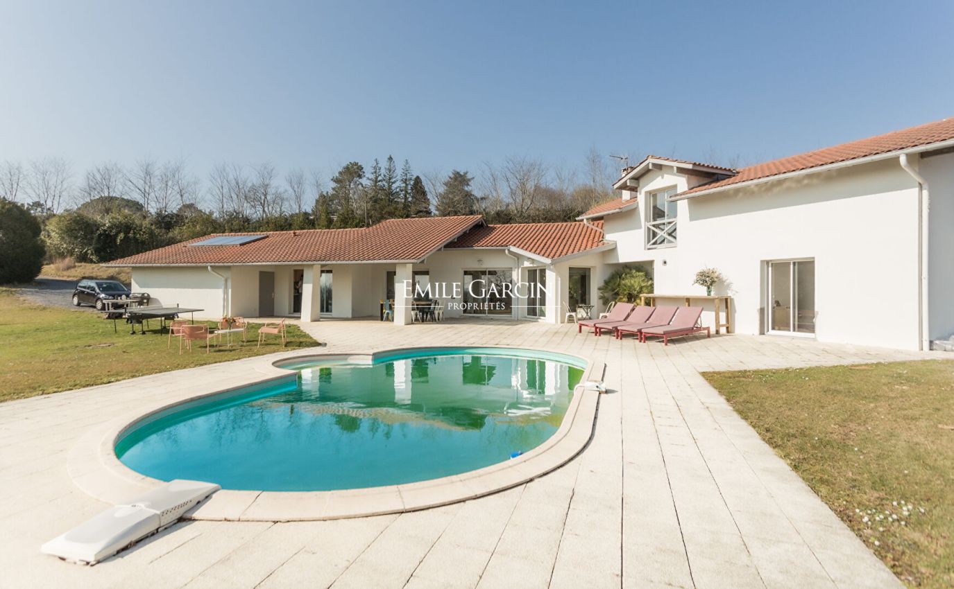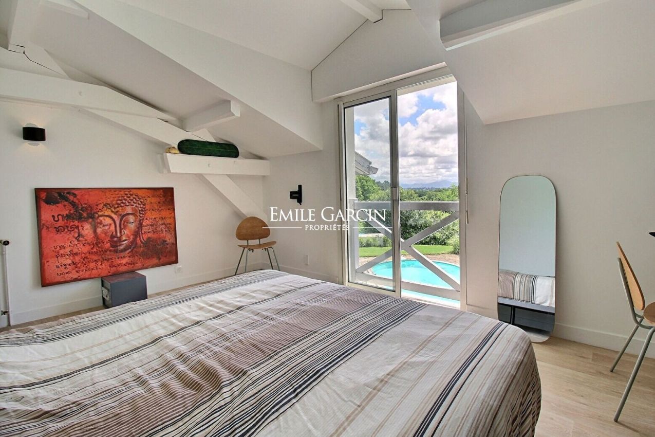 Secluded away in peaceful rural surroundings, this contemporary property with a view of the Larrun and Pyrenees makes for the perfect setting in which to relax on holiday with family or friends. The spacious living rooms (kitchen, dining room and living room) overlook the terrace, garden and swimming pool. There are two bedrooms and a bathroom on the ground floor. Upstairs, you will find another two bedrooms with a bathroom and a shower room. Outdoor games area. Located a stone's throw from the magnificent Arcangues golf course. WIFI. Weekly rates: please contact us directly.